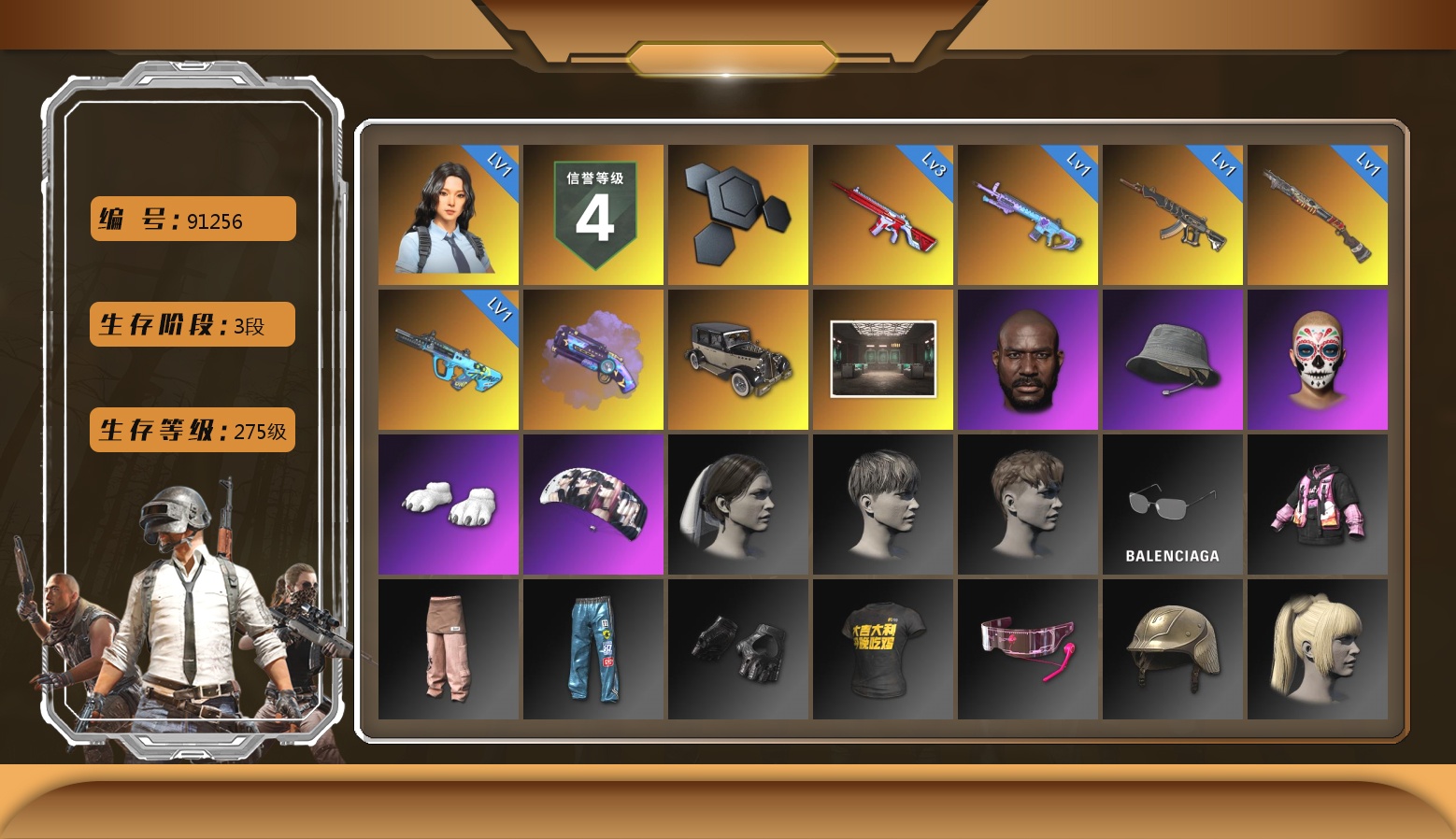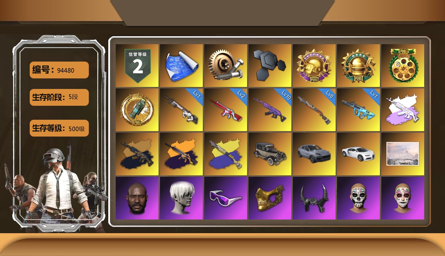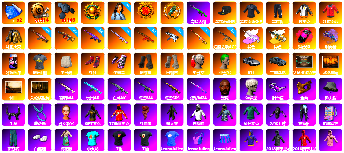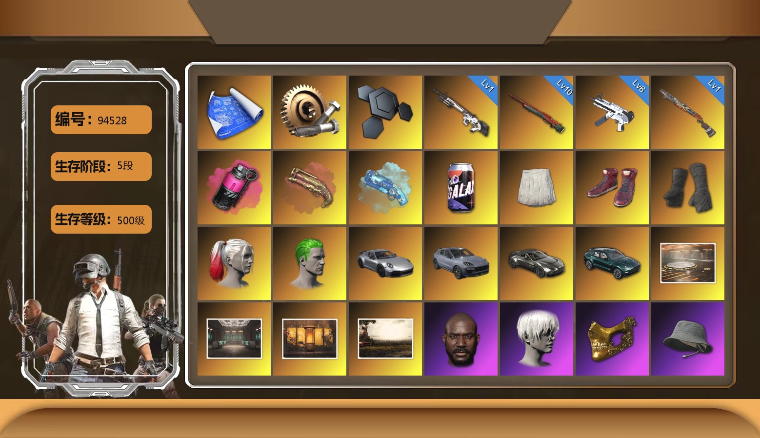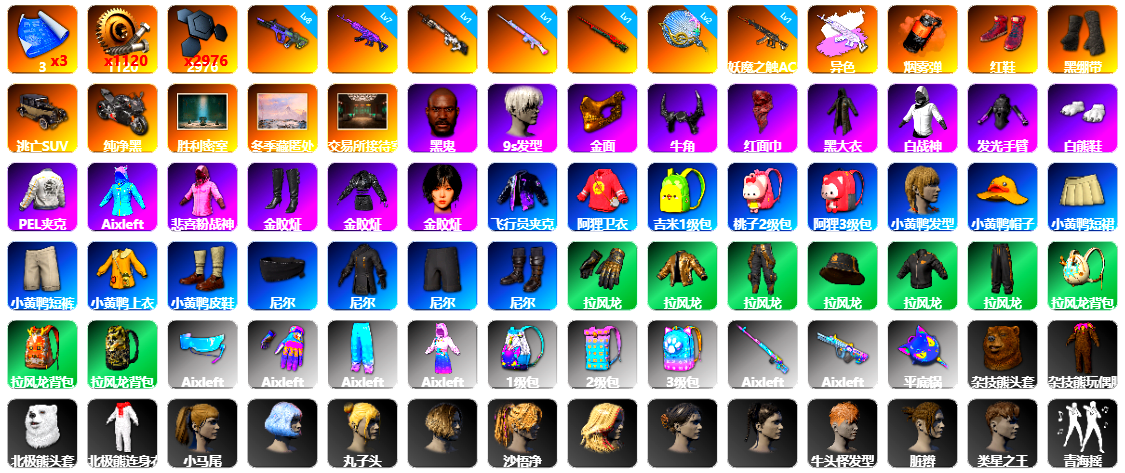 6级德拉贡 3级猪八戒M4 1级GD-AUG 1级夜曲M24 蓝色魔法迷雾-M79 12753聚合物 保时捷911 布加迪跑车 黑鬼 滑雪镜 金面 白战神 发光手臂 白熊鞋 小马尾 脏辫 青海摇 车漆 小兔学院 绷带AK