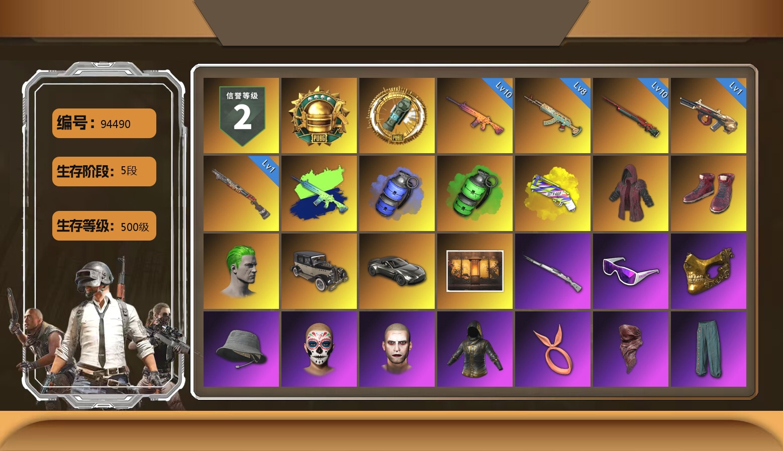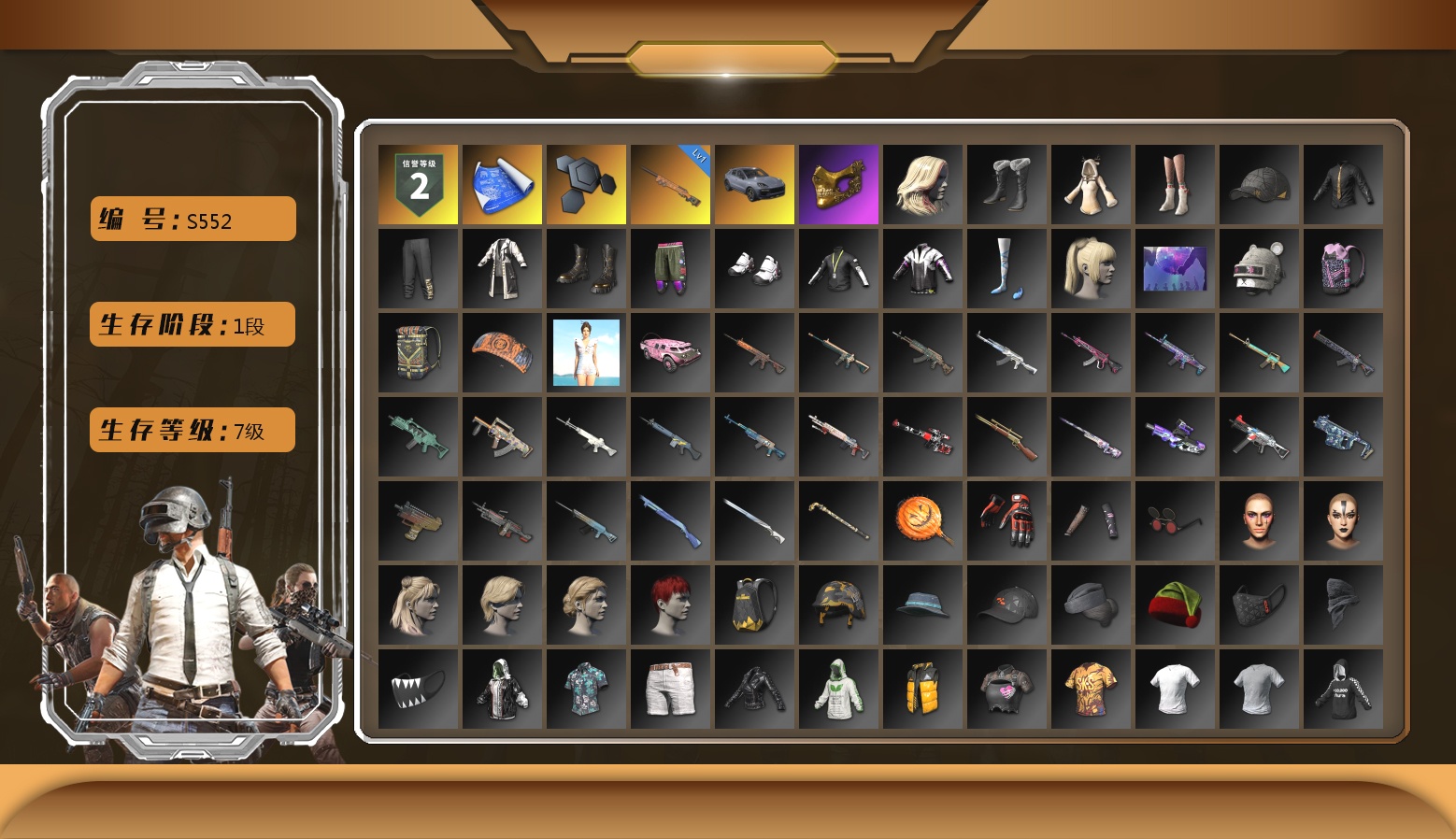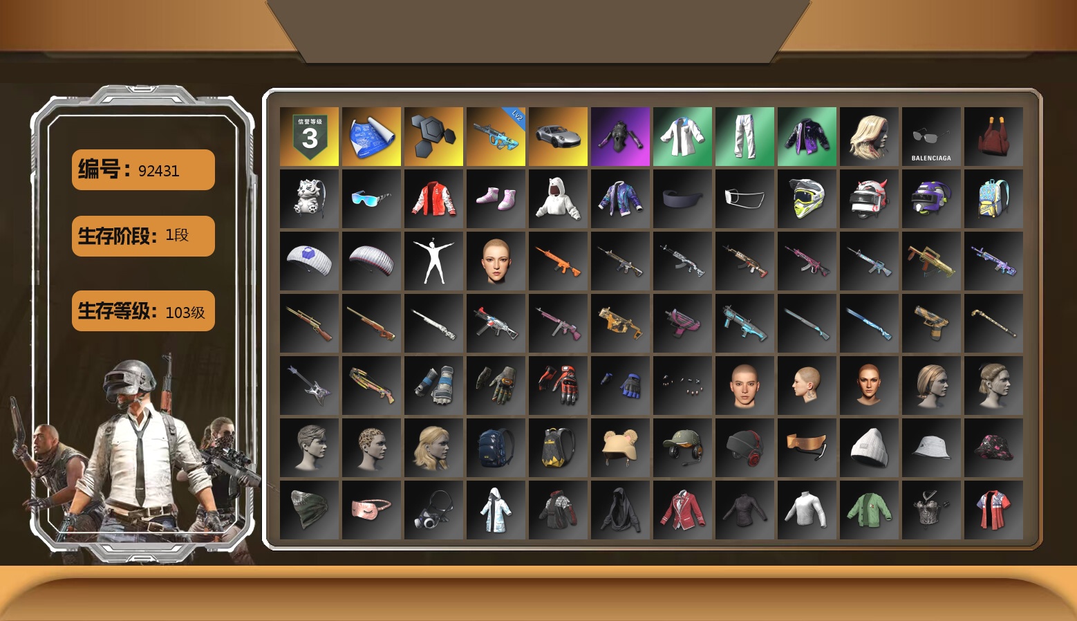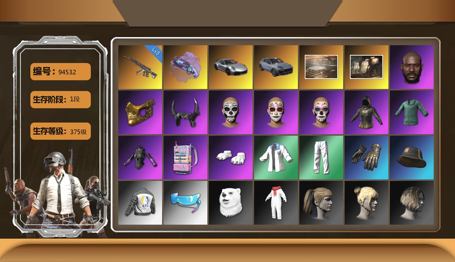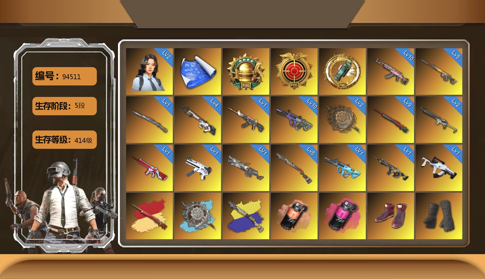 6级德拉贡 3级猪八戒M4 1级GD-AUG 1级夜曲M24 蓝色魔法迷雾-M79 12753聚合物 保时捷911 布加迪跑车 黑鬼 滑雪镜 金面 白战神 发光手臂 白熊鞋 小马尾 脏辫 青海摇 车漆 小兔学院 绷带AK