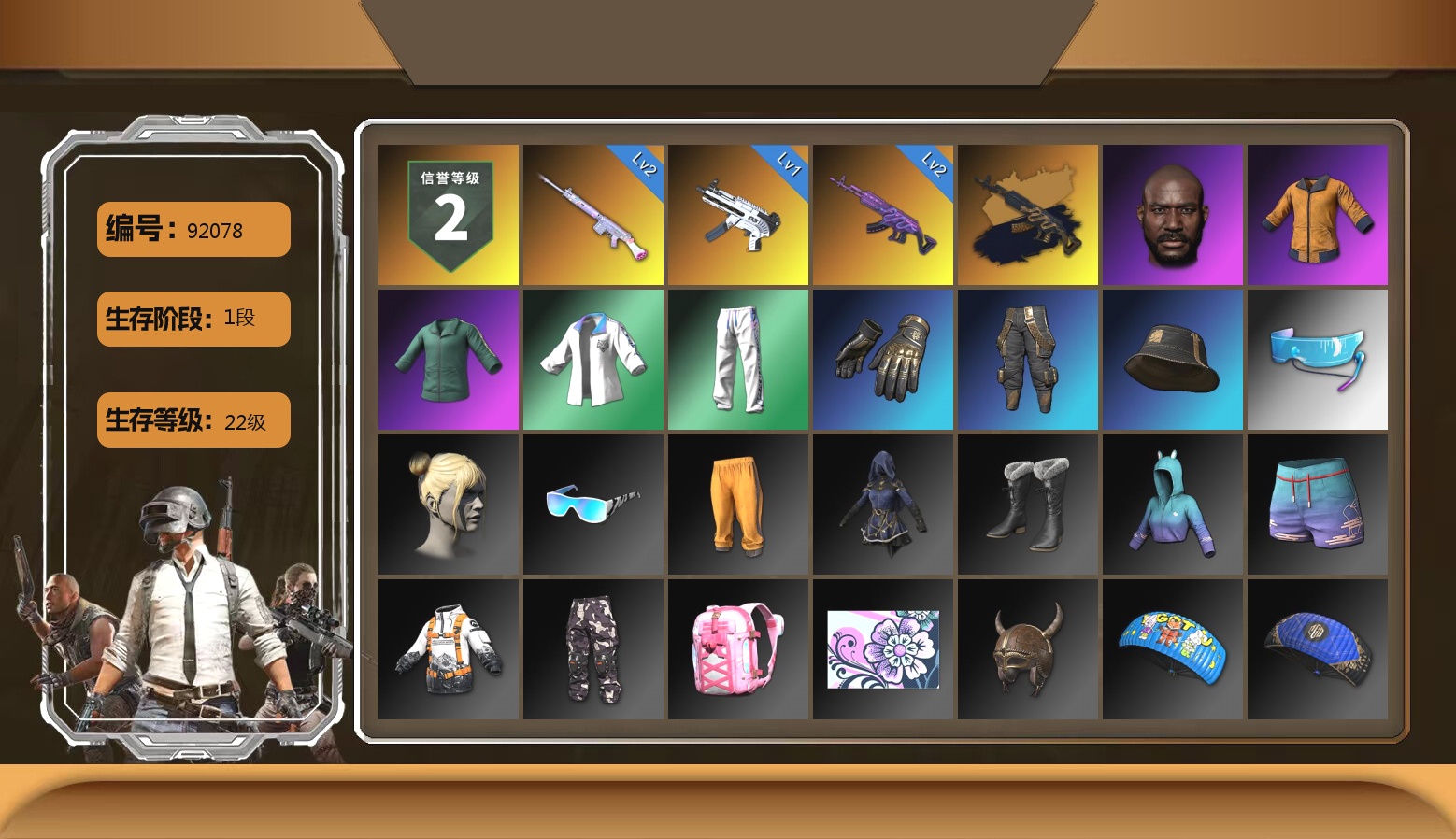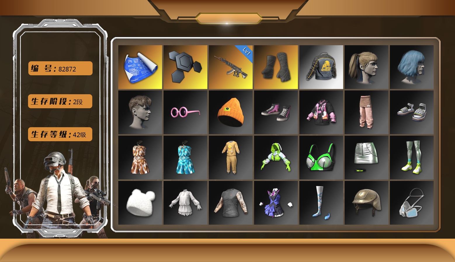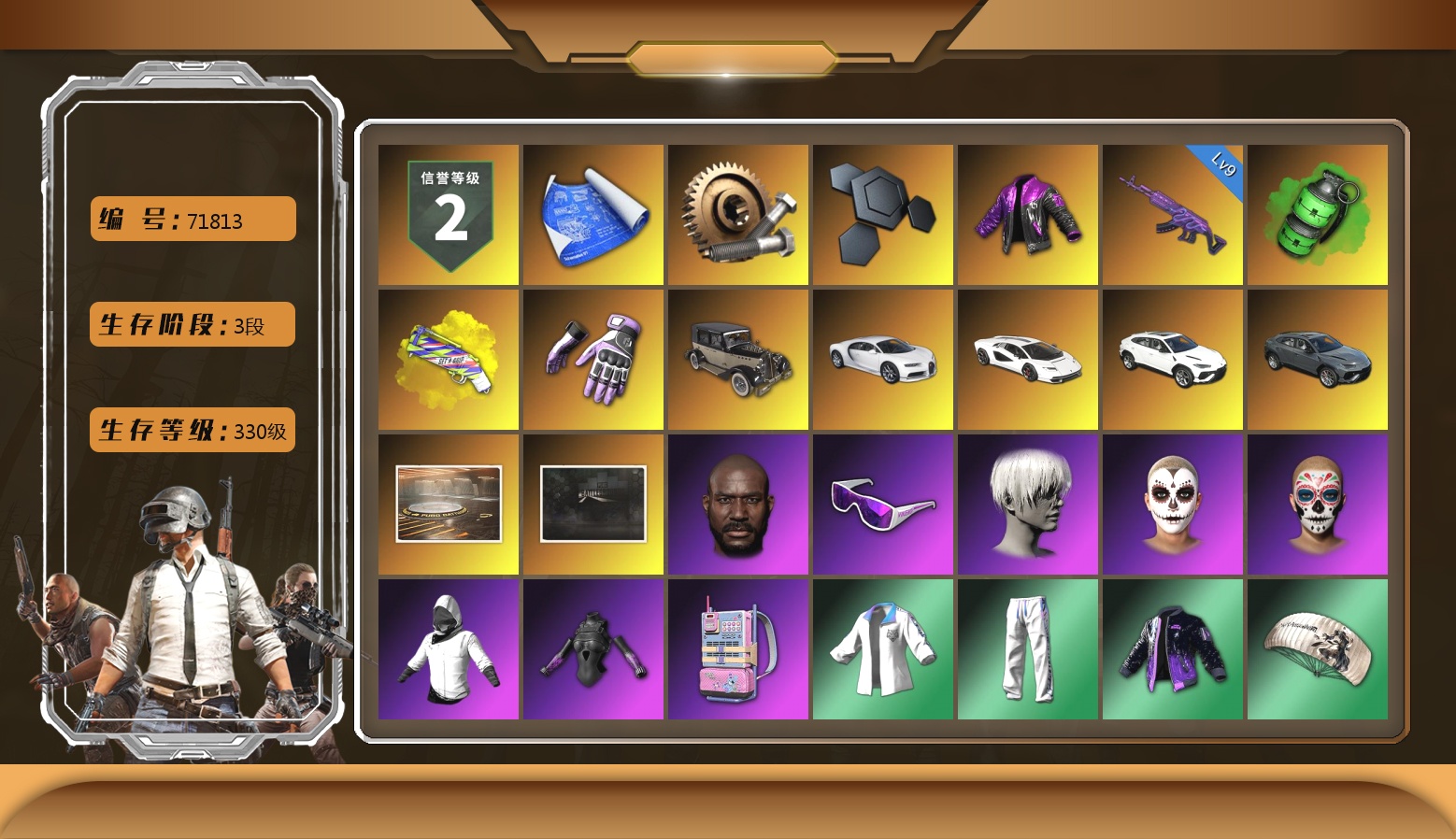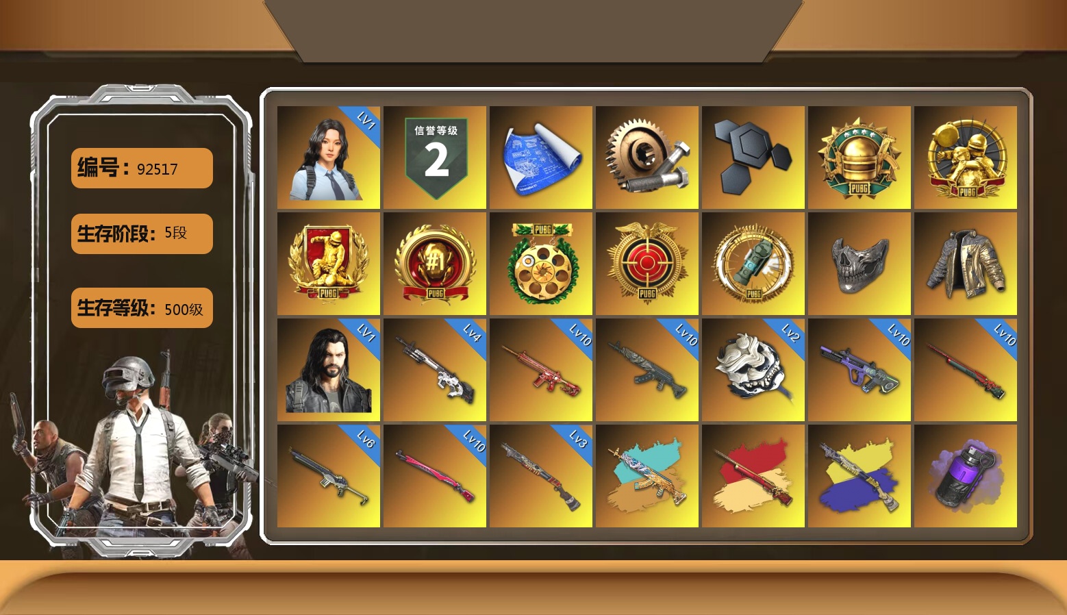 6级德拉贡 3级猪八戒M4 1级GD-AUG 1级夜曲M24 蓝色魔法迷雾-M79 12753聚合物 保时捷911 布加迪跑车 黑鬼 滑雪镜 金面 白战神 发光手臂 白熊鞋 小马尾 脏辫 青海摇 车漆 小兔学院 绷带AK