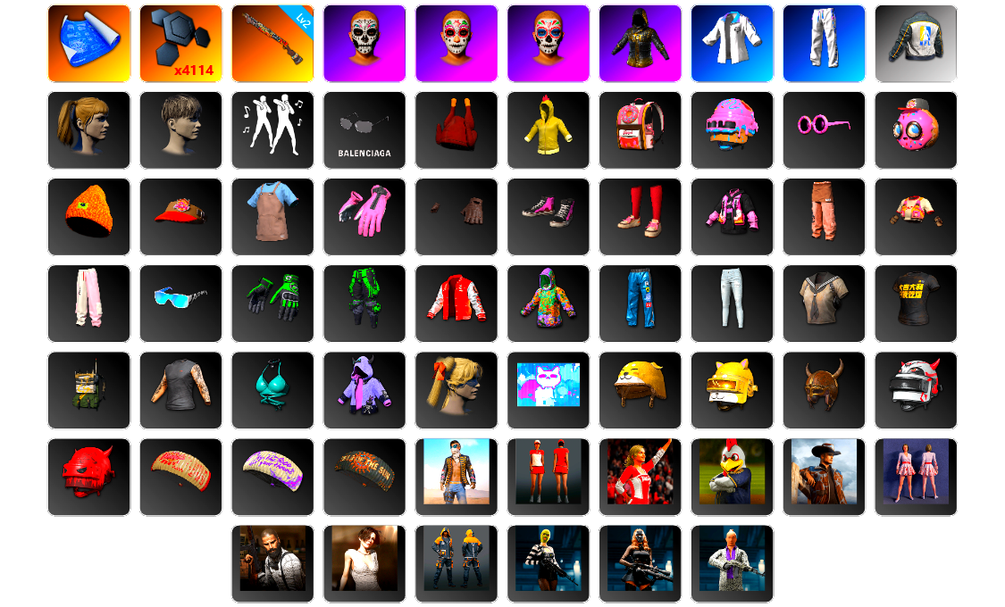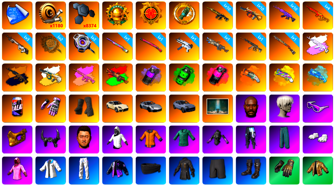 8张图纸 蜗牛币 12356聚合物 10级孙悟空M24 6级无重力MP5K 1级赛博MK12 1级烈日灼烧-S1897 品红色烟雾弹 深红狂怒之雾-M79 蓝色魔法迷雾-M79 小白裙 柏林鞋 黑绷带 小丑女 小丑男 保时捷911 保时捷卡宴 马丁跑车 马丁SUV 陈列室 交易所接待室 武器神龛 黑鬼 9s发型 金面 渔夫帽 牛角 丑男妆容 橙色发带 红面巾 黑大衣 小战神 活动绿东 发光手臂 萨芬裤 白熊鞋 粉战神 aespa女团 阿狸 小黄鸭 尼尔 车漆 丸子头 小兔学院 悲喜 绷带AK 枪炮洗礼