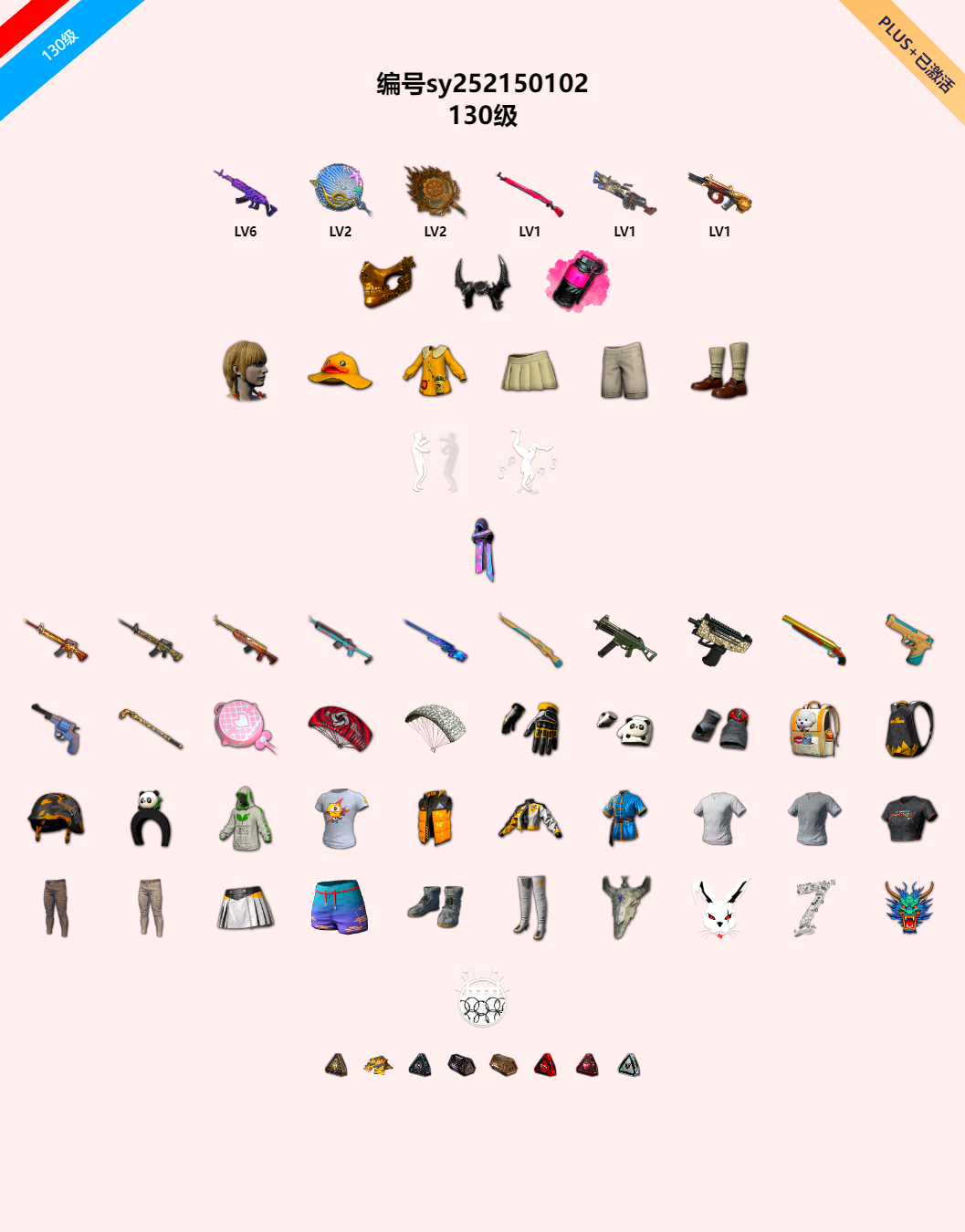 6级美杜莎762 2级塞壬平底锅 2级唐三藏平底锅 1级午夜惊魂98k 1级刻耳柏洛斯M249 1级弥诺陶洛斯AUG 牛角 金面 品红色烟雾弹 小黄鸭