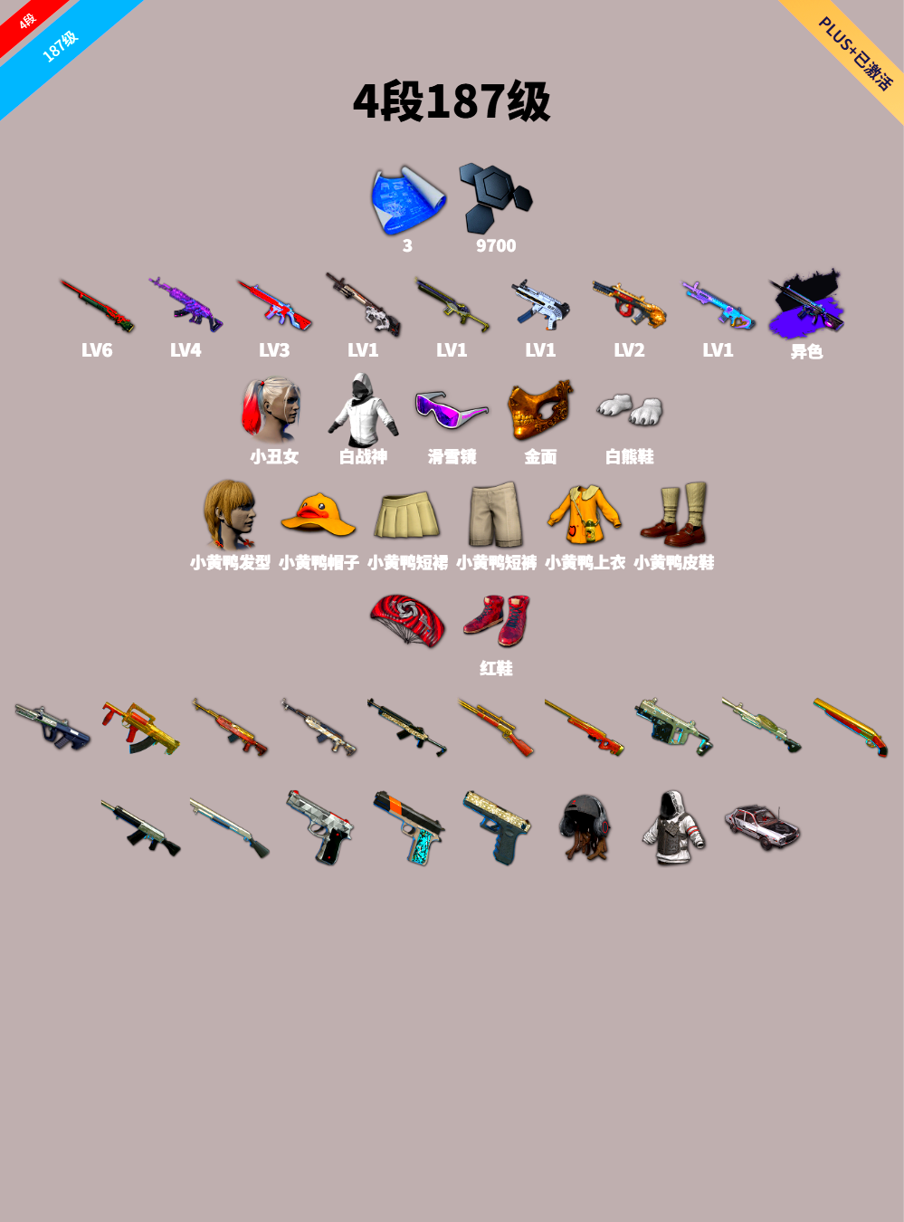 3张图纸 9700聚合物 6级孙悟空M24 4级美杜莎762 3级无信号M4 1级赛博MK12 1级沙悟净MINI 1级无重力MP5K 2级弥诺陶洛斯AUG 1级魔咒之力Mk12 无信号M4(异色) 小丑女 滑雪镜 金面 柏林鞋 白战神 白熊鞋 小黄鸭