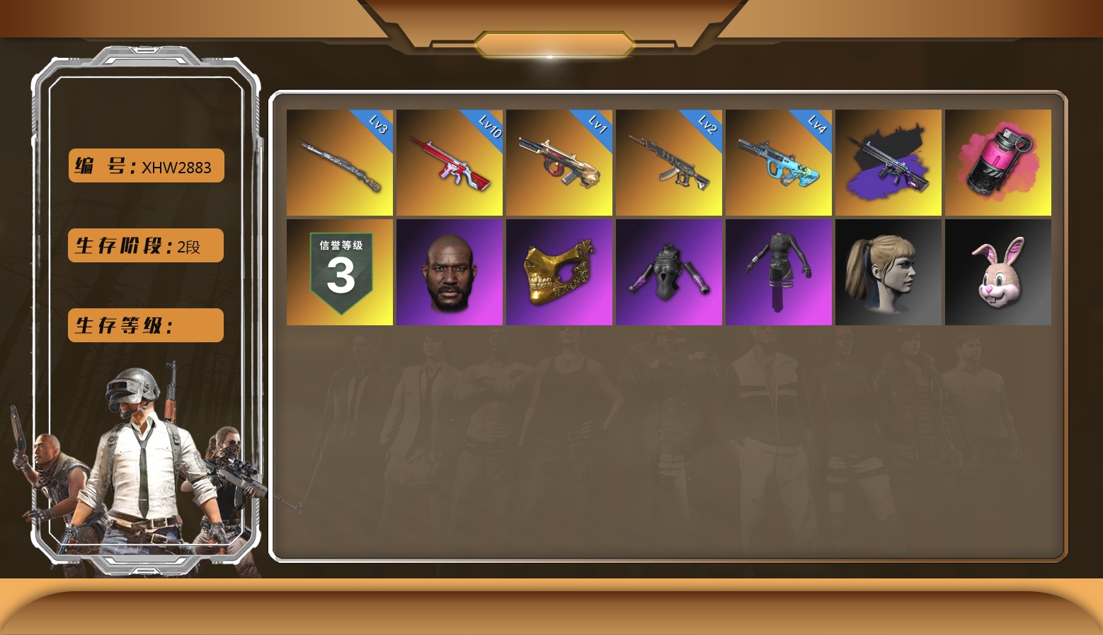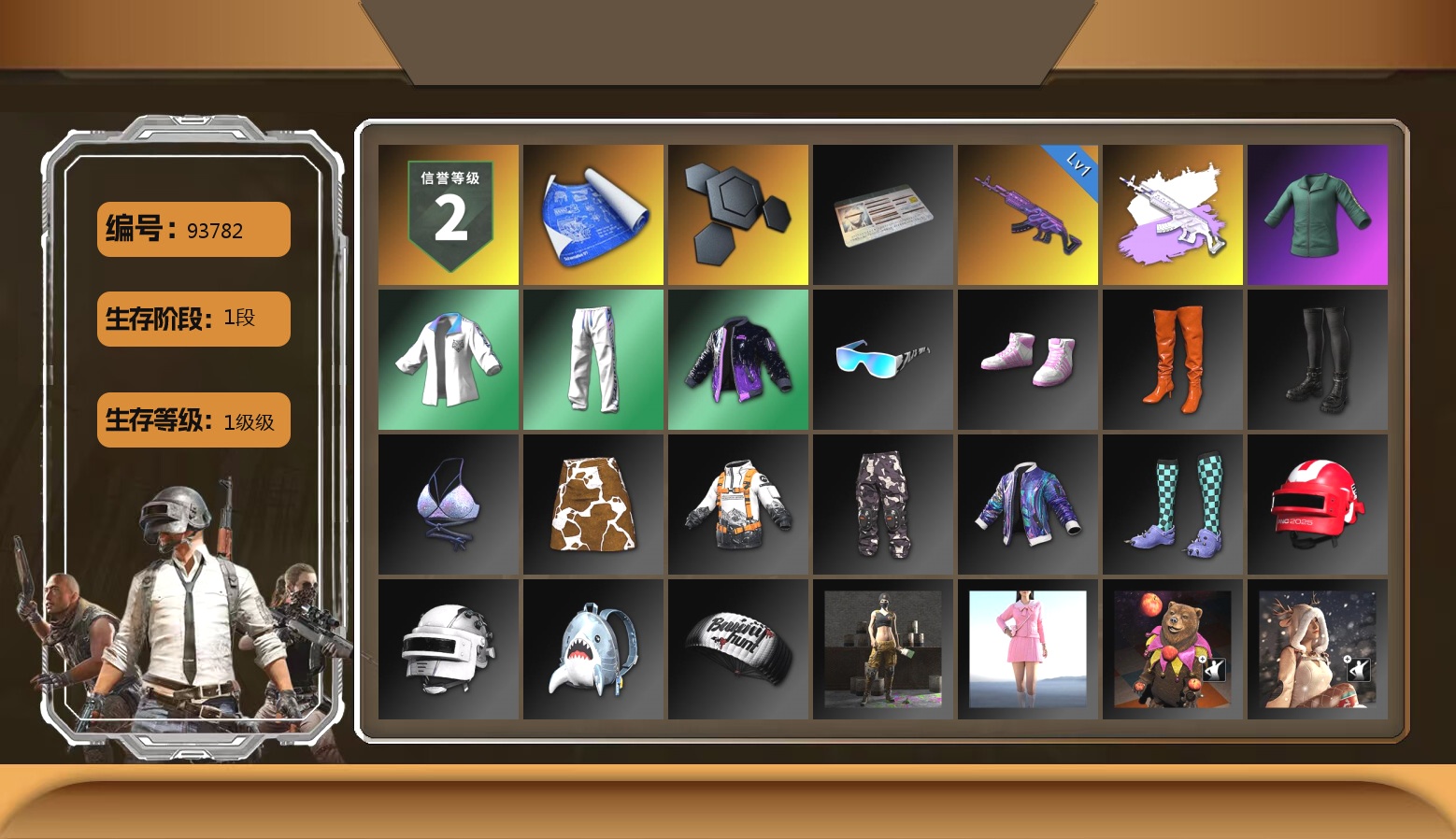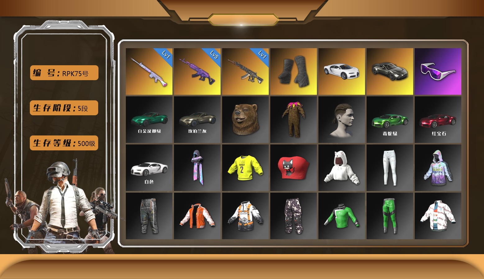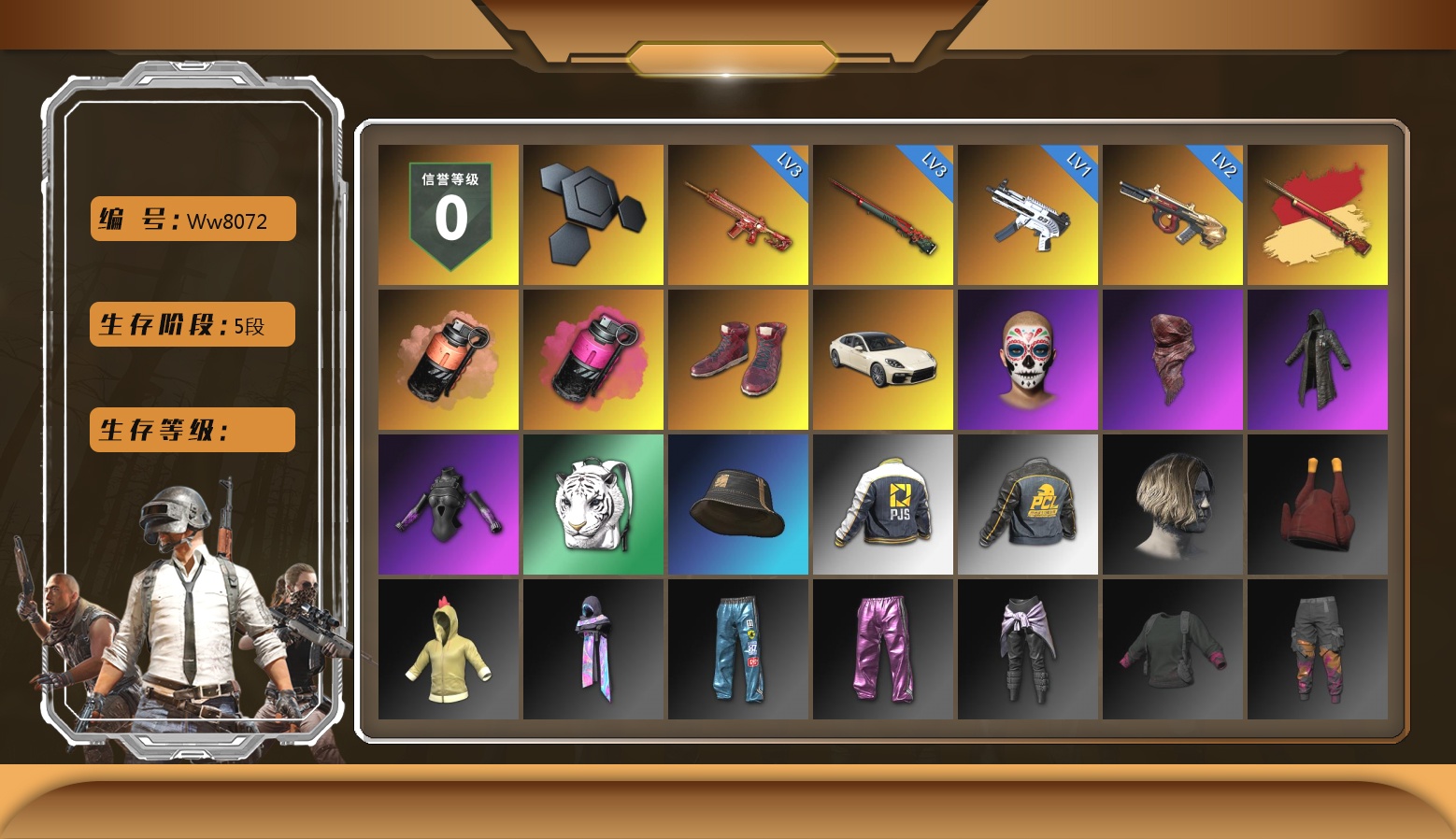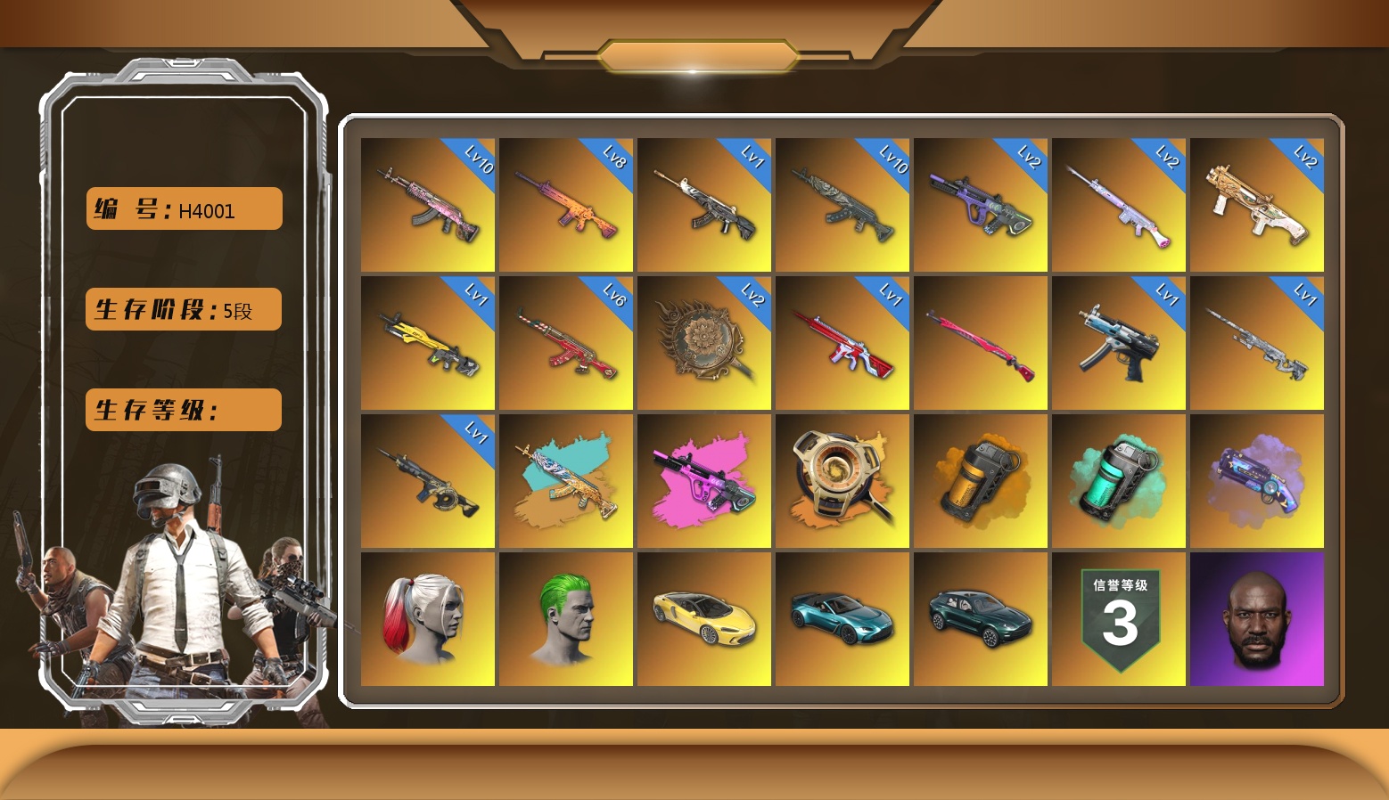 5阶段 信誉3 阿斯顿马丁 10级火麒麟 8级南瓜 10级金龙 1级幽影残魂 6级圣诞AK 2级玩偶炮 2级dbs 2级霓虹 1级恶魔 1级无信号 1级时空使者 1级午夜惊魂98k 1级小兔MK12 1级寒蚀 2级唐三藏 霓虹异色 虚空使者异色 烟雾弹 烟枪 活动绿东 悲喜手套 粉战神 悲喜裤 红鞋 小丑女 小丑男 滑雪镜 金面 黑鬼 丸子头 小战神 发光手臂