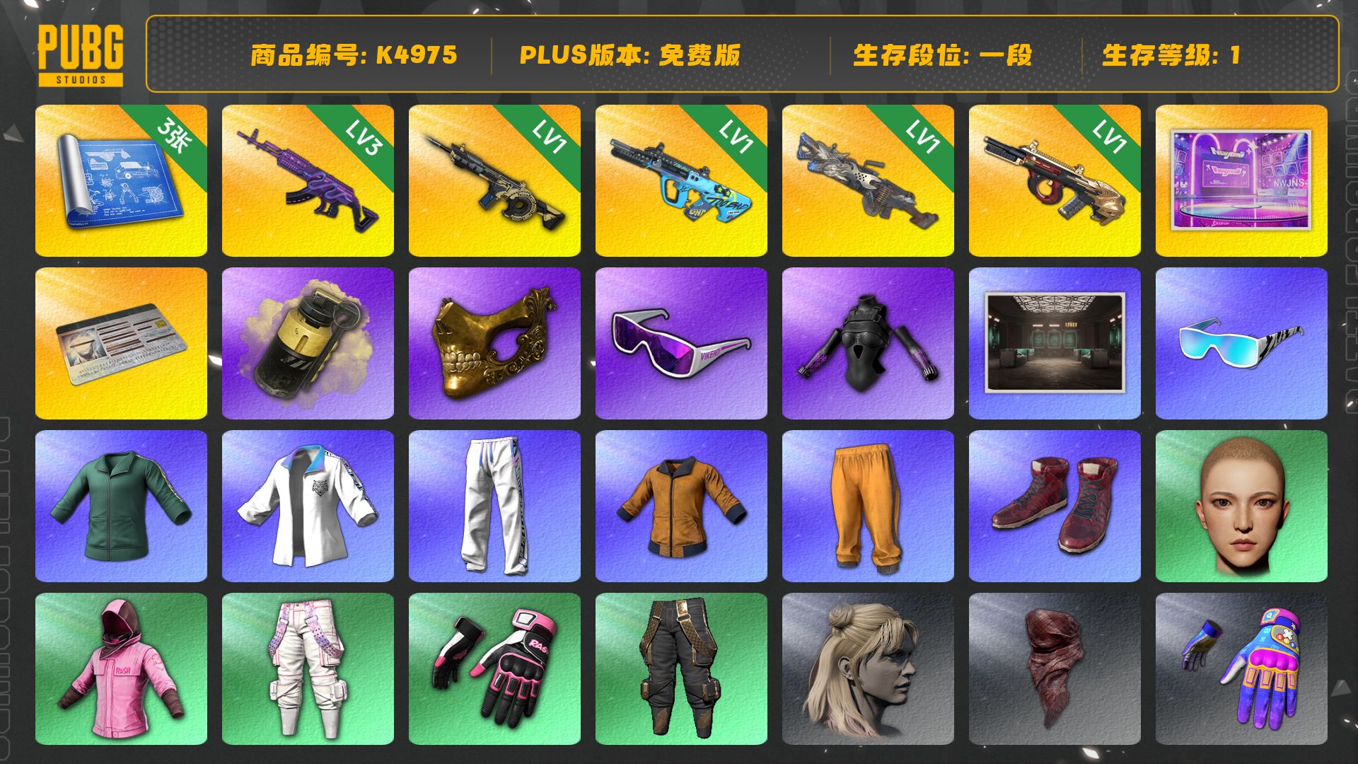 [K4975]1段1级,信誉2,3级美杜莎762,1级时空使者M416,1级权志龙AUG,1级弥诺陶洛斯AUG,1级刻耳柏洛斯M249,女团大厅,黄色烟雾弹,发光手臂,金面,烟雾弹,滑雪镜,拉风龙套装,小绿东,小叮当套装,星魂虎虎生威大礼包,黄东