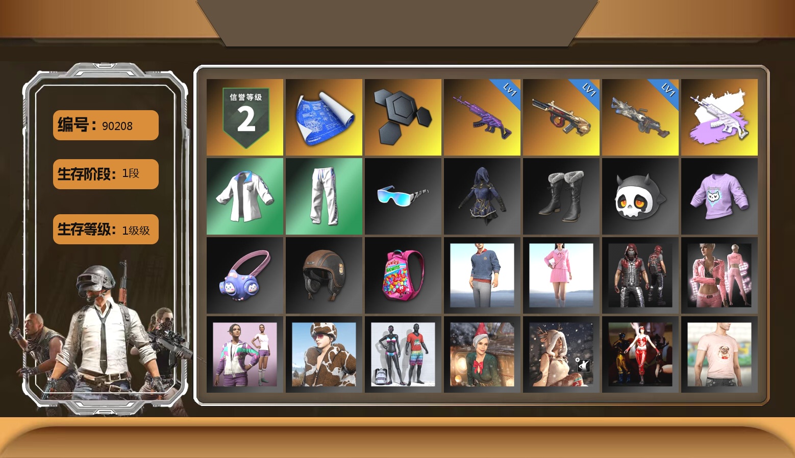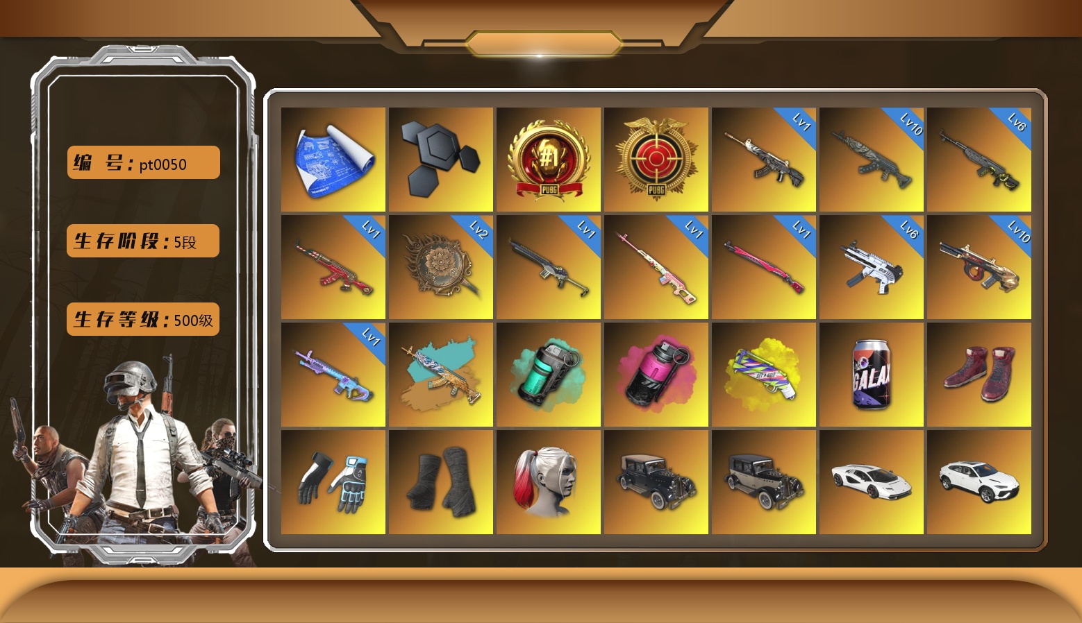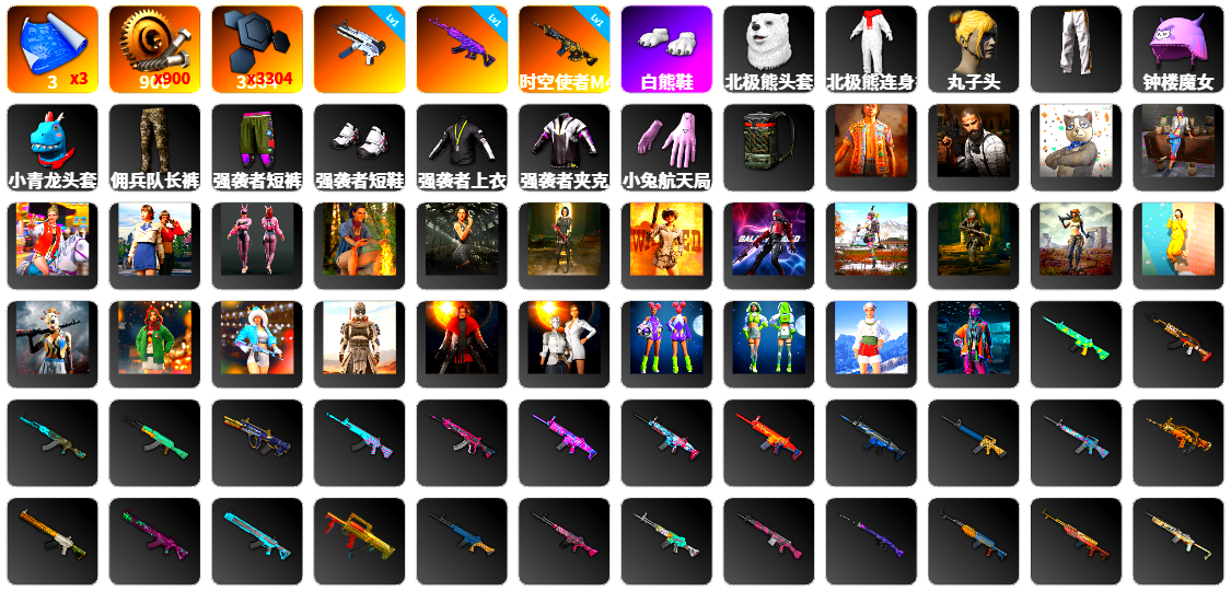 10级孙悟空M24 10级妖魔之触ACE 6级时光加农SKS 4级美杜莎762 3级塞壬平底锅 1级烈日灼烧-S1897 美杜莎(异色) 妖魔之触(异色) 蓝色烟雾弹 品红色烟雾弹 橙色狂怒之雾-M79 柏林鞋 帕拉梅拉 保时捷卡宴 布加迪跑车 胜利密室 6张图纸 2246聚合物 黑鬼 滑雪镜 金面 红面巾 黑大衣 白战神 活动绿东 发光手臂 白熊鞋 拉风龙 小马尾 西游记 脏辫 车漆 小兔学院
