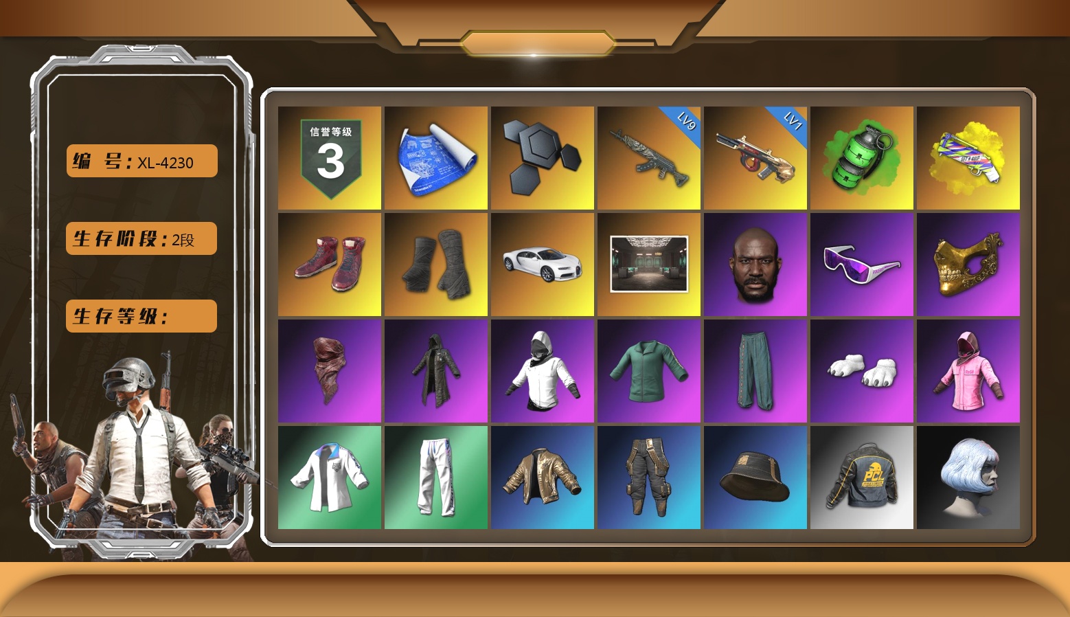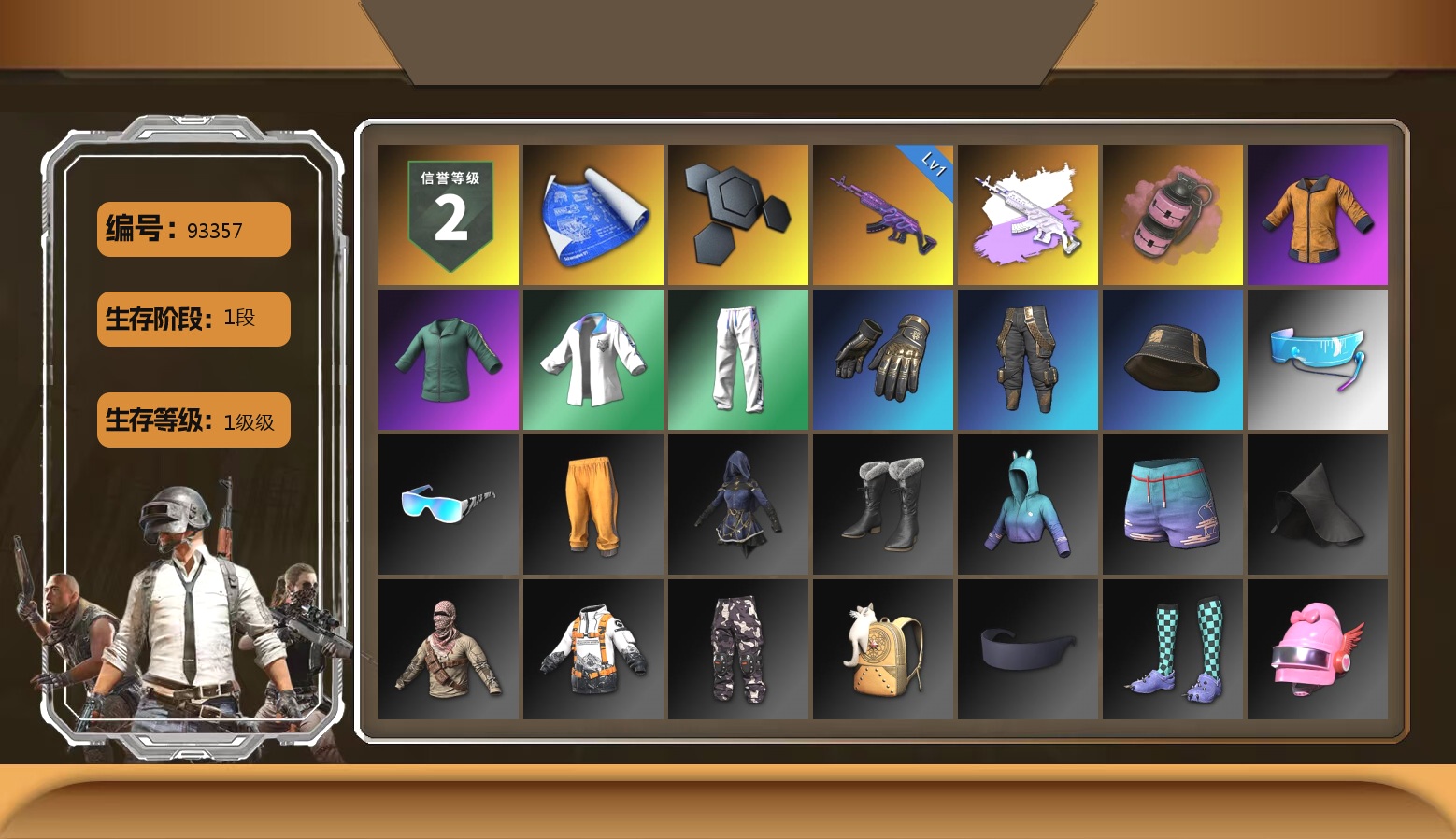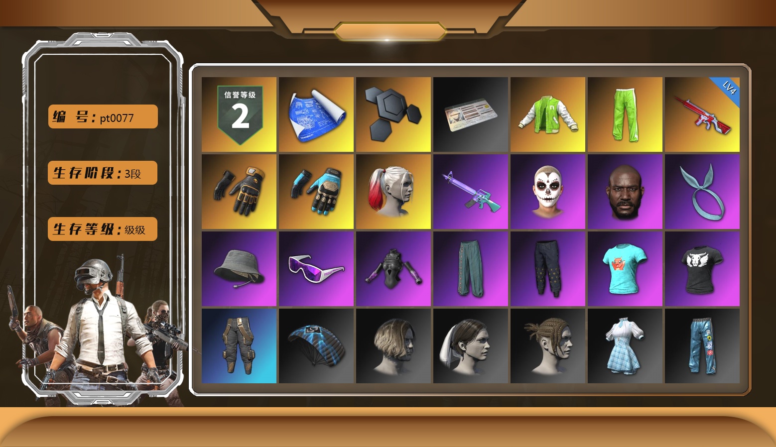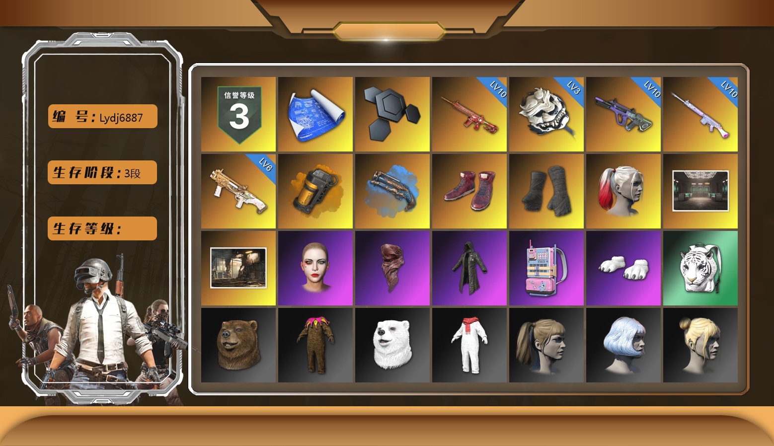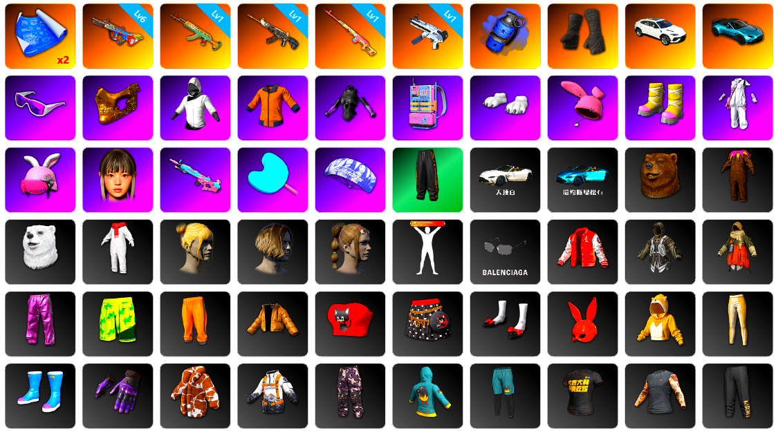 10级朱雀M4 10级霓虹AUG 10级玩偶炮 6级DBS 3级白虎锅 橘色烟雾弹 湛蓝狂怒之雾-M79 柏林鞋 黑绷带 小丑女 交易所接待室 1张图纸 2034聚合物 红面巾 黑大衣 电磁背包 白熊鞋 小马尾 丸子头 脏辫 新女团 小兔学院 绷带AK PGC 2021套装 胜利之舞39