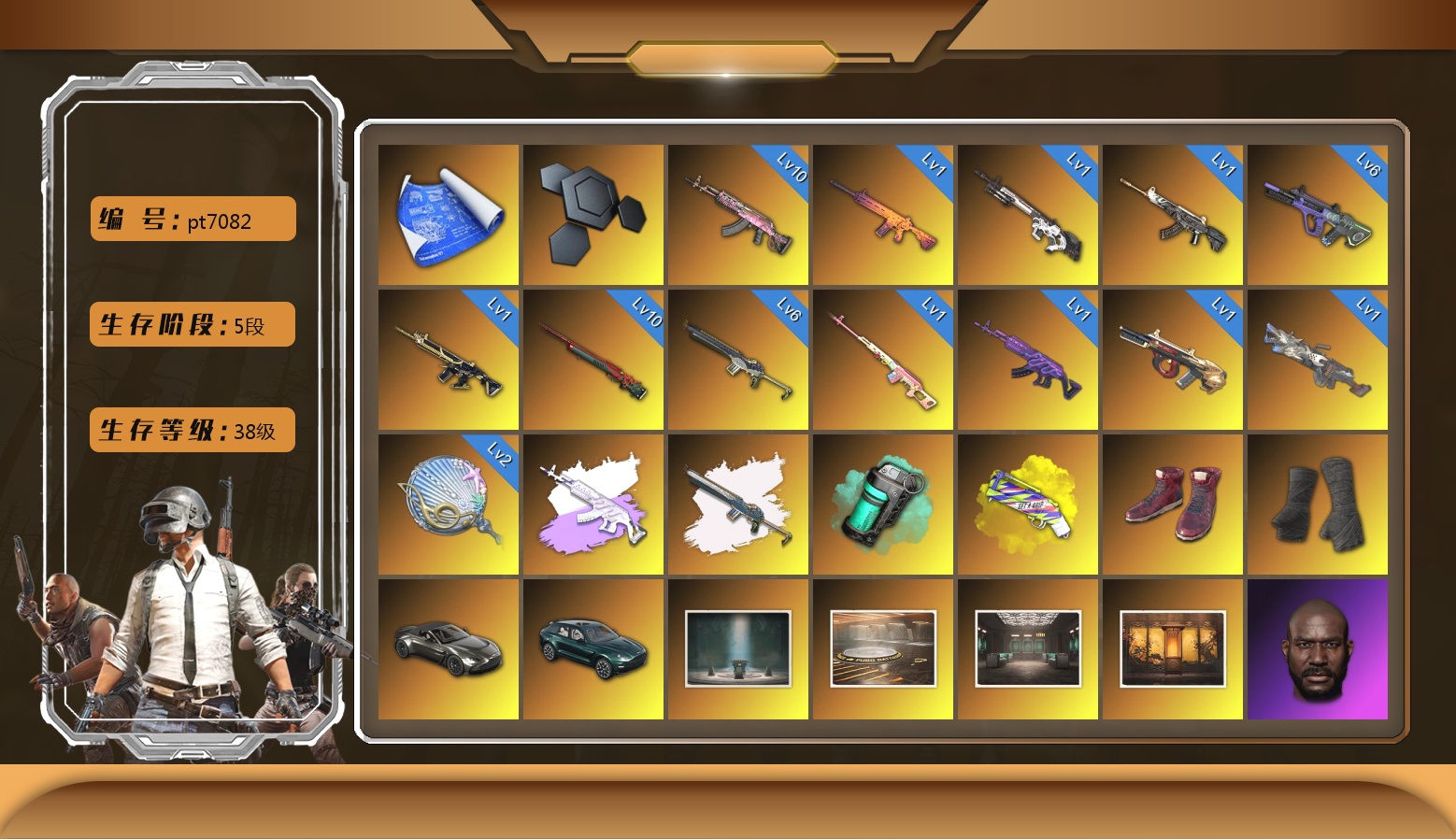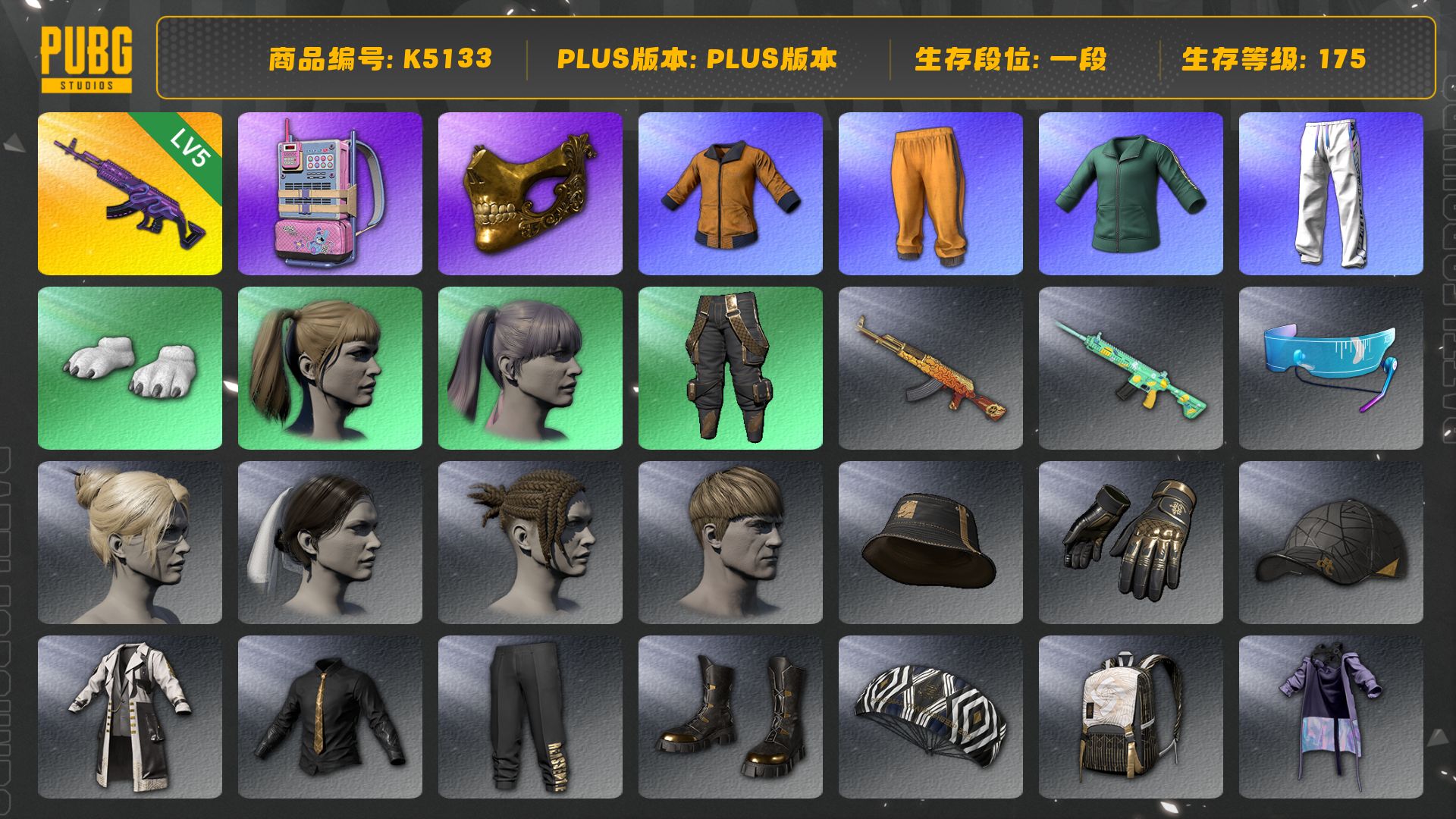 9级青龙762 8级朱雀M4 4级水麒麟 4级恶魔ACE 3级彩虹M24 紫色烟雾弹 小黑盒 迈凯伦硅质白版 5712聚合物 滑雪镜 金面 发光手臂 小黄鸭 车漆 小马尾 小绿头 丸子头 脏辫 悲喜 枪炮洗礼