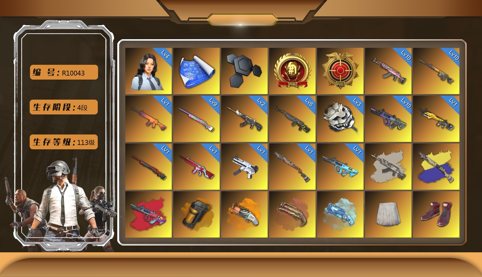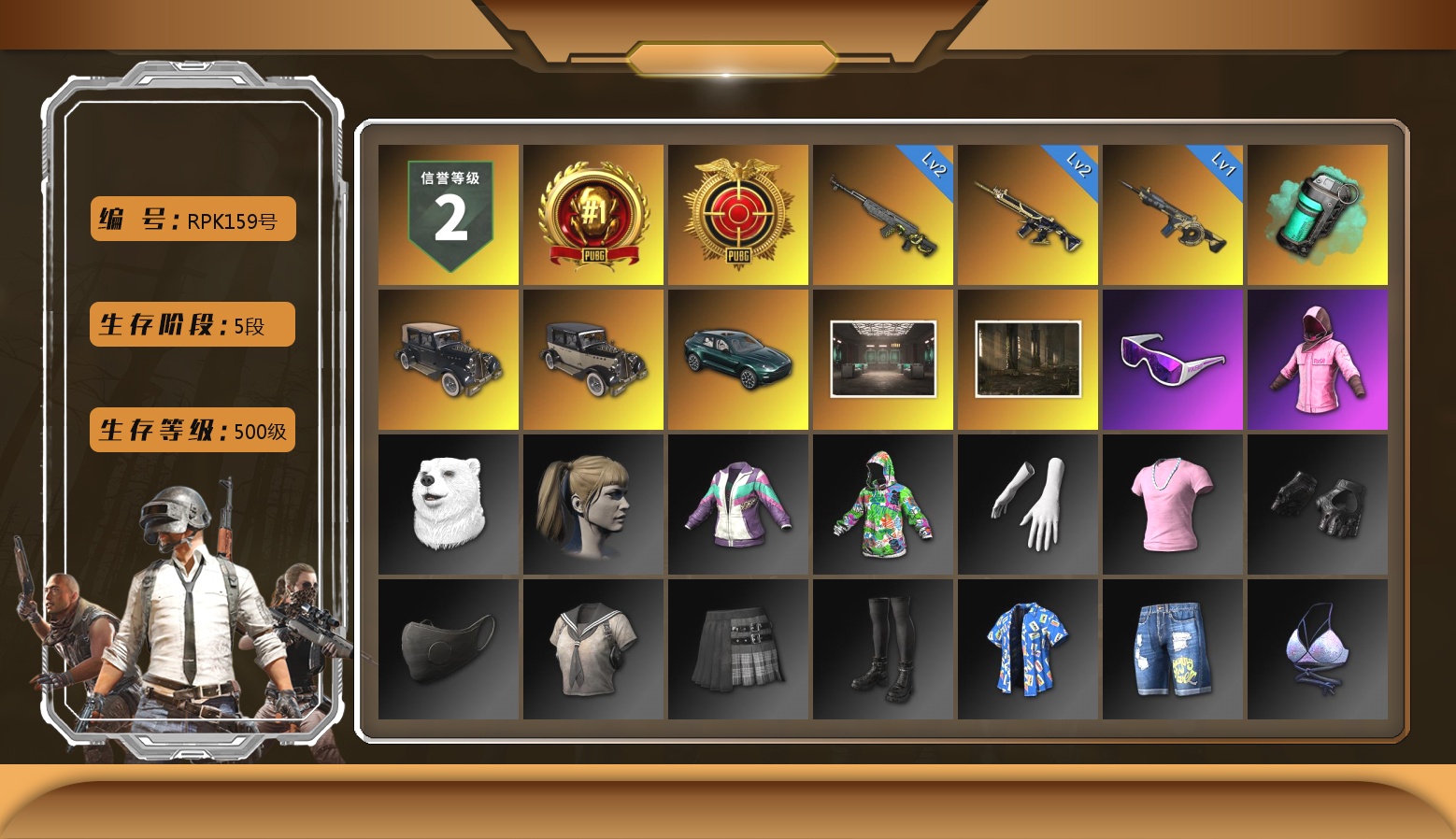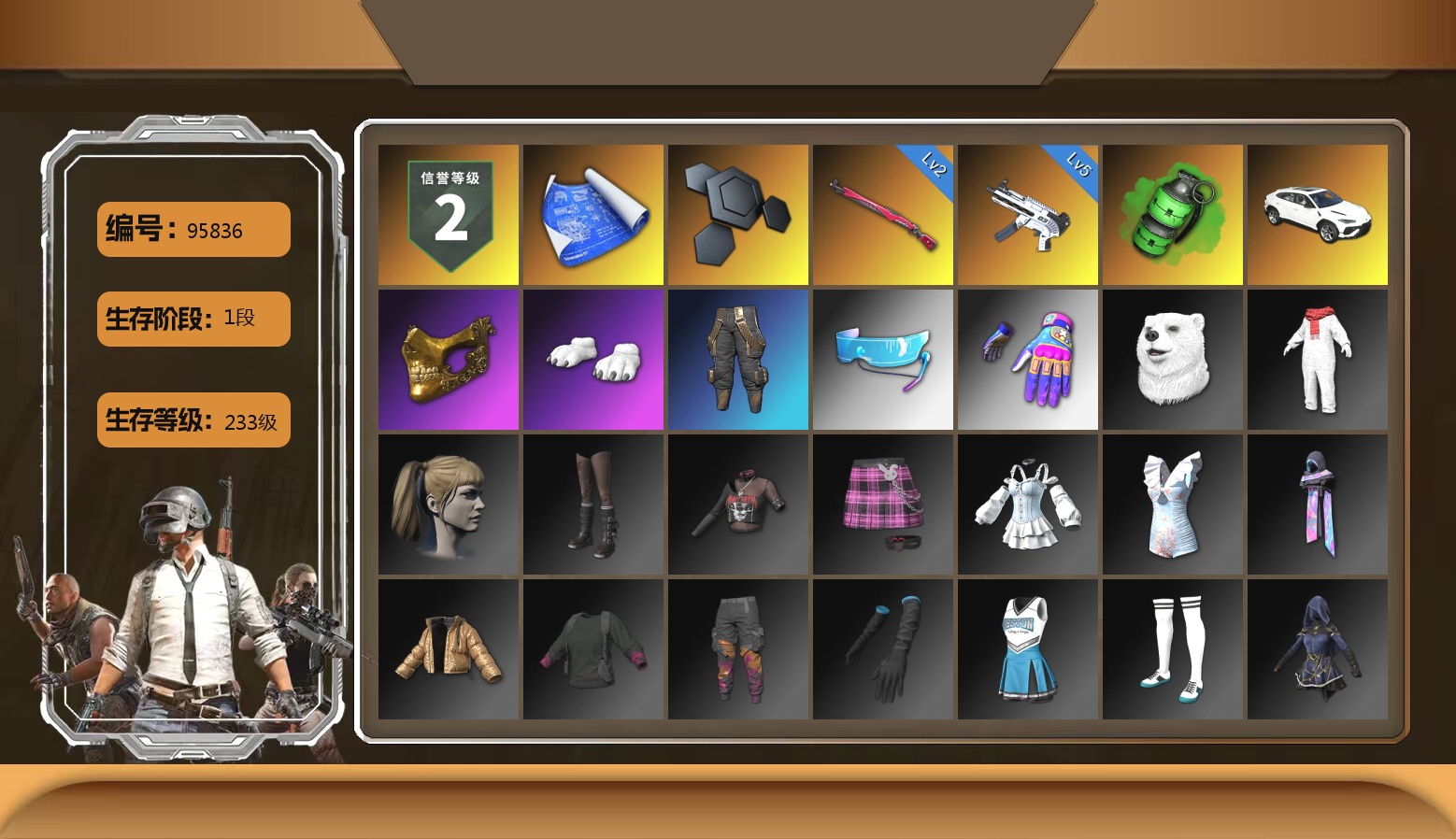 2级猪八戒M4 2级玄武SKS 1级时空使者M4 青色烟雾弹 马丁SUV 交易所接待室 滑雪镜 粉战神 小马尾 小兔学院 悲喜 绷带AK 滑雪帽