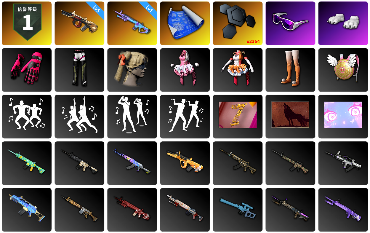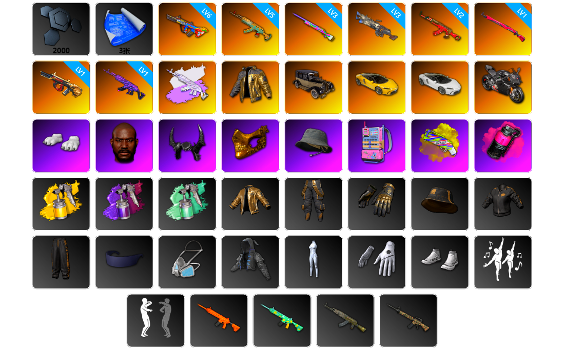5级无重力MP5K 2级午夜惊魂98K 翡翠色烟雾弹 5张图纸 1878聚合物 兰博基尼SUV 金面 白熊鞋 拉风龙 小马尾 小兔学院 滑雪帽