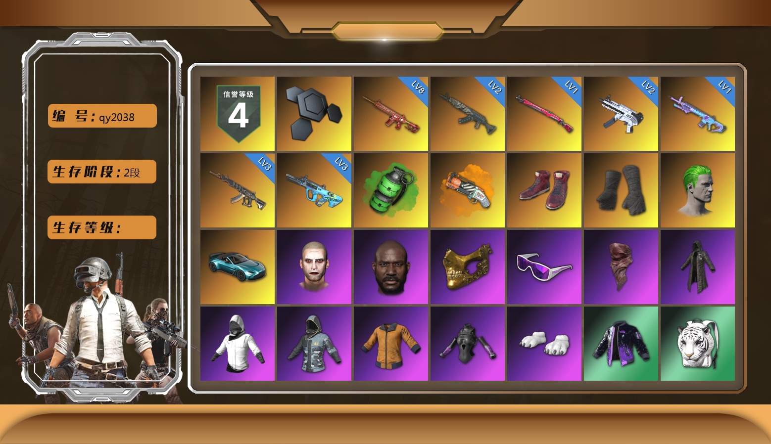 ❤找回包赔❤皮肤:8级朱雀M4 3级妖魔之触ACE 3级GD-AUG 2级青龙762 2级无重力MP5K 1级午夜惊魂98K 1级魔咒之力Mk12 翡翠色烟雾弹 橙色狂怒之雾-M79 柏林鞋 黑绷带 小丑男 马丁敞篷跑车 信誉等级四 6688聚合物 丑男妆容 黑鬼 金面 滑雪镜 红面巾 黑大衣 白战神 小战神 黄东 发光手臂 白熊鞋 飞行员夹克 白虎背包 阿狸 拉风龙 PKL夹克 杂技熊头套 杂技熊玩偶服 杜卡迪车队比赛日手套 杜卡迪车队比赛日鸭舌帽 杜卡迪冒险家夹克(黑色) 杜卡迪冒险家连帽卫衣(红色) 杜卡迪冒险家夹克(红色) 杜卡迪车队T恤(白色) 杜卡迪车队T恤(红色) 杜卡迪车队比赛日夹克 杜卡迪冒险家赛车裤 杂技熊脚套 杜卡迪冒险家赛车靴 “魔力甜心萨莉” 两栖装甲车 发型43 丸子头 萨迪娅的头纱 发型61 发型24 类星之王 青海摇 星魂猛虎下山运动裤 星魂猛虎下山运动夹克 星魂猛虎下山滑雪镜 朱芳芳手套 朱芳芳长裤 银色美人飞行员夹克 卡通学院夹克 零度机能风 小丑夜总会服饰 加油!连帽卫衣 小可爱睡衣 无重力披风 斑斓危机 闪亮运动裤 紫色运动裤 工作裤 战术科技裤 3号长袖运动衫 猎手猫夹克 猎手猫上衣 猎手猫短裙 猎手猫皮鞋 极光之友 极光之友 恐龙乐园 恐龙乐园 恐龙乐园 恐龙乐园 恐龙乐园 柴犬帮 宝贝外面冷 维娜托手套 维娜托口罩 维娜托水手 维娜托短裙 维娜托短靴 兄弟同盟 兄弟同盟 怨恨小姐 佣兵队制服 棉花蕾丝绒 紫喵喵手套 紫喵喵卫衣 复古重燃 17GAMING 夹克 17GAMING 长裤 奶牛印花短裙(棕色) 老奶奶睡裙 老奶奶睡裤 鸡警 沉睡女王 沉睡女王 绸缎长袖 绸缎睡裤 薄荷巧克力 薄荷巧克力 薄荷巧克力 薄荷巧克力 战术科技夹克 太阳之子电波干扰背包 泡吧达人 晚餐幻象纹身 小恶魔纹身 蜘蛛纹身 金墨点染 金墨点染 金墨点染 群雄逐鹿 金墨点染 金墨点染 金墨点染 群雄逐鹿 群雄逐鹿 金墨点染 2级包 强袭者上衣 魔力甜心萨莉的礼服(粉红色) 萨莉的皮鞋 萨莉的礼服 萨莉的长靴 萨莉的礼服 萨莉的皮鞋 萨莉2级头 萨莉2级包 萨莉3级包 小兔航天局 小兔航天局 小兔航天局 小兔航天局 小兔航天局 小兔航天局 小兔航天局 小兔航天局 小兔航天局 小兔航天局 探月者 小兔学院 降落伞 兔兔也朋克面罩 兔兔也朋克发箍 兔兔也朋克洋裙 兔兔也朋克腿套 发型60 发型59 粗糙 (橙色) - M416 晚秋-M416 柠檬汁 - M416 PGC 2021 群雄逐鹿 - M416 地狱火 - M416 雪国风光 - M416 数码沙漠迷彩 - M416 朱雀 爱之小鸡 舞蹈派对! 维京先遣队 万圣节大奖 手绘的“举起手来” 亲爱的... 朱莉 女巫的黑暗仪式 PGC 2022 王牌登场 - Beryl M762 PGC 2021 群雄逐鹿 - Beryl M762 催眠状态 亲爱的,看锅! 恶魔的微笑 花呢控 - Beryl M762 双狼成行 月球漫步者 毒性 - Beryl M762 PCS2 金色成就 - Beryl M762 凯尔特结 - Beryl M762 鎏金王朝 - Beryl M762 魔女之力 - Beryl M762 魔力甜心萨莉的挚友 - AKM 绷带AK 暗影斑驳 - AKM 钞能力 - AKM 竞速之道 - AKM 鲜花之力 - AKM 大理石宝藏 - AKM 金色落叶 - AKM 渗透与破坏 - AKM 粗糙 (橙色) - AKM 标准猎手 - AKM 17GAMING - AKM 灵魂枷锁 - AKM 彩糖蛋糕 - AUG 多彩科技猫 - AUG 镀银 - AUG 宝贝外面冷 - ACE32 大理石宝藏 - ACE32 PNC 2023 完美角度 - ACE32 霓虹之星 - SCAR-L G-DRAGON - SCAR-L 镀银 - SCAR-L 补丁 - SCAR-L 鸡斯卡 - SCAR-L 粗糙 (橙色) - SCAR-L 三重彩 - SCAR-L 蔚蓝挑战者 - SCAR-L 恶战 - M16A4 双色 - M16A4 游猎之旅 - M16A4 数码丛林迷彩 - M16A4 华夫饼 - M16A4 锁链帮 - M16A4 分秒必争 - QBZ 分形几何 - QBZ 这不是玩具 - Mk47 Mutant 方形铬印 - Mk47 Mutant 灵魂枷锁 - Mk47 Mutant 心跳掠夺者 - Mk47 Mutant 金色神焰 - AKM 无尽迷宫 - Mk47 Mutant 淡雅之力 - Mk47 Mutant 灰色系 - Mk47 Mutant 水手 - G36C 标准猎手 - G36C 魔幻六边形 - G36C 分形几何 - G36C 钴蓝呼号 - G36C 标准猎手 - Groza 无尽迷宫 - Groza 镀金 - Groza 方形铬印 - Groza 钴蓝呼号 - K2 水手 - K2 无拘来世 - K2 钴蓝呼号 - SLR 青龙之灵 - SLR 大理石宝藏 - SLR PGC 2022 王牌登场 - SLR 水手 - SLR 数码丛林迷彩 - SKS 礼品店 - SKS 镀金 - SKS 金色落叶 - SKS 彩虹之上 - Mini14 夏日冲浪 - Mini14 拼图 - Mini14 威尼斯人 - Mini14 甜蜜外衣 - Mini14 数码沙漠迷彩 - Mini14 PGC 2023 皇冠宝石 - Mk12 彩虹四溢 - Mk12 雪国风光 - Mk14 紫色雨滴 - VSS 花呢控 - VSS 银河小队 - VSS 斑点狗 - VSS 镀银 - VSS 海洋哑光(蓝色) - VSS 璀璨星光 - QBU 鎏金王朝 - QBU 魔力甜心萨莉的永恒挚友 - 德拉贡诺夫 睡衣派对保护者 - 德拉贡诺夫 镀金 - Win94 数码沙漠迷彩 - Win94 悠扬情歌 - Kar98k 粗糙 (橙色) - Kar98k 魔女之力 - AWM 鲜花之力 - AWM 镀金 - AWM 海藻在路上 - M24 G-DRAGON - M24 幸运骑士 - M24 玄武之灵 - M24 双色 - 莫辛纳甘步枪 无拘来世 - 莫辛纳甘步枪 彩糖蛋糕 - 莫辛纳甘步枪 海洋哑光(蓝色) - 莫辛纳甘步枪 睡衣派对保护者 - JS9 碰撞测试 - MP5K 标准猎手 - MP5K 灰色系 - MP5K 赛季33竞技铂金 - FAMAS 赛季32竞技黄金 - P90 竞速之道 - P90 沙漠烈阳 - PP-19 Bizon 方形铬印 - PP-19 Bizon 镀金 - UMP 游猎之旅 - UMP 熔岩灯 - UMP 钴蓝呼号 - UMP 熔岩灯 - JS9 竞速之道 - UMP 标准猎手 - UMP 镀银 - UMP 海藻来帮忙 - UMP 雪国风光 - 汤姆逊冲锋枪 公路战士 - 汤姆逊冲锋枪 水手 - 汤姆逊冲锋枪 愉悦的绿松色 - 汤姆逊冲锋枪 镀银 - 汤姆逊冲锋枪 抽象派 - MP9 抽象派 - Vector 精工美术 - 汤姆逊冲锋枪 魔女之力 - Vector 海狼鱼 - Vector 海洋哑光(绿色) - Vector 水手 - Micro UZI 三重彩 - Micro UZI 数码沙漠迷彩 - Micro UZI 淡