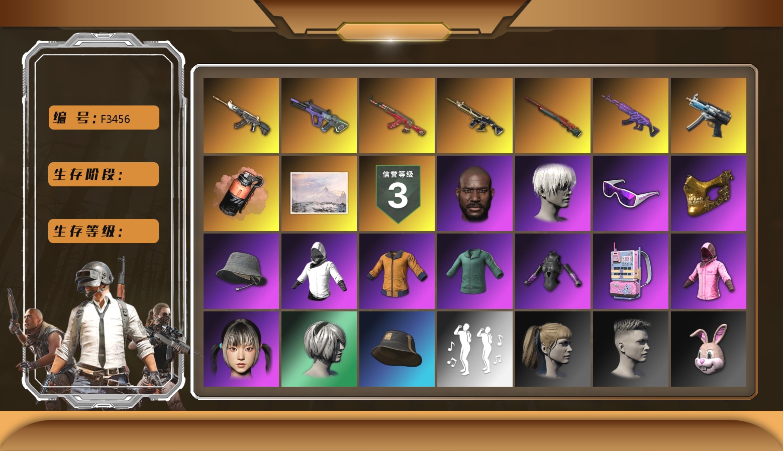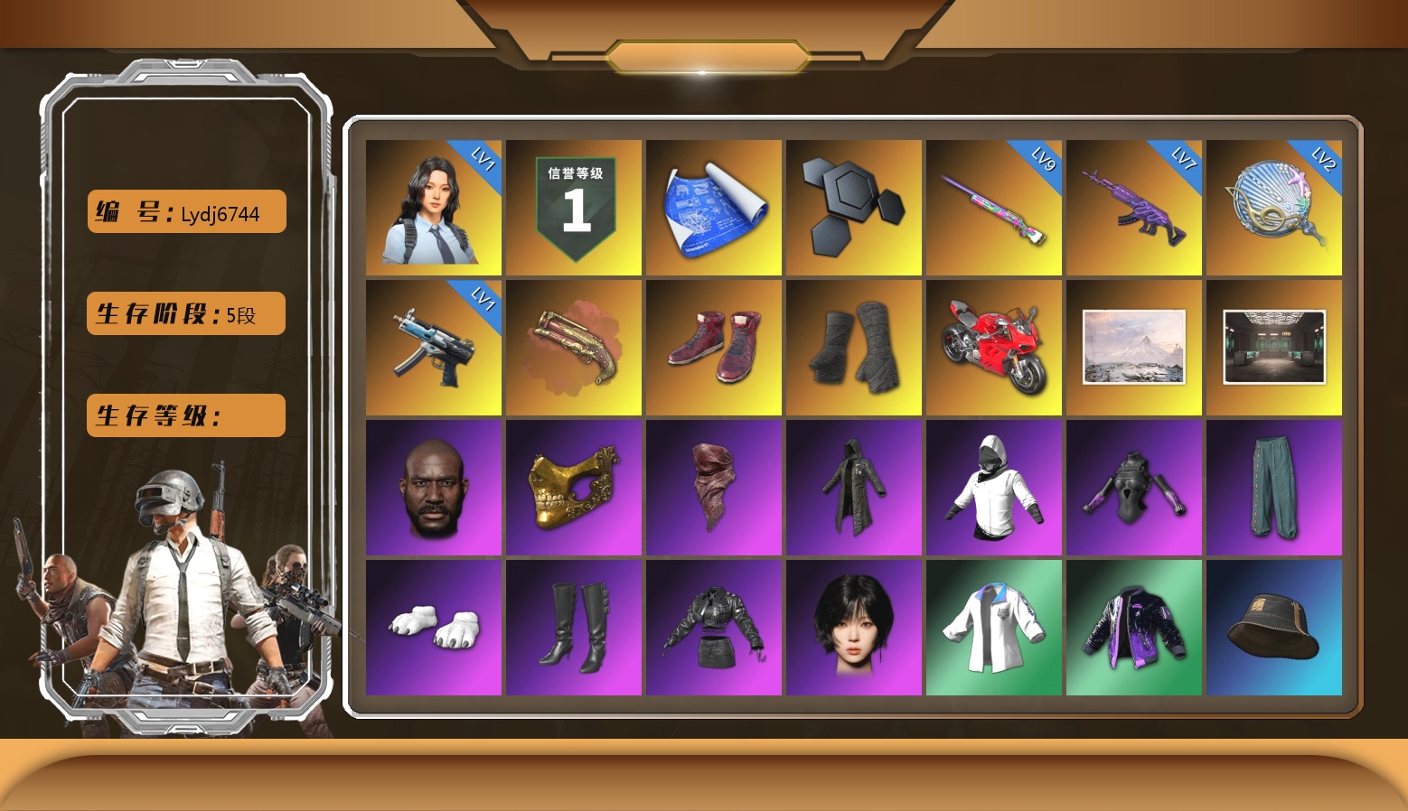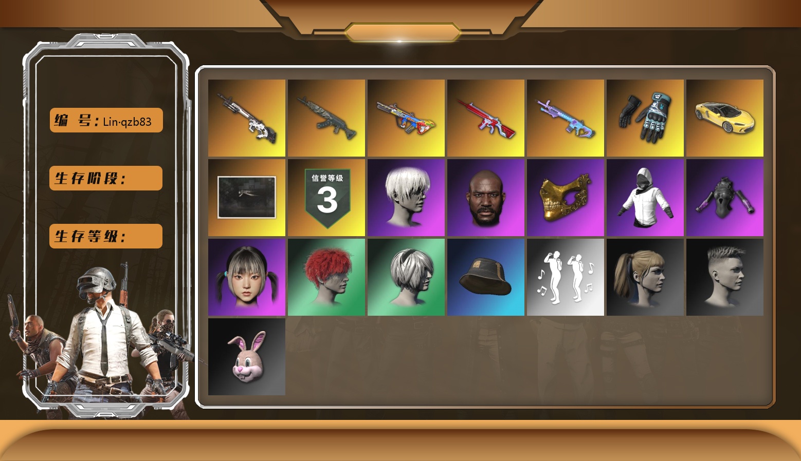 赛博MK12 青龙762 黑鬼 金面 小马尾 尼尔 小兔手套 烟雾弹 生存等级 二阶段 爆裂AUG 2024女团 无信号M4 跑车 SUV 白战神 信誉等级 信誉等级三 发光手臂 9s发型 小兔学院 小叮当 西游记 阿狸 危险玩偶屋 拉风龙 9级 9级 1级 1级 是否可排位 是 魔咒之力Mk12 1级 兰博大厅