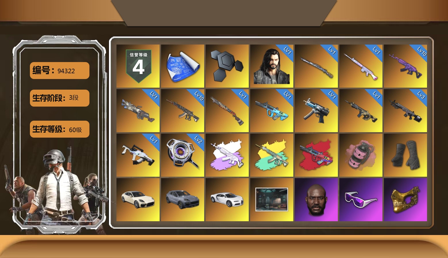 1级多利安 10级美杜莎762 10级妖魔之触ACE 3级暗影之主Mk12 2级虚空使者 1级时空使者M4 1级冰域Groza 1级GD-AUG 1级寒蚀MP5K 1级刻耳柏洛斯M249 1级玩偶炮 1级烈日灼烧-S1897 1级猛虎98k 美杜莎(异色) 妖魔之触(异色) GD-AUG(异色) 粉色烟雾弹 3张图纸 4462聚合物 黑绷带 帕拉梅拉 保时捷卡宴 布加迪跑车 黑鬼 滑雪镜 金面 渔夫帽 牛角 活动绿东 发光手臂 电磁背包 白熊鞋 鸡斯卡夹克 小马尾 丸子头 青海摇 车漆 小兔学院 绷带AK 西游记 滑雪帽