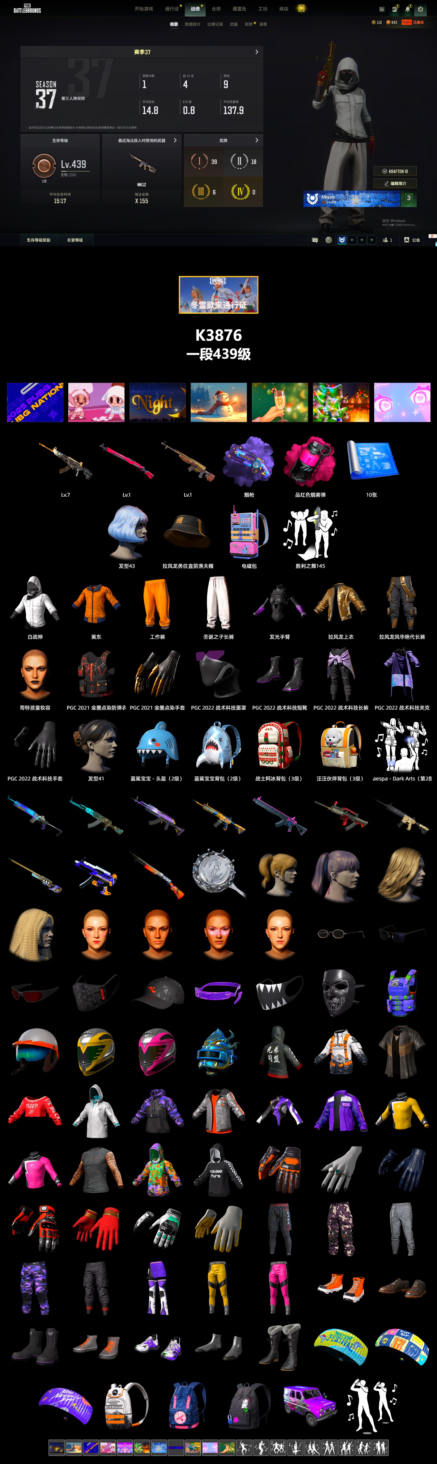 绝地求生(PUBG)[K3876]1段139级 7级恶魔 1级午夜 1级时光 烟枪 烟弹 10图 电磁包 白战神 黄东 发光手 拉风龙