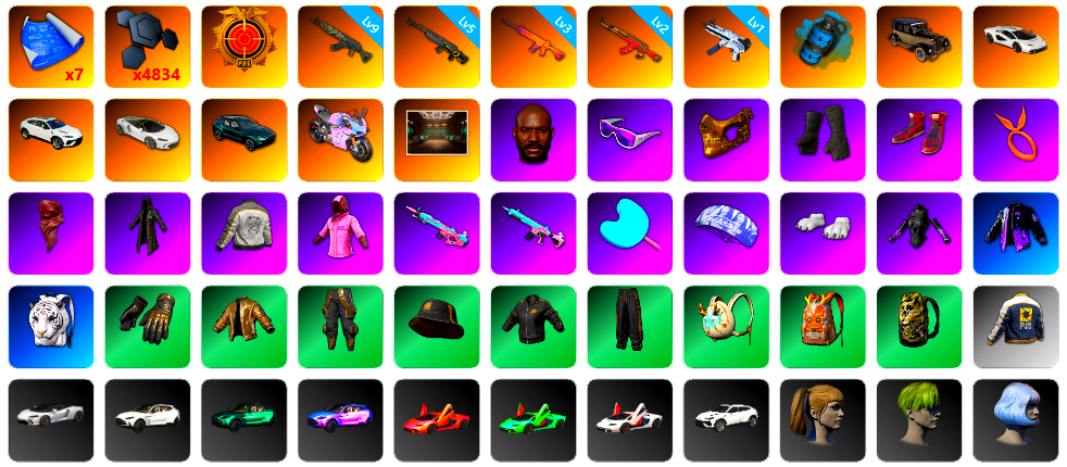 7张图纸 4834聚合物 神枪手金 9级青龙762 5级玄武SKS 3级南瓜M4 2级圣诞AK 1级无重力MP5K 天蓝色烟雾弹 兰博基尼跑车 兰博基尼SUV 迈凯伦硅质白版 马丁SUV 杜卡迪暮光粉 交易所接待室 黑鬼 滑雪镜 金面 黑绷带 柏林鞋 橙色发带 红面巾 黑大衣 粉战神 白熊鞋 发光手臂 拉风龙 车漆 小马尾 小绿头 丸子头 脏辫 青海摇 小兔学院 悲喜 西游记 PGC 2021套装 胜利之舞39