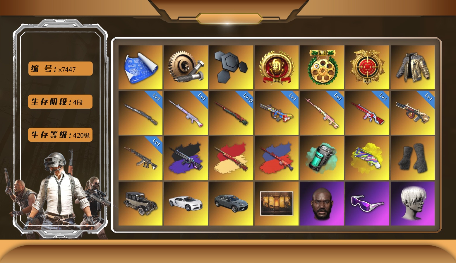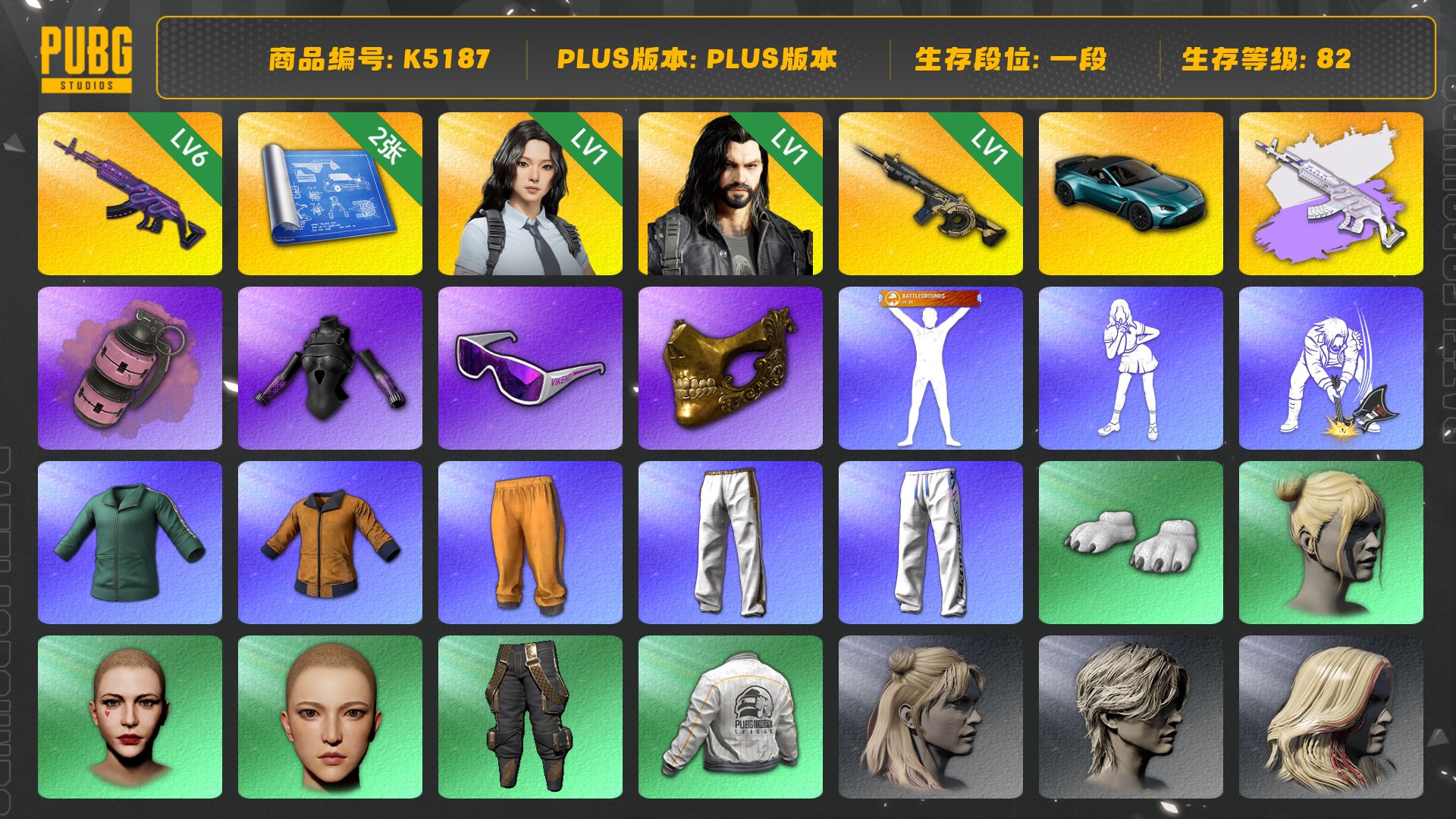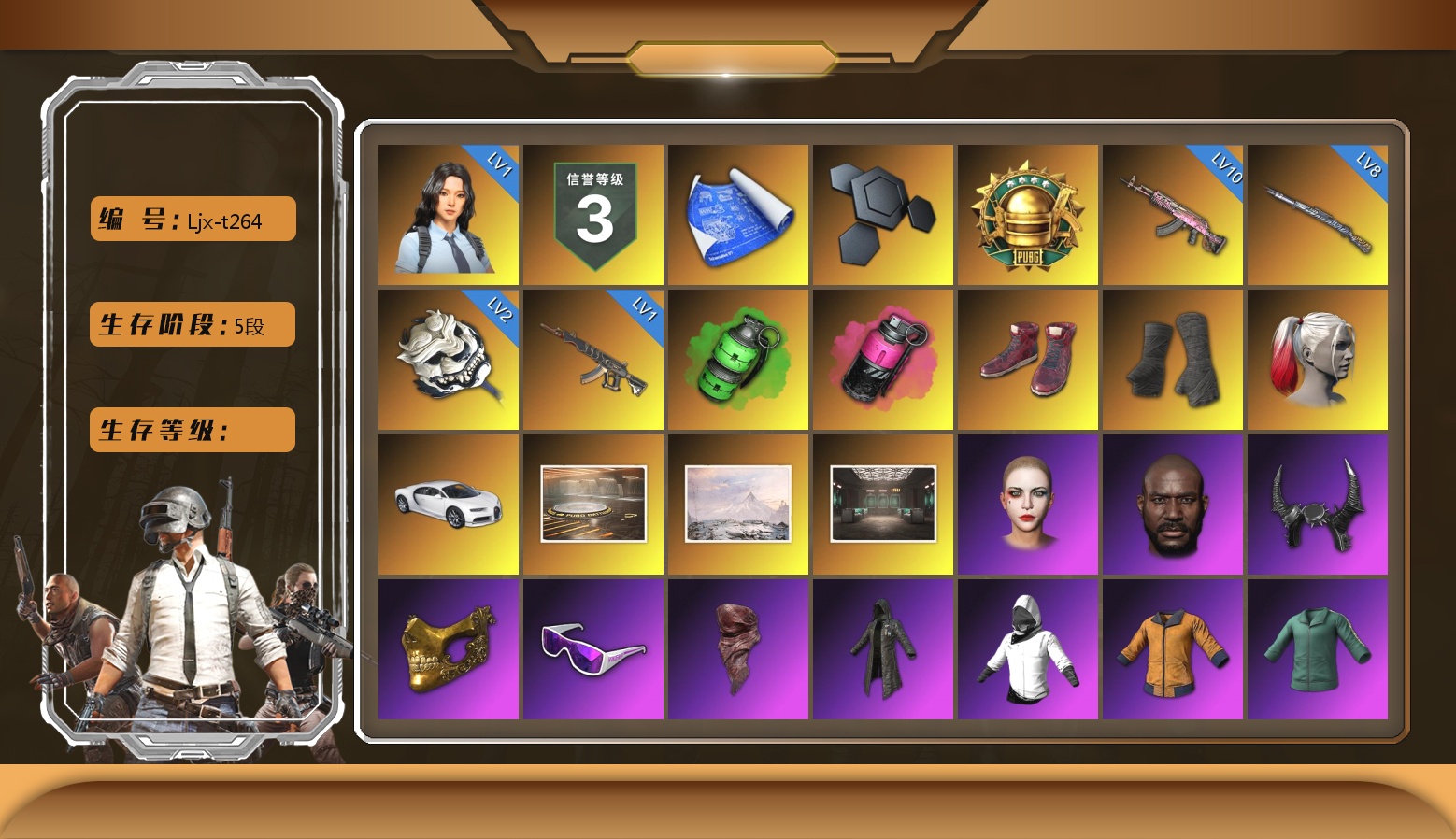 10级火麒麟 8级猛虎98k 2级白虎锅 1级瀚娜 1级妖魔之触ACE 翡翠色烟雾弹 品红色烟雾弹 柏林鞋 黑绷带 小丑女 布加迪跑车 陈列室 冬季藏匿处 交易所接待室 6张图纸 6656聚合物 黑鬼 牛角 金面 滑雪镜 红面巾 黑大衣 白战神 黄东 活动绿东 发光手臂 电磁背包 白熊鞋 萨芬裤 粉战神 aespa女团 阿狸 拉风龙 小马尾 丸子头 西游记 脏辫 爱的主打歌 青海摇 悲喜 PGC 2021套装