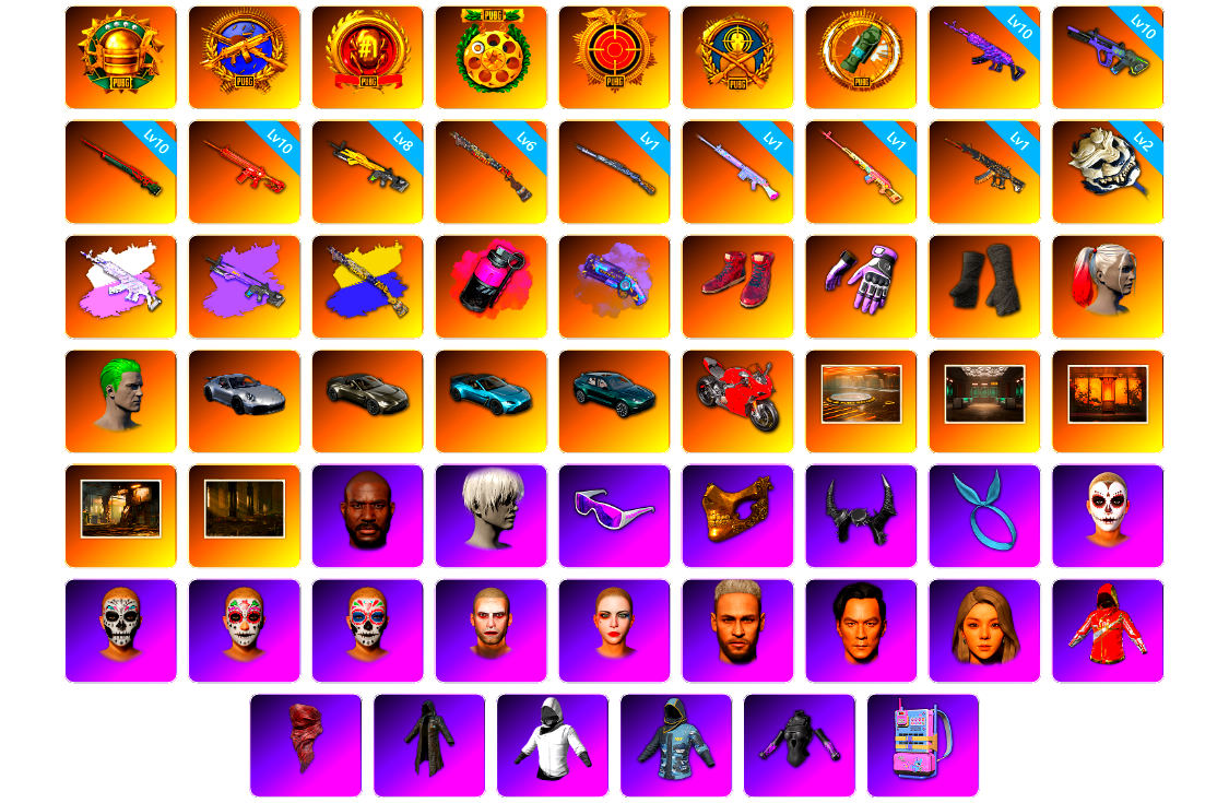 10级美杜莎762 10级霓虹AUG 10级孙悟空M24 10级朱雀M4 8级小兔MK12 6级烈日灼烧-S1897 1级猛虎98k 1级玩偶炮 1级德拉贡 1级妖魔之触ACE 2级白虎锅 美杜莎(白异色) 小兔MK12(异色) S1897(异色) 品红色烟雾弹 紫色魔法迷雾-M79 柏林鞋 小黑盒 黑绷带 小丑女 小丑男 保时捷911 马丁跑车 马丁敞篷跑车 马丁SUV 杜卡迪红 陈列室 交易所接待室 武器神龛 黑鬼 9s发型 滑雪镜 金面 牛角 康萨斯 卡崔娜 丑男妆容 内马尔 红面巾 黑大衣 白战神 小战神 发光手臂 电磁背包 萨芬裤 白熊鞋 粉战神 女团 阿狸 尼尔 拉风龙 车漆 小马尾 小绿头 丸子头 西游记 脏辫 爱的主打歌 青海摇 小兔学院 悲喜 枪炮洗礼