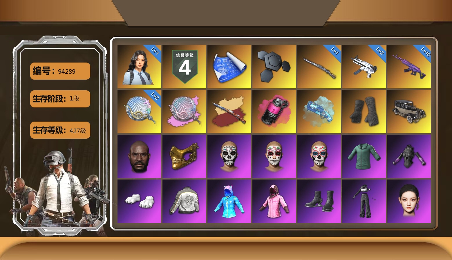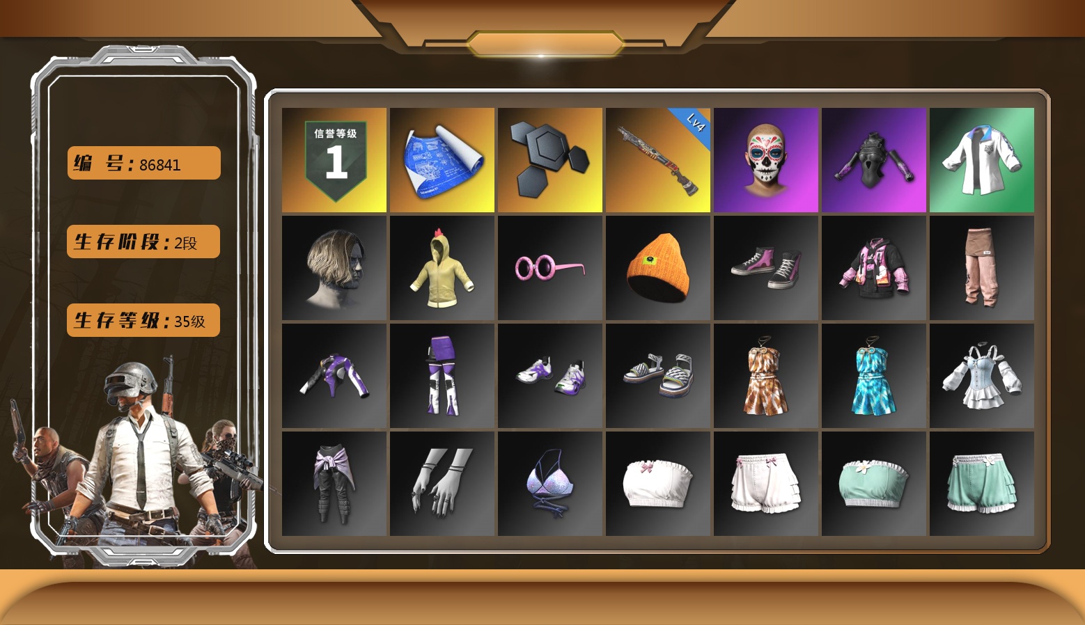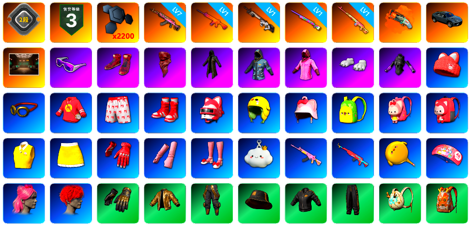 生存2阶段 信誉等级三 2200聚合物 7级火麒麟 1级南瓜M4 1级赛博MK12 1级彩虹M24 1级德拉贡 橙色狂怒之雾-M79 兰博基尼奢华版 交易所接待室 滑雪镜 柏林鞋 红面巾 黑大衣 小战神 粉战神 白熊鞋 发光手臂 阿狸 拉风龙