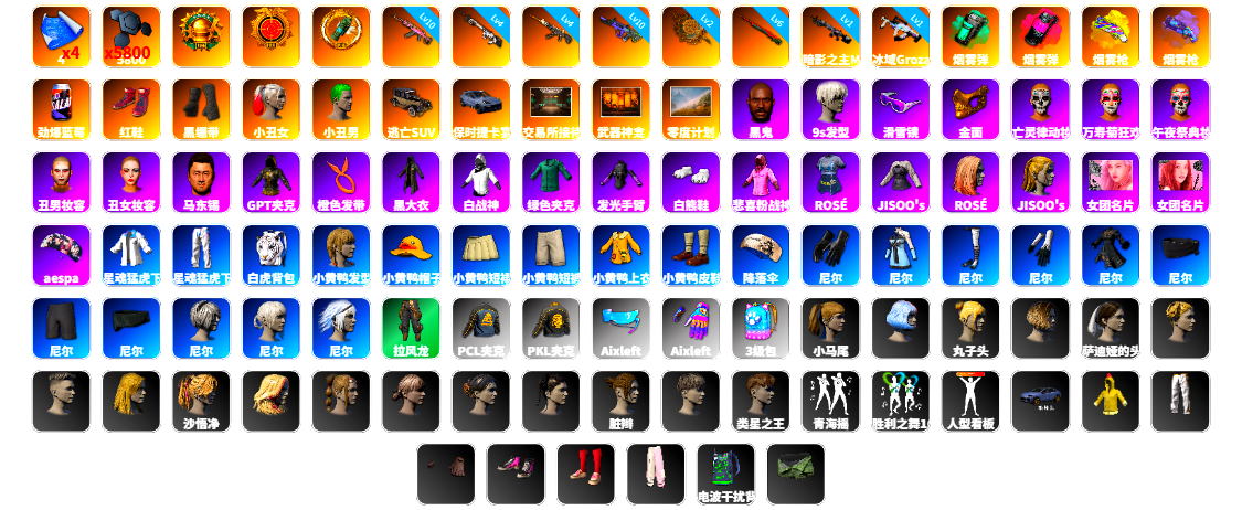 10级爆裂AUG 4级猛虎98k 1级瀚娜 1级赛博MK12 1级恶魔ACE 1级玩偶炮 爆裂AUG(异色) 翡翠色烟雾弹 紫色魔法迷雾-M79 保时捷卡宴 陈列室 冬季藏匿处 5张图纸 3250聚合物 黑鬼 滑雪镜 9s发型 牛角 白战神 黄东 活动绿东 发光手臂 白熊鞋 滑雪帽 阿狸 尼尔 拉风龙 小马尾 青海摇 小兔学院 绷带AK PGC 2021套装 胜利之舞39 枪炮洗礼
