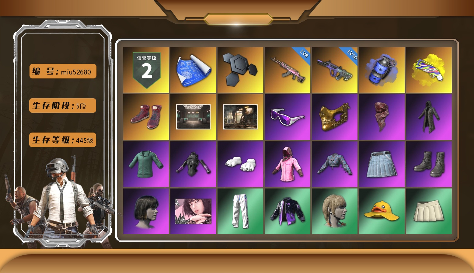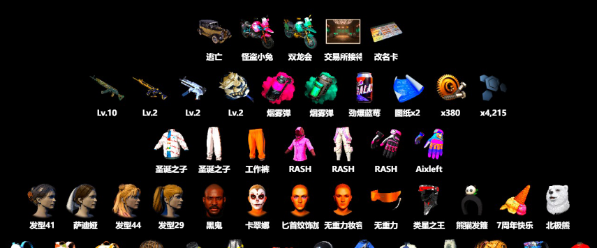 10级霓虹AUG 8级火麒麟 蓝色烟雾弹 黄色狂怒之雾-M79 柏林鞋 交易所接待室 3张图纸 3188聚合物 滑雪镜 金面 红面巾 黑大衣 活动绿东 发光手臂 白熊鞋 粉战神 女团 滑雪帽 小黄鸭 拉风龙 小马尾 丸子头 青海摇 小兔学院 悲喜