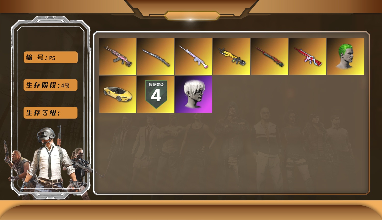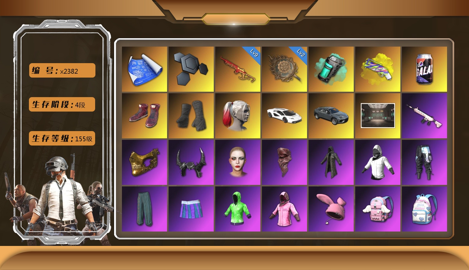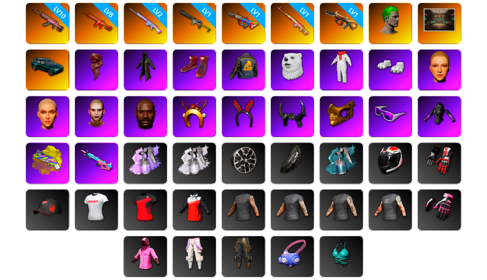 粉红烟雾弹10级火麒麟 8级朱雀M4 2级玩偶炮 1级沙悟净MINI 1级爆裂AUG 1级德拉贡 1级弥诺陶洛斯AUG 小丑男 马丁SUV 红面巾 黑大衣 柏林鞋 白熊鞋 黑鬼 牛角 金面 滑雪镜 发光手臂 黄色狂怒之雾 - M79 悲喜 粉战神 拉风龙