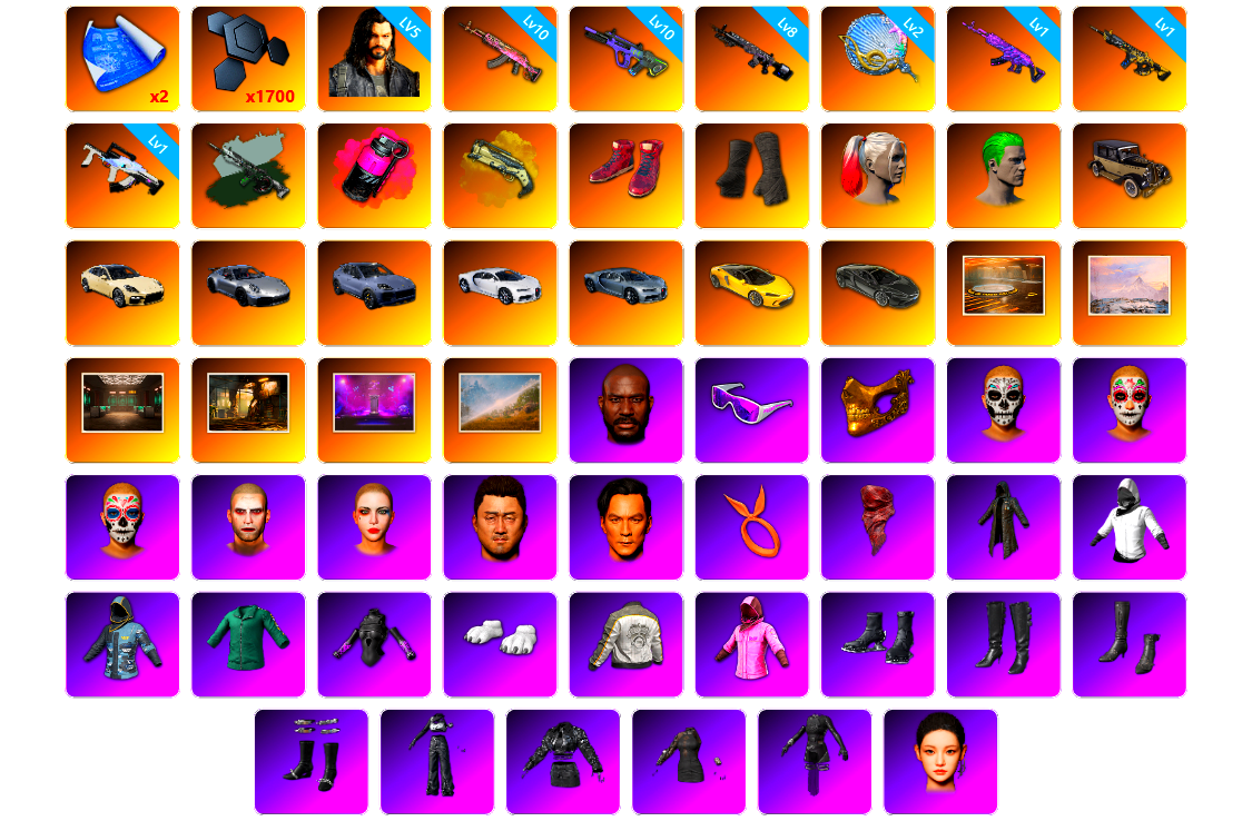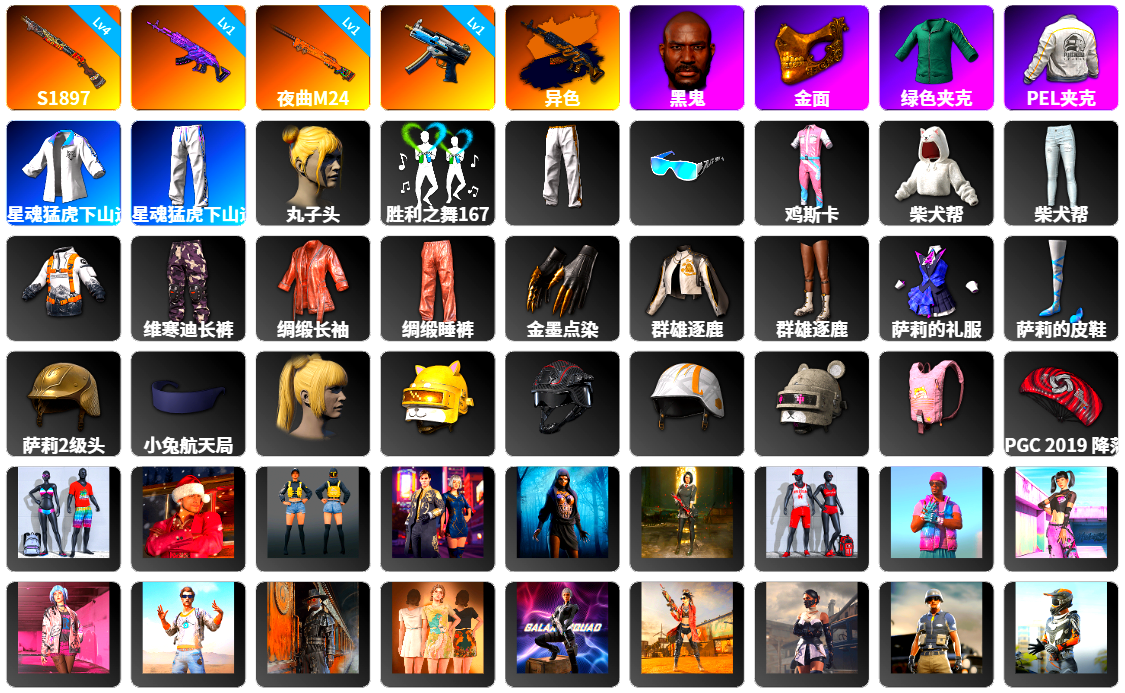 5张图纸 蜗牛币 14086聚合物 6级美杜莎762 6级圣诞AK 1级无信号M4 1级妖魔之触ACE 圣诞AK(异色) 品红色烟雾弹 柏林鞋 黑绷带 马丁跑车 交易所接待室 黑鬼 9s发型 金面 红面巾 黑大衣 白战神 小战神 黄东 萨芬裤 粉战神 尼尔 拉风龙 车漆 小马尾 脏辫 小兔学院 悲喜 西游记
