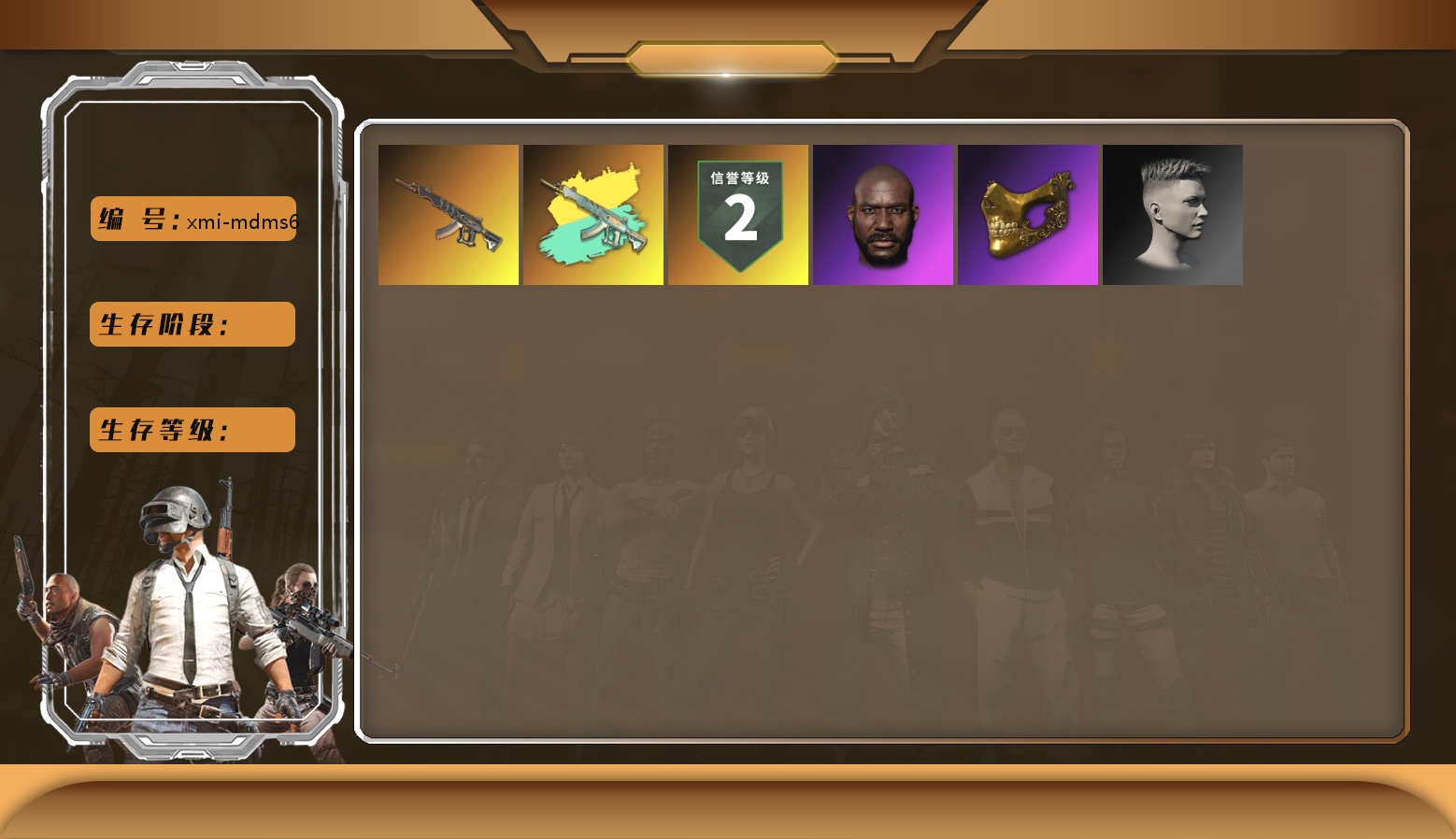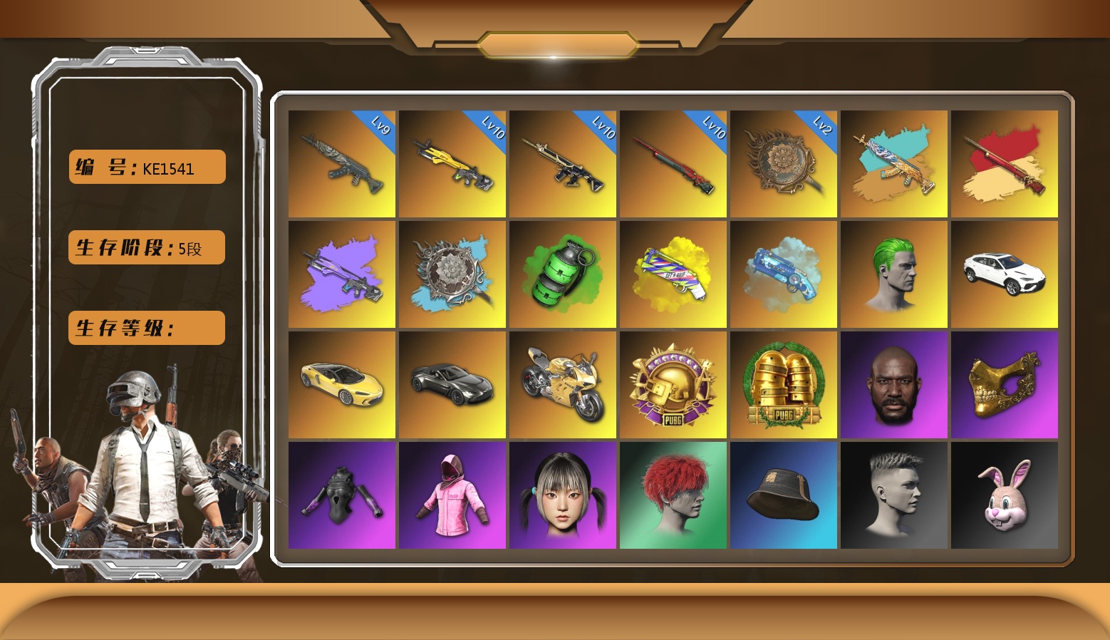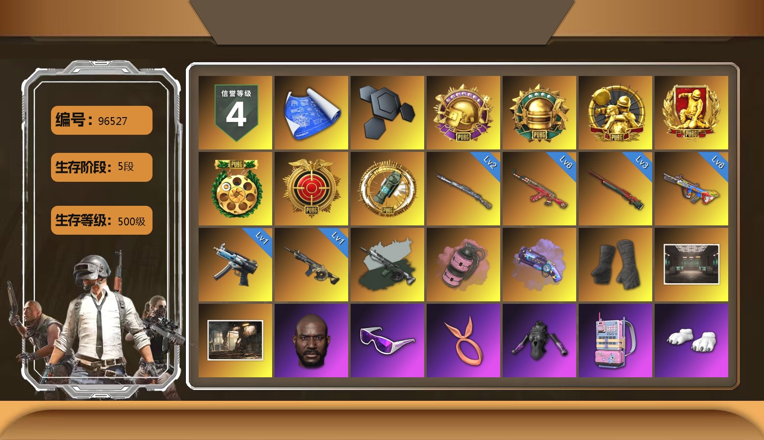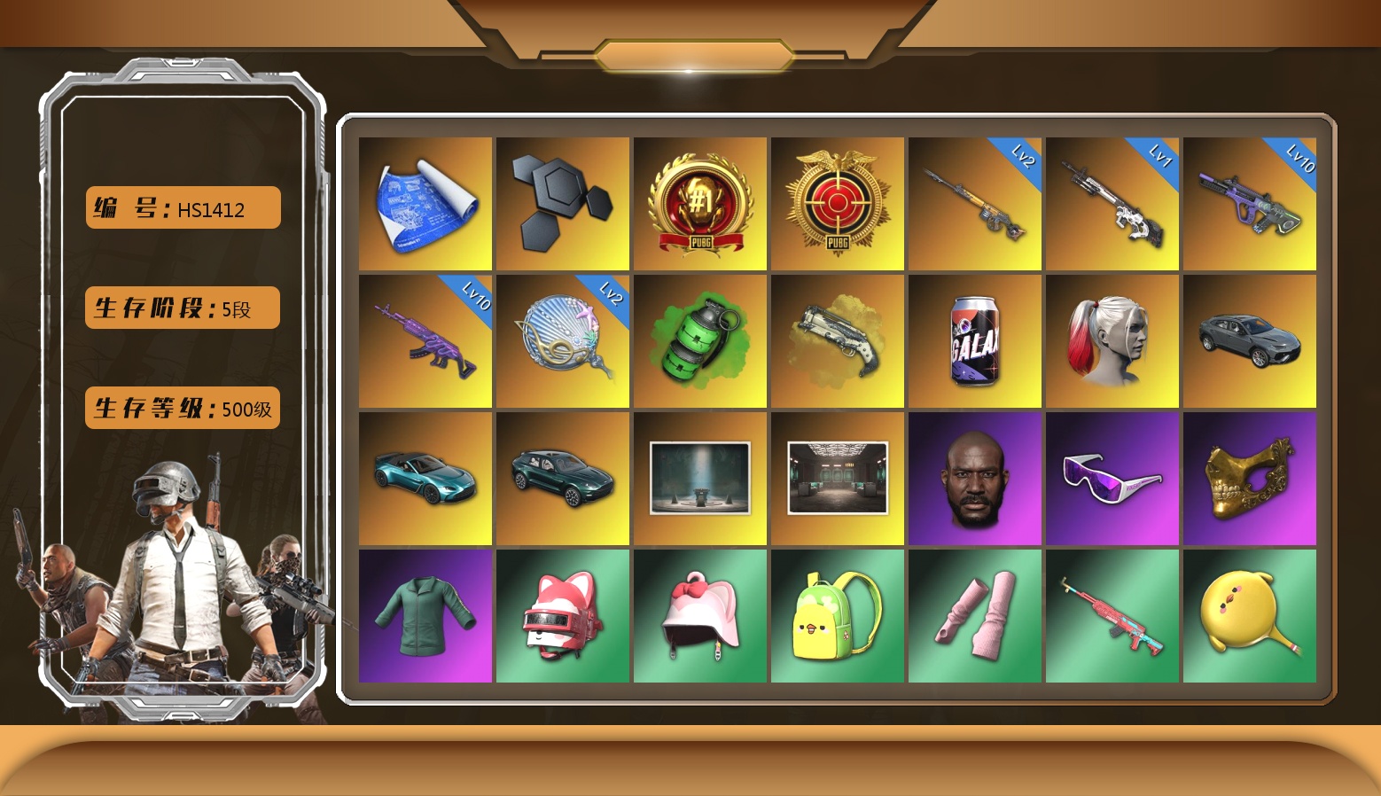 收割者金标 6级爆裂AUG 6级圣诞AK 3级孙悟空M24 2级猛虎98k 1级时空使者M4 1级寒蚀MP5K 时空使者M4(异色) 粉色烟雾弹 紫色魔法迷雾-M79 2张图纸 12328聚合物 黑绷带 交易所接待室 黑鬼 滑雪镜 橙色发带 发光手臂 电磁背包 白熊鞋 粉战神 阿狸 小马尾 西游记 小兔学院 悲喜 滑雪帽 PGC 2021套装 胜利之舞39