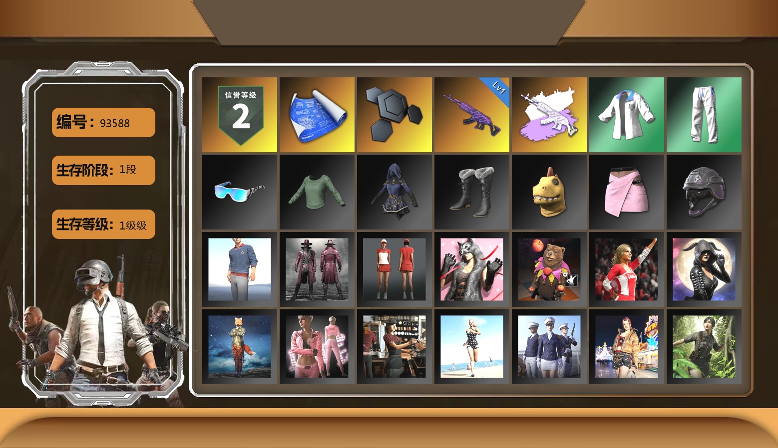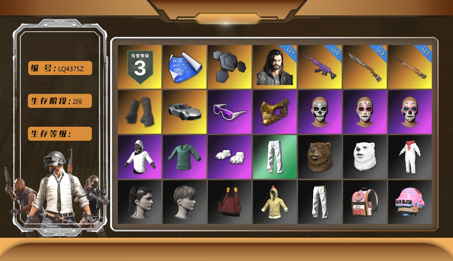 9级美杜莎762 3级烈日灼烧-S1897 1级多利安 1级夜曲M24 黑绷带 保时捷911 9张图纸 1774聚合物 滑雪镜 金面 白战神 活动绿东 白熊鞋 小兔学院 绷带AK 西游记
