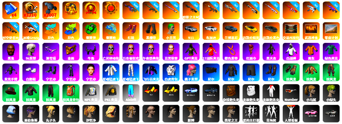 4张图纸 蜗牛币 2007聚合物 10级霓虹AUG 10级青龙762 9级彩虹M24 5级暗影之主Mk12 2级恶魔ACE 2级刻耳柏洛斯M249 1级赛博MK12 1级玩偶炮 1级无信号M4 1级无重力MP5K 1级美杜莎762 1级时空使者M4 1级冰域Groza 青龙762(异色) 无重力MP5K(异色) 翡翠色烟雾弹 蓝色魔法迷雾-M79 柏林鞋 黑绷带 小丑男 保时捷911 布加迪跑车 兰博基尼奢华版 迈凯伦玛瑙黑版 交易所接待室 武器神龛 黑鬼 9s发型 滑雪镜 金面 牛角 丑男妆容 橙色发带 红面巾 黑大衣 白战神 黄东 活动绿东 发光手臂 白熊鞋 aespa女团 阿狸 尼尔 拉风龙 车漆 小马尾 小绿头 丸子头 西游记 脏辫 爱的主打歌 青海摇 小兔学院 悲喜 绷带AK 滑雪帽 胜利之舞39 枪炮洗礼