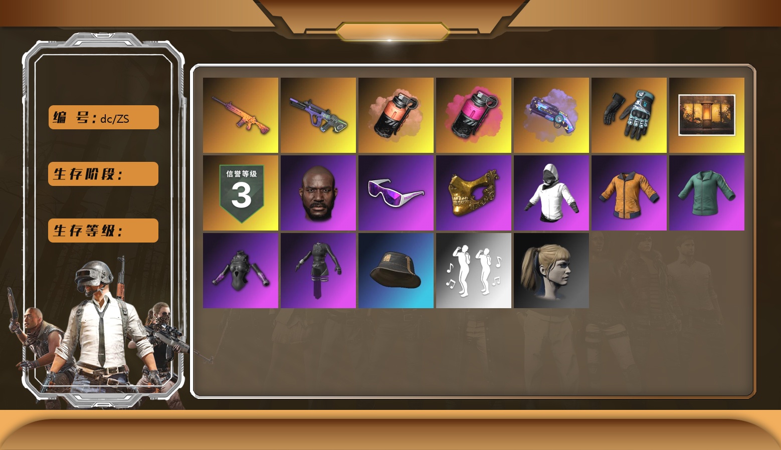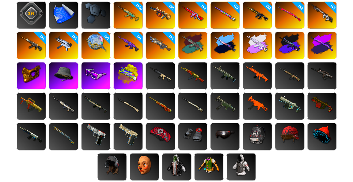 生存2阶段 图纸 聚合物 10级水麒麟 6级弥诺陶洛斯AUG 4级无信号M4 3级彩虹M24 2级猪八戒M4 2级午夜惊魂98k 1级赛博MK12 1级恶魔ACE 1级无重力MP5K 1级塞壬平底锅 1级美杜莎762 1级刻耳柏洛斯M249 水麒麟(异色) 彩虹M24(异色) 美杜莎(异色) 无信号M4(异色) 午夜惊魂98K(异色) 金面 渔夫帽 滑雪镜 烟雾枪
