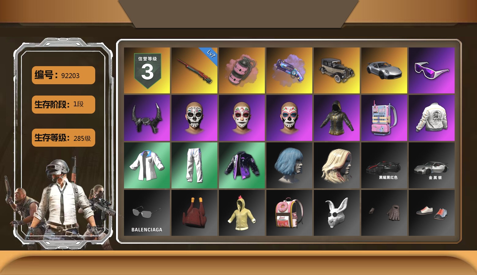 10级火麒麟 8级赛博MK12 6级GD-AUG 1级妖魔之触ACE 品红色烟雾弹 橙色狂怒之雾-M79 柏林鞋 布加迪跑车 冬季藏匿处 交易所接待室 7张图纸 3154聚合物 黑鬼 红面巾 活动绿东 发光手臂 滑雪帽 拉风龙 小马尾 西游记 脏辫 青海摇 小兔学院 绷带AK