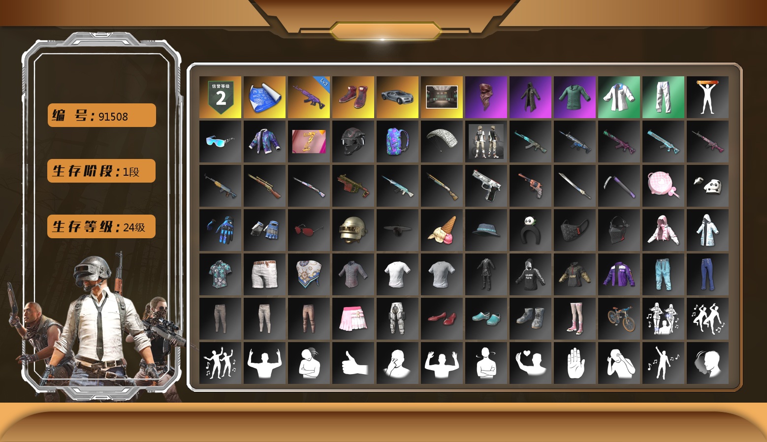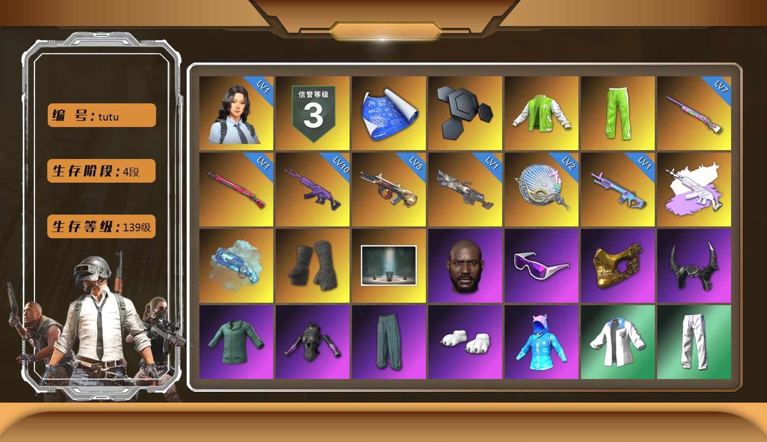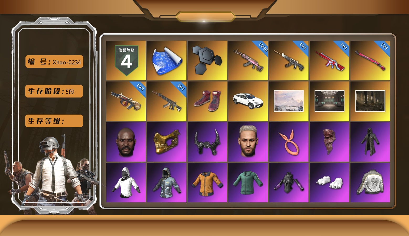 10级火麒麟 3级弥诺陶洛斯AUG 1级恶魔ACE 1级无信号M4 1级午夜惊魂98K 1级妖魔之触ACE 柏林鞋 兰博基尼SUV 冬季藏匿处 交易所接待室 1张图纸 8370聚合物 黑鬼 金面 牛角 内马尔 橙色发带 红面巾 黑大衣 白战神 小战神 黄东 活动绿东 发光手臂 白熊鞋 粉战神 阿狸 拉风龙 小马尾 小绿头 丸子头 脏辫 青海摇 小兔学院 悲喜 西游记 PGC 2021套装