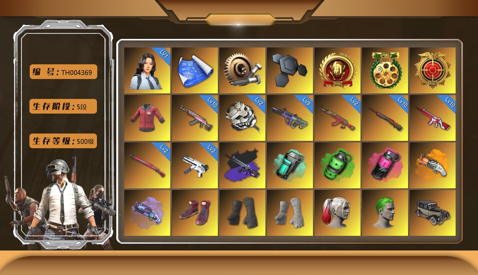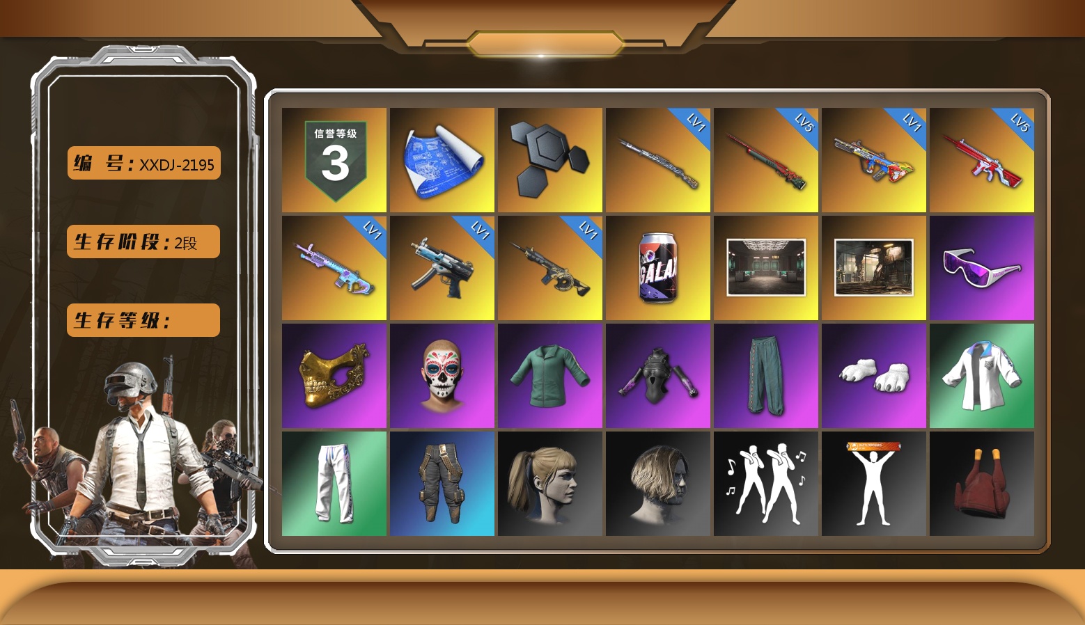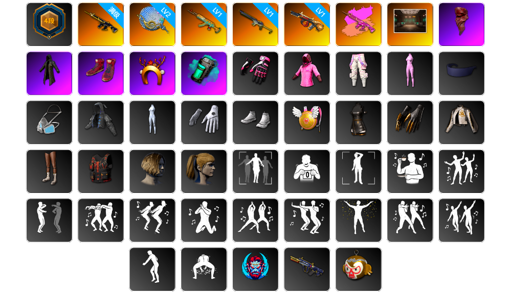 9级美杜莎762 3级赛博MK12 1级多利安 1级午夜惊魂98K 1级弥诺陶洛斯AUG 1级妖魔之触ACE 品红色烟雾弹 柏林鞋 黑绷带 杜卡迪翡翠绿 冬季藏匿处 交易所接待室 1张图纸 6600聚合物 黑鬼 金面 橙色发带 红面巾 黑大衣 白战神 小战神 活动绿东 发光手臂 白熊鞋 粉战神 滑雪帽 拉风龙 小马尾 小绿头 西游记 脏辫 青海摇 小兔学院 悲喜 PGC 2021套装