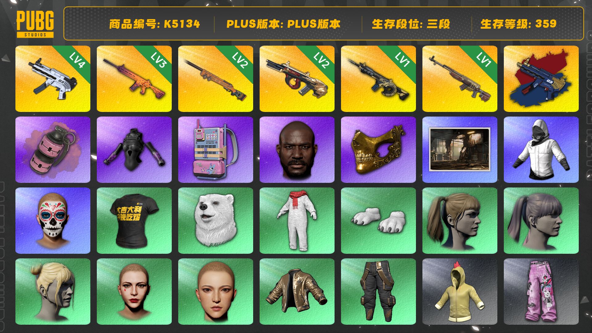 [K5134]3段359级 信誉3 4级无重力+异色 3级南瓜 2级夜曲 2级牛头 1级时空m4 1级时光 烟雾弹 发光手 电磁包 黑鬼 金面 小马尾 丸子头