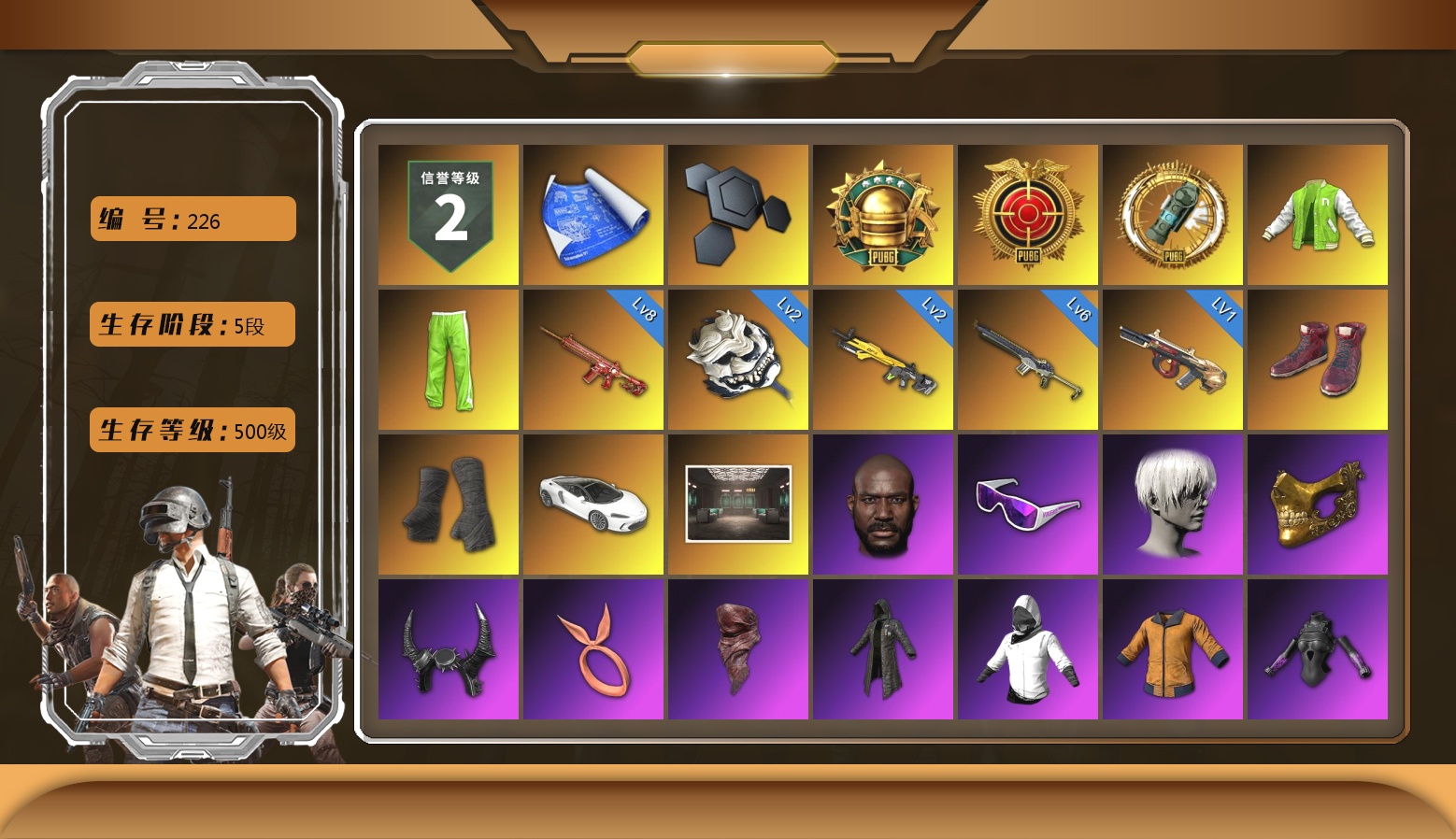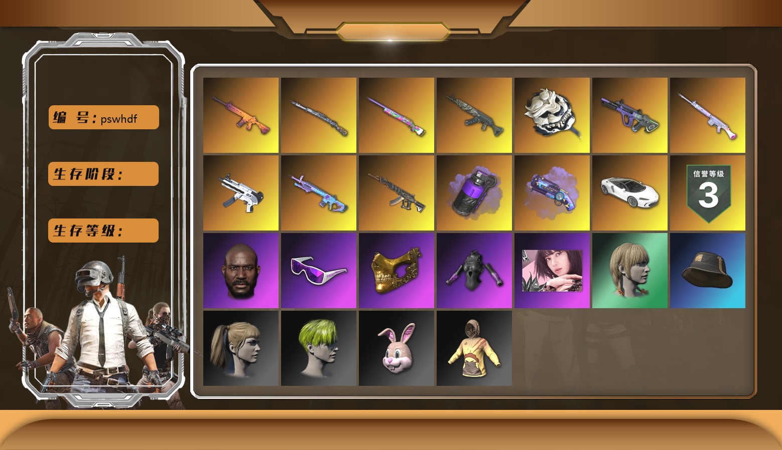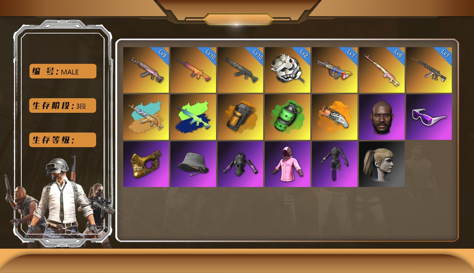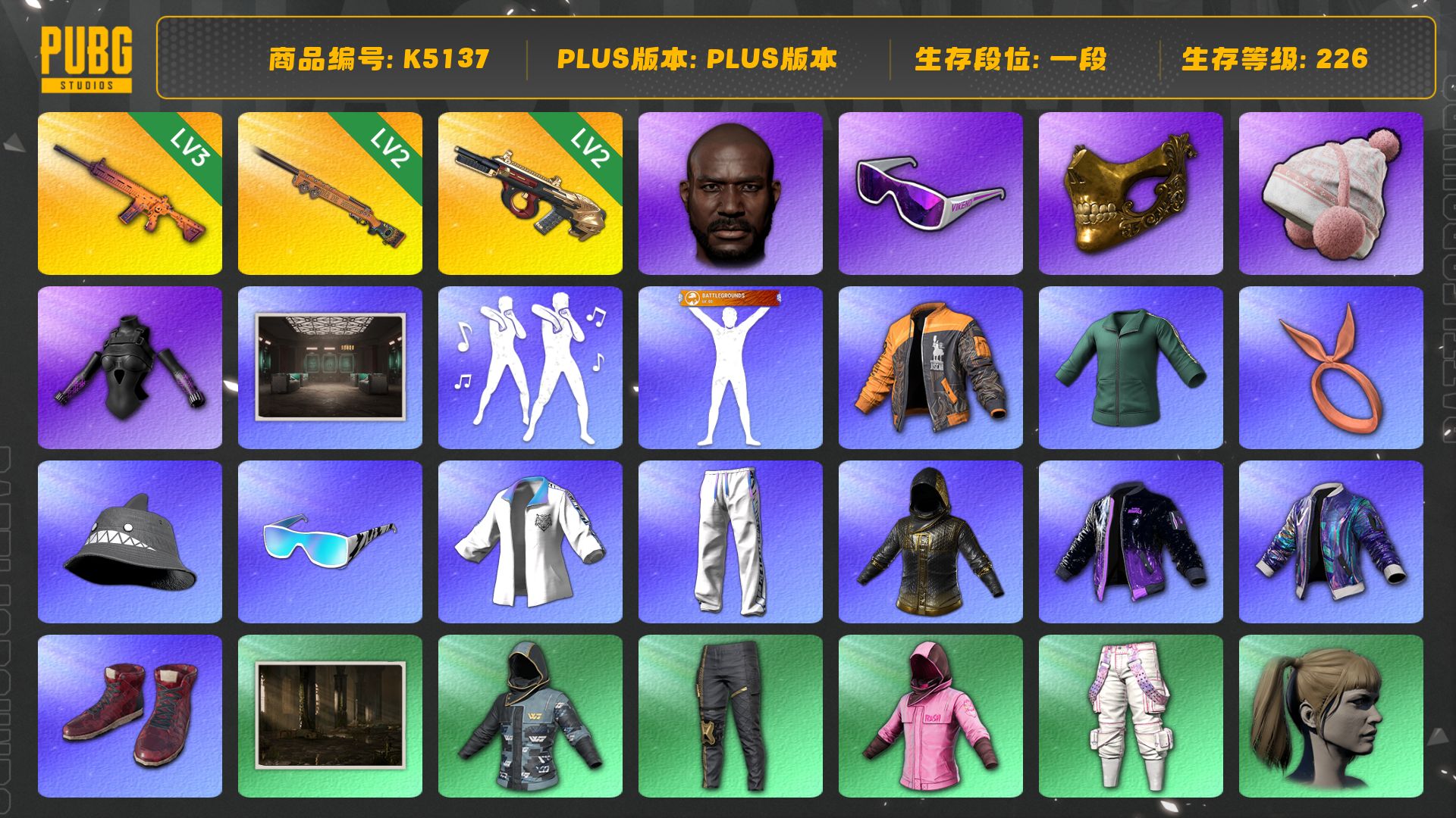 10级南瓜M4 10级青龙762 6级彩虹M24 5级霓虹AUG 2级白虎锅 1级猛虎98k 1级玩偶炮 1级无重力MP5K 1级魔咒之力Mk12 1级妖魔之触ACE 紫色烟雾弹 紫色魔法迷雾-M79 黑绷带 迈凯伦硅质白版 1张图纸 2368聚合物 黑鬼 滑雪镜 金面 橙色发带 发光手臂 白熊鞋 女团 小黄鸭 拉风龙 车漆 小马尾 小绿头 丸子头 脏辫 小兔学院 悲喜 绷带AK PGC 2021套装 胜利之舞39