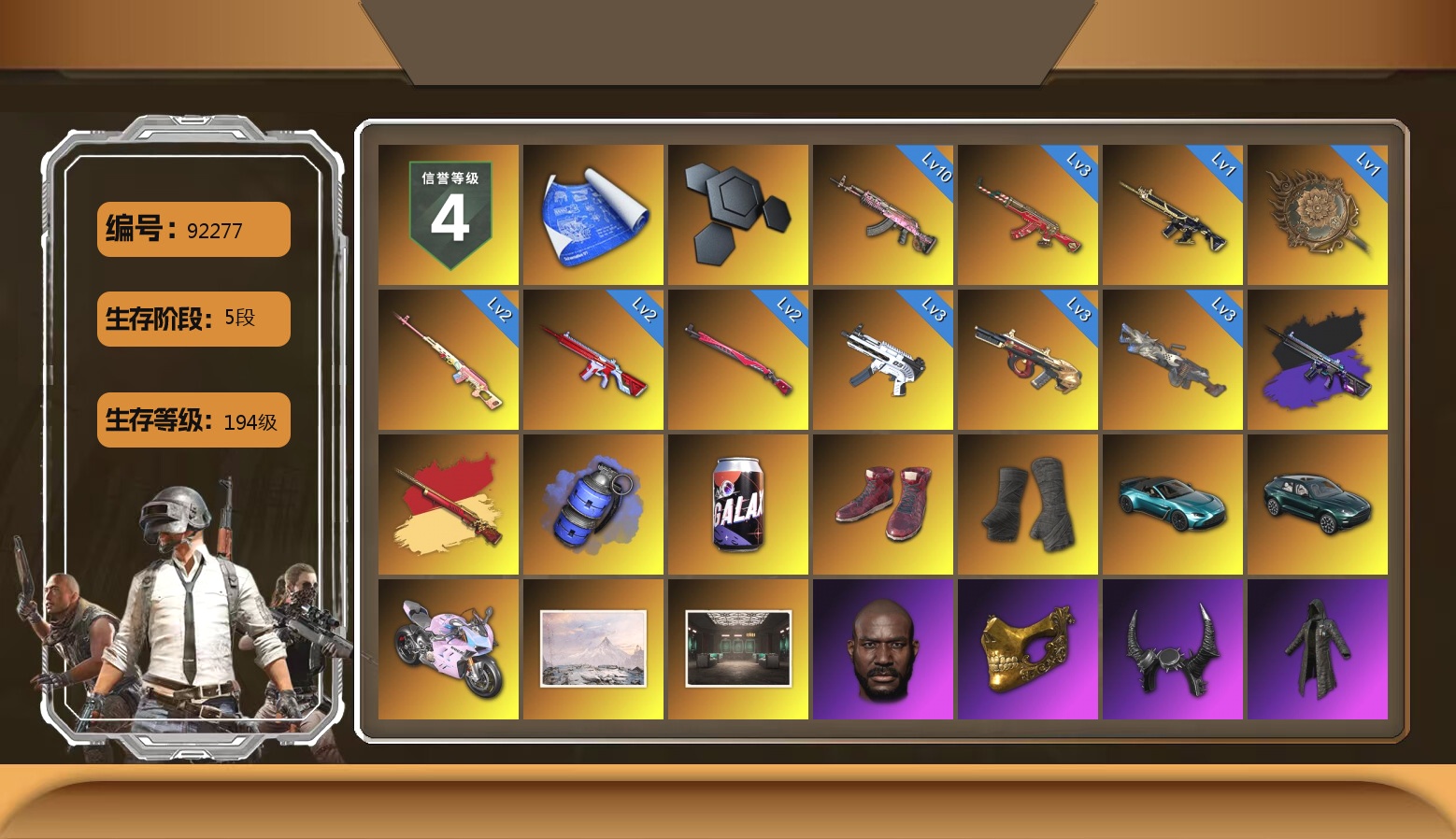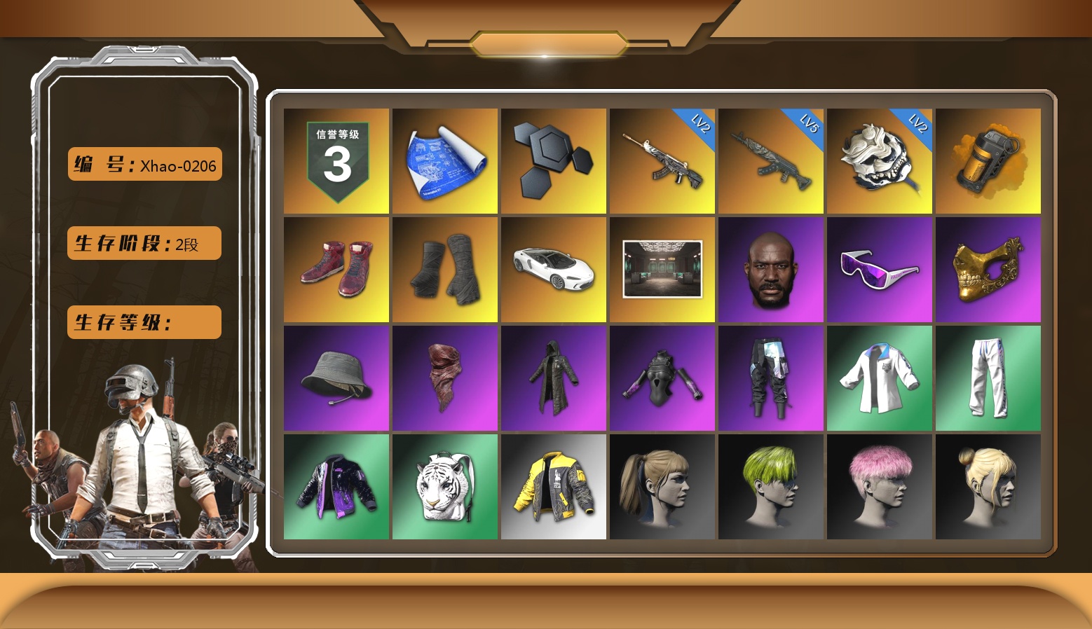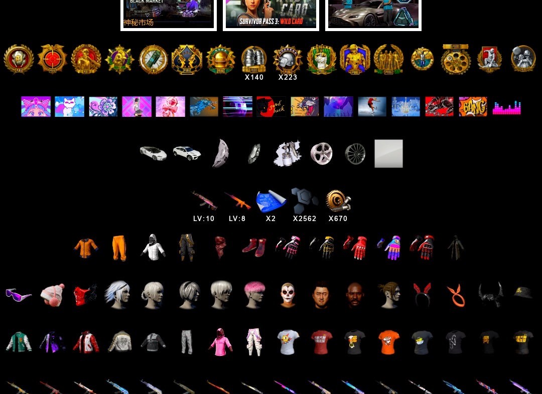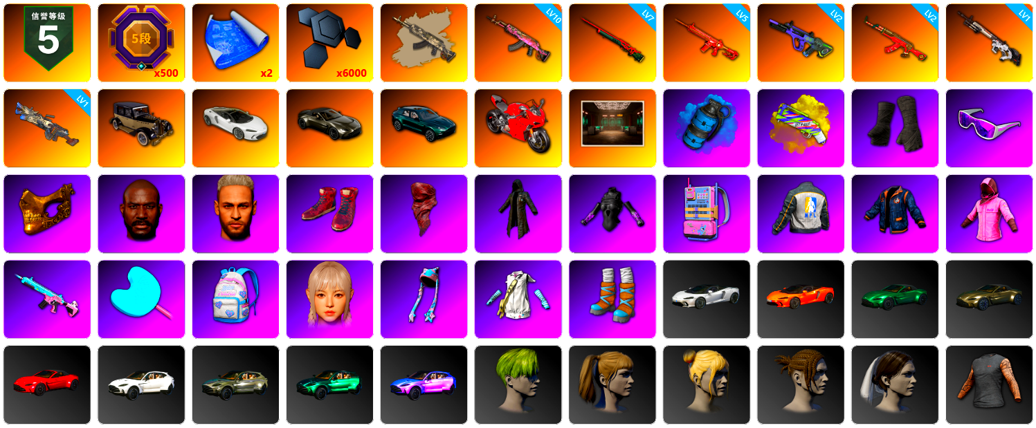 10级火麒麟 3级圣诞AK 3级弥诺陶洛斯AUG 3级无重力MP5K 3级刻耳柏洛斯M249 2级无信号M4 2级德拉贡 2级午夜惊魂98K 1级猪八戒M4 1级唐三藏平底锅 无信号M4(异色) 孙悟空M24(异色) 蓝色烟雾弹 7张图纸 3384聚合物 柏林鞋 黑绷带 马丁敞篷跑车 马丁SUV 杜卡迪暮光粉 冬季藏匿处 交易所接待室 黑鬼 金面 牛角 黑大衣 白战神 小战神 发光手臂 白熊鞋 拉风龙 车漆 小马尾 丸子头 小兔学院 绷带AK