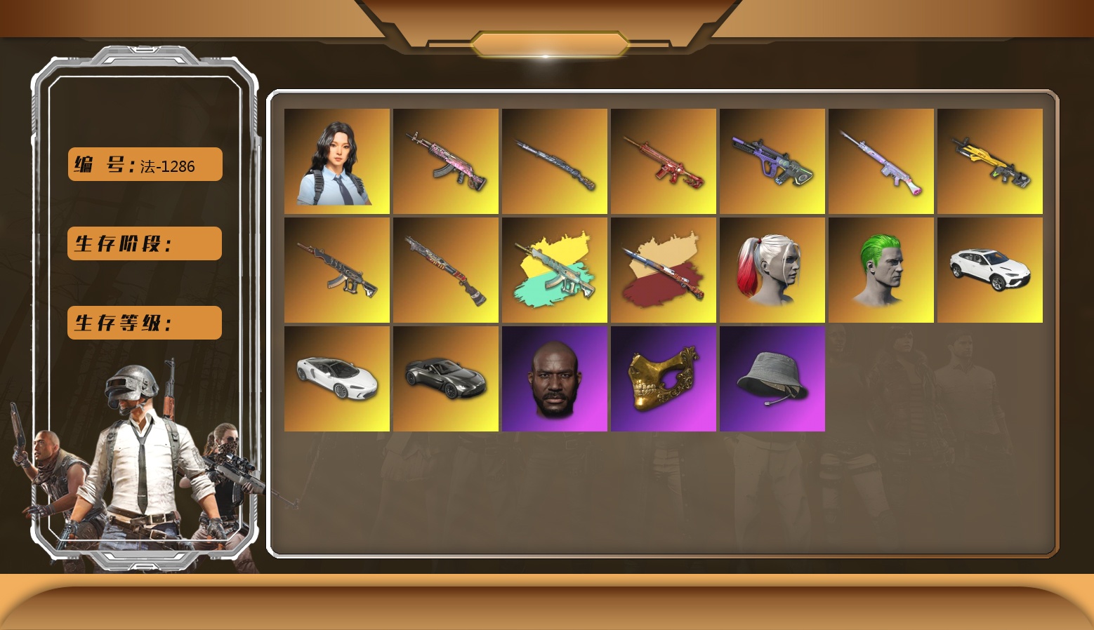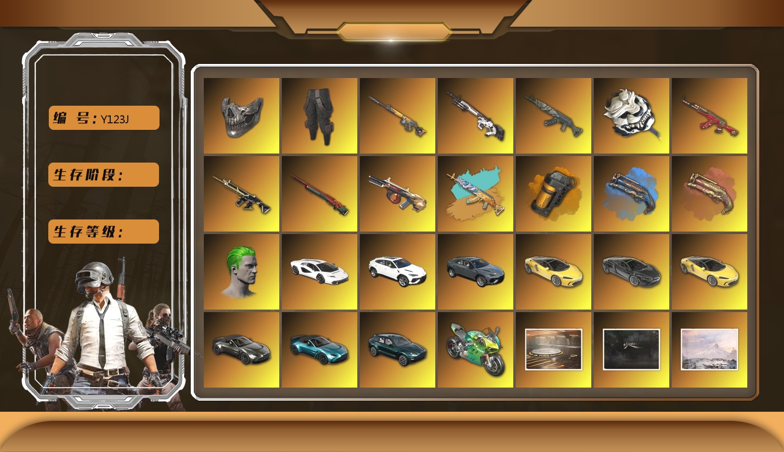 2500级 信誉等级4 齿轮762 8级 霓虹aug 6级 玩偶slr 6级 兔兔mk12 6级 恶魔ace 6级 朱雀m4 5级 猛虎98k 3级 烈日1897 2级 异色猛虎 异色恶魔 异色aug 汉娜 4级 迈凯伦 兰博基尼suv 阿斯顿马丁跑车 丑男丑女双头 2021pgc黄金面具 滑雪眼镜 黑人 渔夫帽 黑盒手套 虎牙夹克 pigff套 电包 惊魂玩偶套