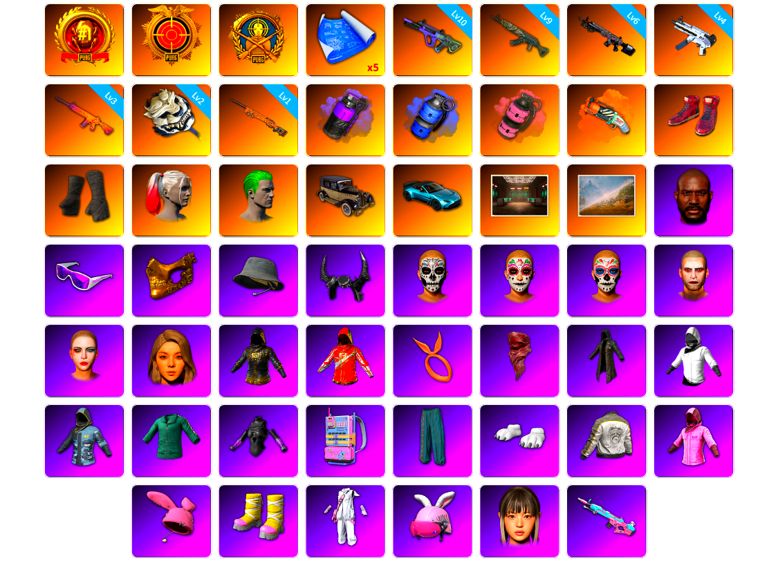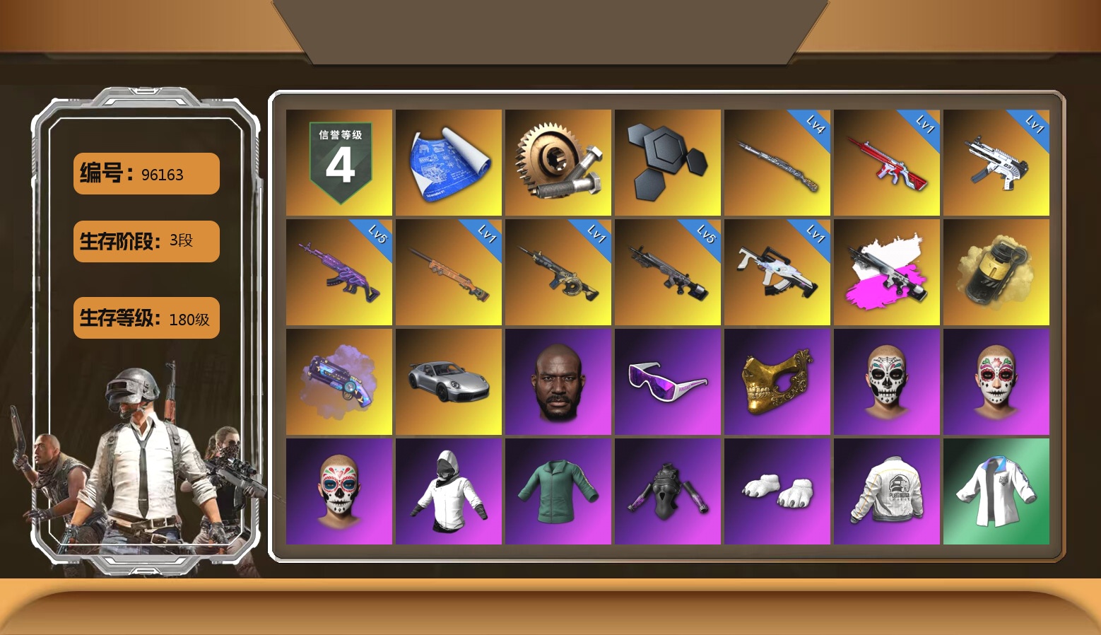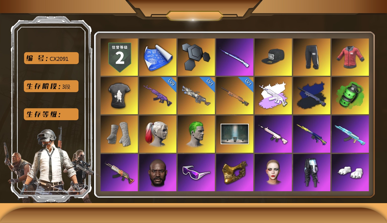 5级瀚娜 5级多利安 18张图纸 G币 19888聚合物 10级火麒麟 10级南瓜M4 10级孙悟空M24 10级美杜莎762 10级弥诺陶洛斯AUG 10级德拉贡 10级妖魔之触ACE 10级霓虹AUG 10级恶魔ACE 8级齿轮炮 8级赛博MK12 6级刻耳柏洛斯M249 6级沙悟净MINI 6级圣诞AK 6级幽影残魂AWM 6级玄武SKS 6级DBS 5级朱雀M4 1级圣诞mini 1级猛虎98k 1级水麒麟 1级彩虹M24 1级青龙762 1级玩偶炮 1级小兔MK12 1级猪八戒M4 1级爆裂AUG 1级无信号M4 1级午夜惊魂98K 1级无重力MP5K 1级魔咒之力Mk12 1级时光加农SKS 1级烈日灼烧-S1897 1级GD-AUG 1级夜曲M24 1级寒蚀MP5K 3级唐三藏平底锅 3级白虎锅 1级塞壬平底锅 火麒麟(异色) 青龙762(异色) 美杜莎(异色) 弥诺陶洛斯AUG(异色) 爆裂AUG(异色) 南瓜M4(异色) 无信号M4(异色) 恶魔ACE(异色) 孙悟空M24(异色) 彩虹M24(异色) 午夜惊魂98K(异色) 德拉贡(异色) 赛博MK12(异色) 小兔MK12(异色) 魔咒Mk12(异色) 圣诞AK(异色) M249(异色) 唐三藏(异色) 塞壬 - 平底锅(异色) 妖魔之触(异色) S1897(异色) GD-AUG(异色) AWM(异色) 天蓝色烟雾弹 珊瑚色烟雾弹 青色烟雾弹 橙色狂怒之雾-M79 黄色狂怒之雾-M79 深红狂怒之雾-M79 蓝色魔法迷雾-M79 柏林鞋 黑绷带 小丑女 小丑男 帕拉梅拉 保时捷911 保时捷卡宴 布加迪跑车 布加迪奢华版跑车 兰博基尼跑车 兰博基尼SUV 兰博基尼奢华版 马丁跑车 马丁敞篷跑车 马丁SUV 杜卡迪极速金 杜卡迪翡翠绿 杜卡迪红 杜卡迪纯净黑 女团大厅 胜利密室 陈列室 兰博大厅 冬季藏匿处 交易所接待室 武器神龛 aespa 黑鬼 滑雪镜 金面 渔夫帽 牛角 丑男妆容 马东锡 内马尔 橙色发带 红面巾 黑大衣 活动绿东 发光手臂 竞猜裤 电磁背包 萨芬裤 明月裤 白熊鞋 小叮当 粉战神 aespa女团 阿狸 尼尔 布朗熊 拉风龙 后街车库 车漆 小马尾 小绿头 丸子头 西游记 脏辫 爱的主打歌 青海摇 小兔学院 悲喜 绷带AK 滑雪帽 PGC 2021套装 胜利之舞39 枪炮洗礼