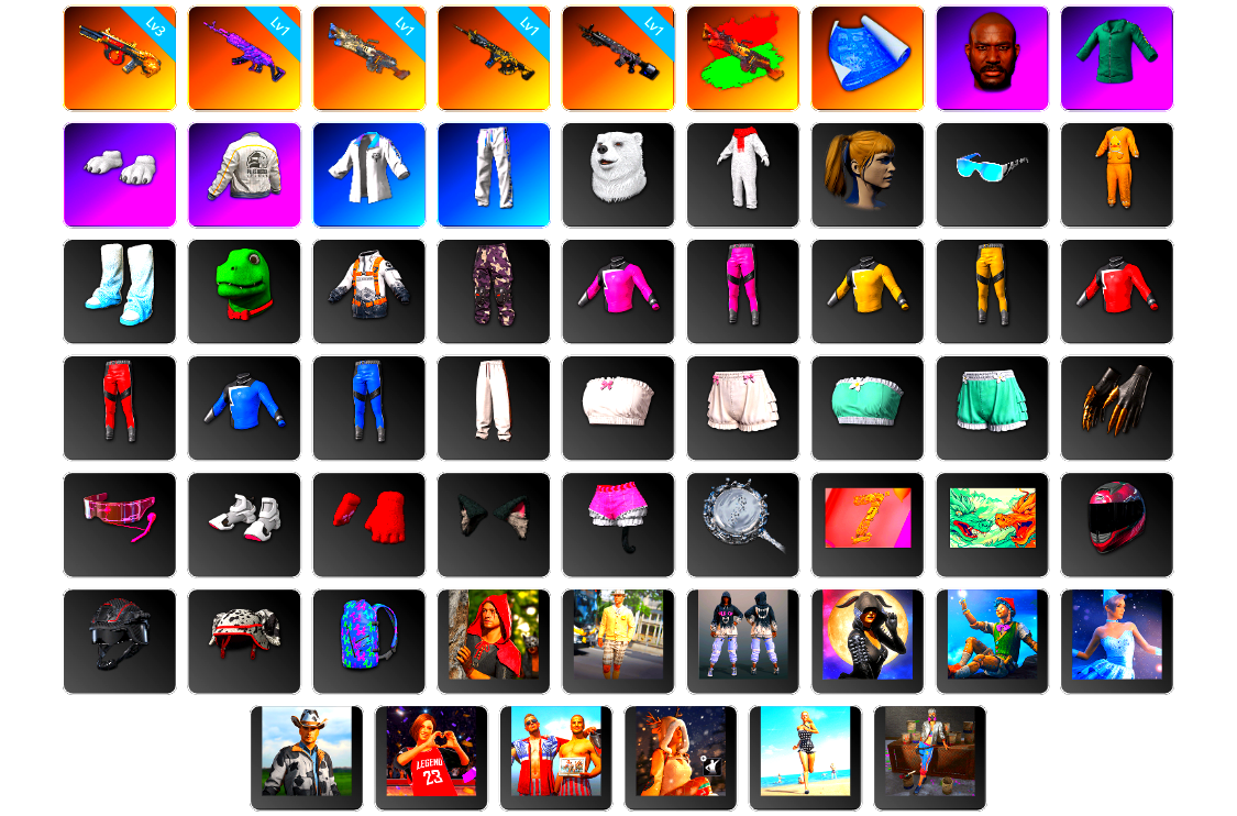 6级寒蚀MP5K 2级美杜莎762 美杜莎(异色) 柏林鞋 女团大厅 交易所接待室 黑鬼 红面巾 黑大衣 黄东 活动绿东 电磁背包 白熊鞋 粉战神 拉风龙 小兔学院 悲喜