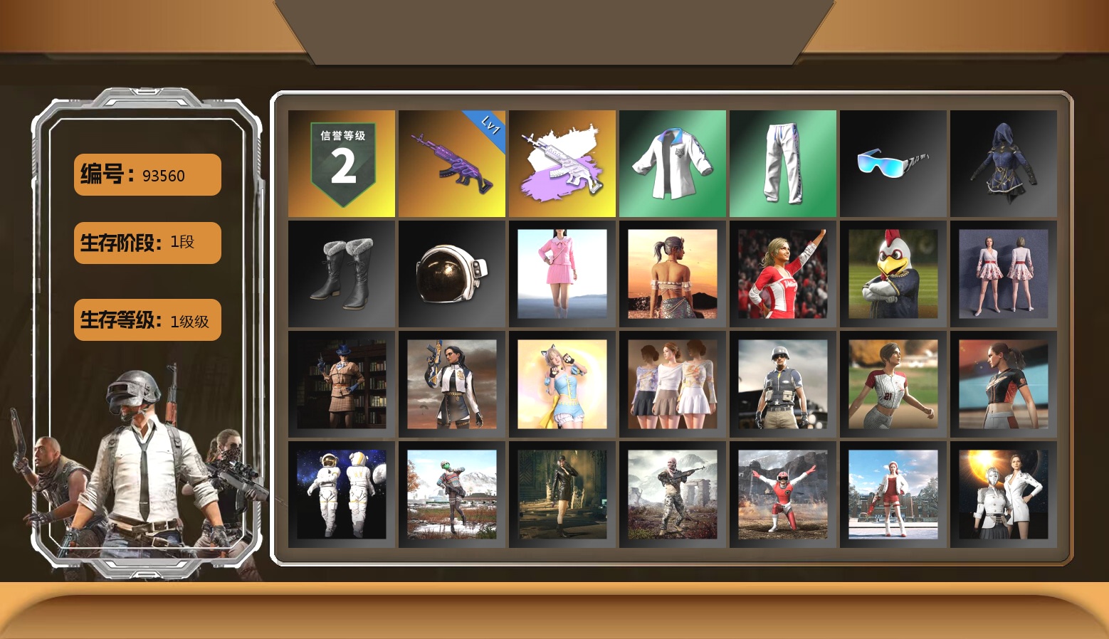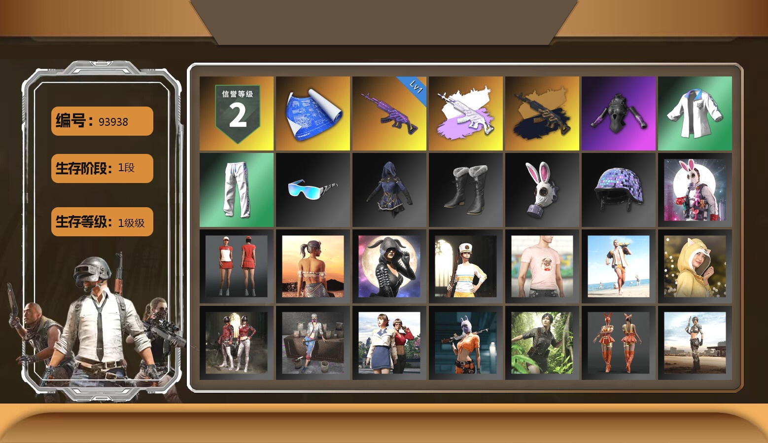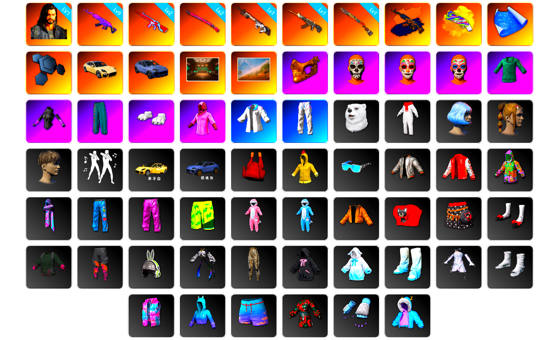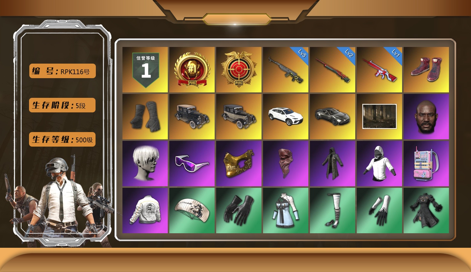 5级玄武SKS 2级孙悟空M24 1级无信号M4 柏林鞋 黑绷带 兰博基尼SUV 马丁跑车 黑鬼 9s发型 滑雪镜 金面 红面巾 黑大衣 白战神 电磁背包 尼尔 拉风龙 车漆 西游记 脏辫 小兔学院 悲喜 滑雪帽