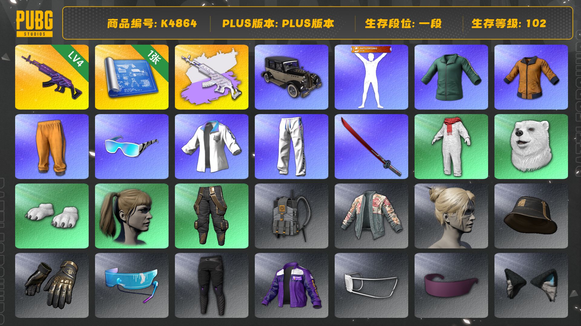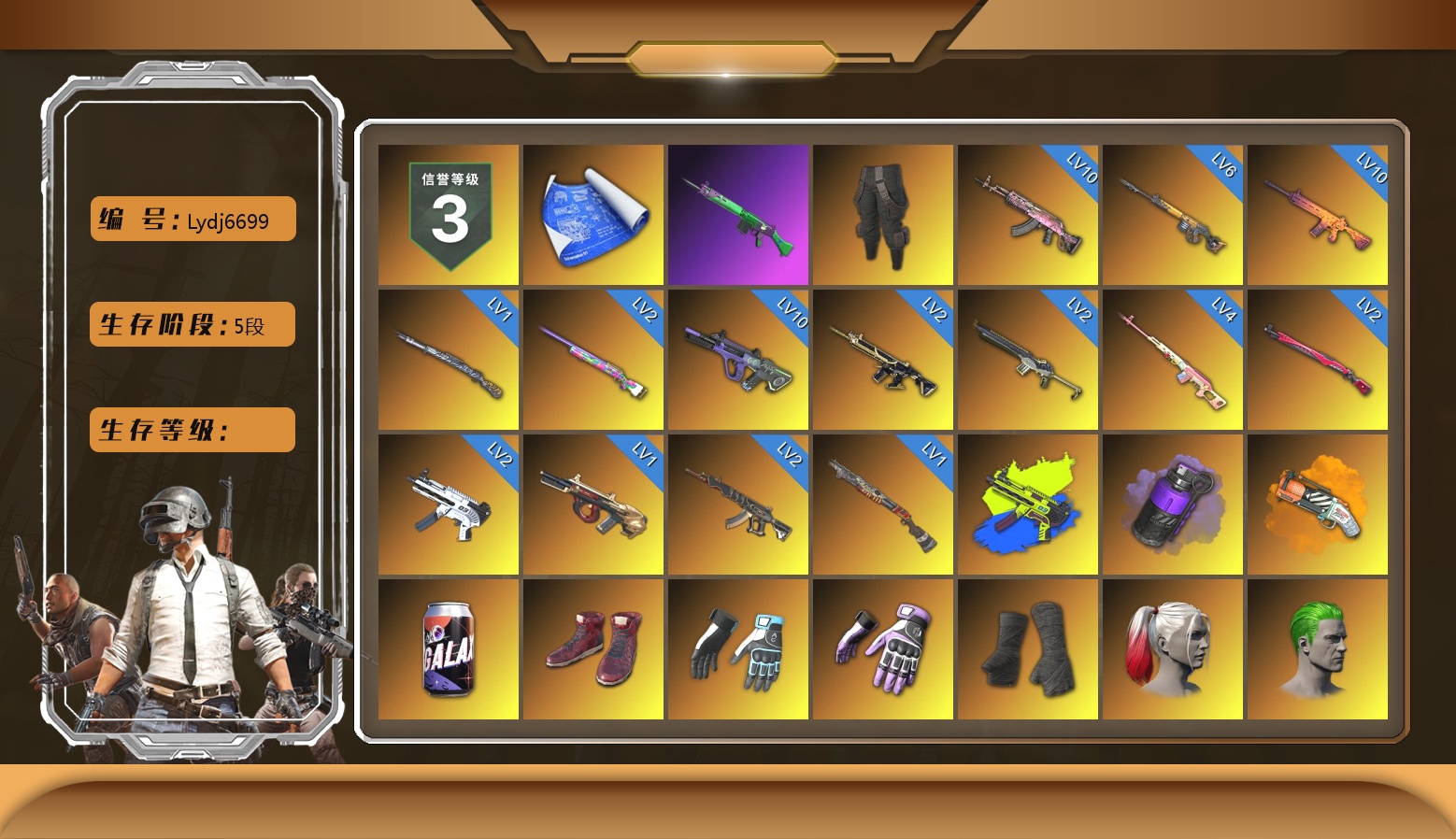 9级青龙762 3级玩偶炮 1级孙悟空M24 青龙762(异色) 青色烟雾弹 黄色狂怒之雾-M79 柏林鞋 小丑女 交易所接待室 6张图纸 5244聚合物 黑鬼 金面 红面巾 黑大衣 粉战神 丸子头 西游记 脏辫 小兔学院 悲喜 绷带AK