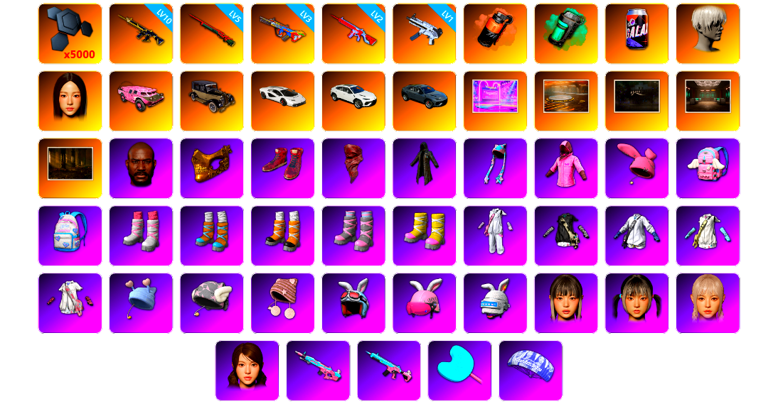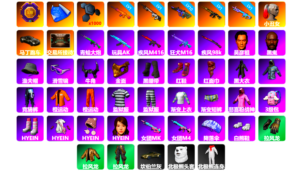 生存5阶段 1张图纸 1000聚合物 1级南瓜M4 1级赛博MK12 10级霓虹AUG 1级猪八戒M4 1级魔咒之力Mk12 小丑女 马丁跑车 交易所接待室 青蛙大炮 玩具AK 黑鬼 渔夫帽 滑雪镜 牛角 金面 黑绷带 柏林鞋 红面巾 黑大衣 小战神 竞猜裤 橙运动 监狱服 渐变装 粉战神 白熊鞋 拉风龙