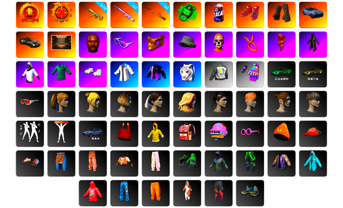 新到6xxx 金标 10级火麒麟 10级霓虹 10级朱雀 9级 98k 7级赛博 彩虹 2张图纸 迈凯伦 双头 黑鬼 康萨斯 金面 小黑盒 发光手臂 电磁背包 白熊鞋 橙运动 小叮当 小黄鸭 拉风龙 悲喜