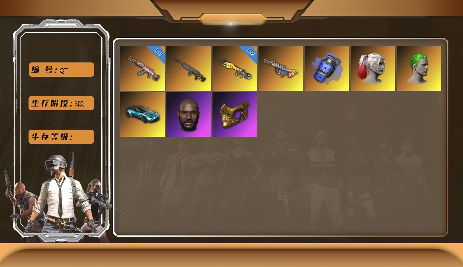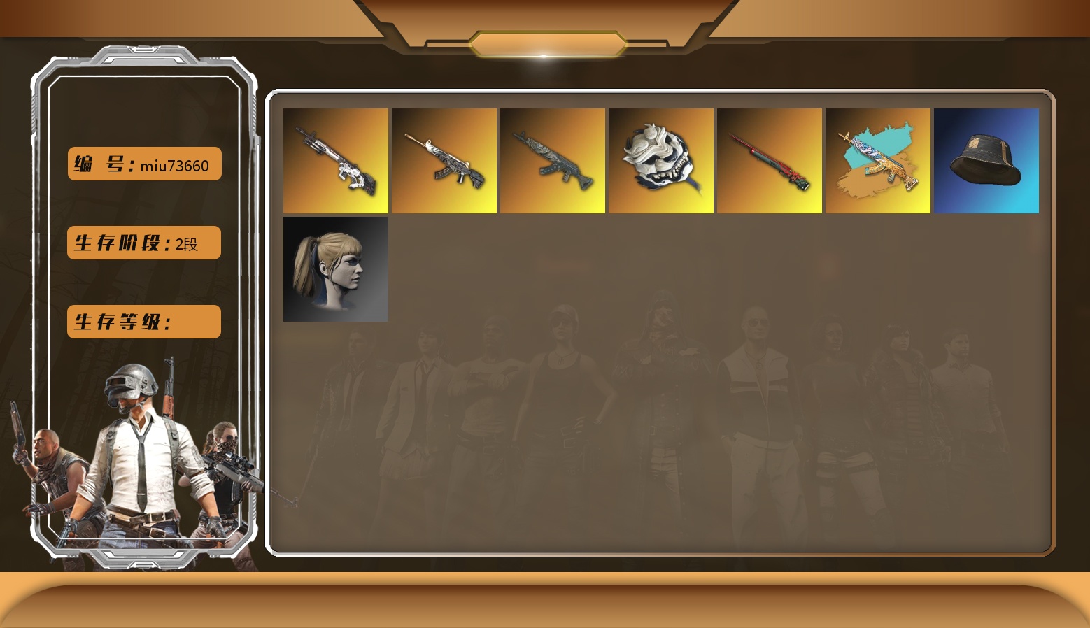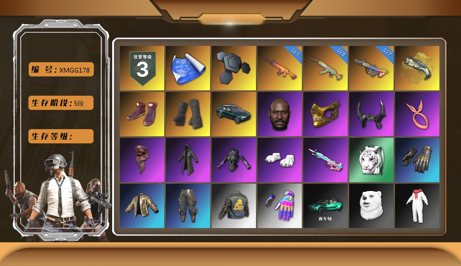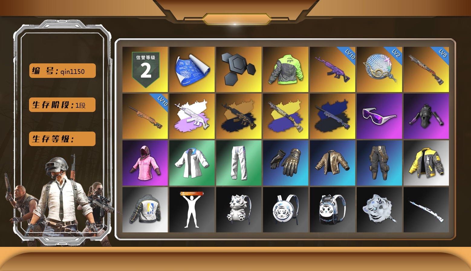 信誉等级三 8级水麒麟 7级爆裂AUG 级南瓜M4 乳白狂怒之雾-M79 马丁SUV 1张图纸 1913聚合物 黑鬼 牛角 金面 黑绷带 柏林鞋 橙色发带 红面巾 黑大衣 发光手臂 白熊鞋 拉风龙 小马尾 脏辫 小兔学院 绷带AK 西游记