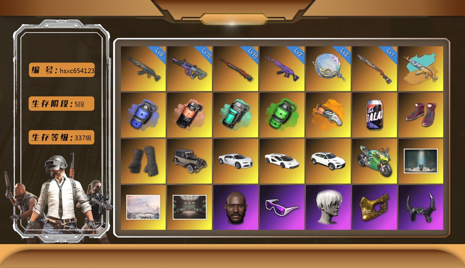 ID[238233][T12185]10级爆裂AUG 10级德拉贡 10级无信号M4 10级午夜惊魂98K 9级彩虹M24 6级圣诞AK 爆裂AUG(异色) 无信号M4(异色) 彩虹M24(异色) 午夜惊魂98K(异色) 德拉贡(异色) 圣诞AK(异色) 青色烟雾弹 品红色烟雾弹 紫色魔法迷雾-M79 蓝色魔法迷雾-M79 黑绷带 保时捷卡宴 兰博基尼跑车 兰博基尼SUV 兰博基尼奢华版 杜卡迪纯净黑 女团大厅 兰博大厅 MINJI 金面 渔夫帽 白战神 发光手臂 萨芬裤 白熊鞋 2024女团 尼尔 拉风龙 车漆 小马尾 丸子头 西游记 脏辫 小兔学院 绷带AK 枪炮洗礼