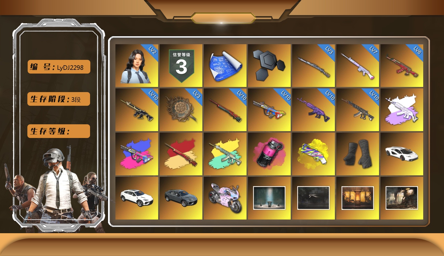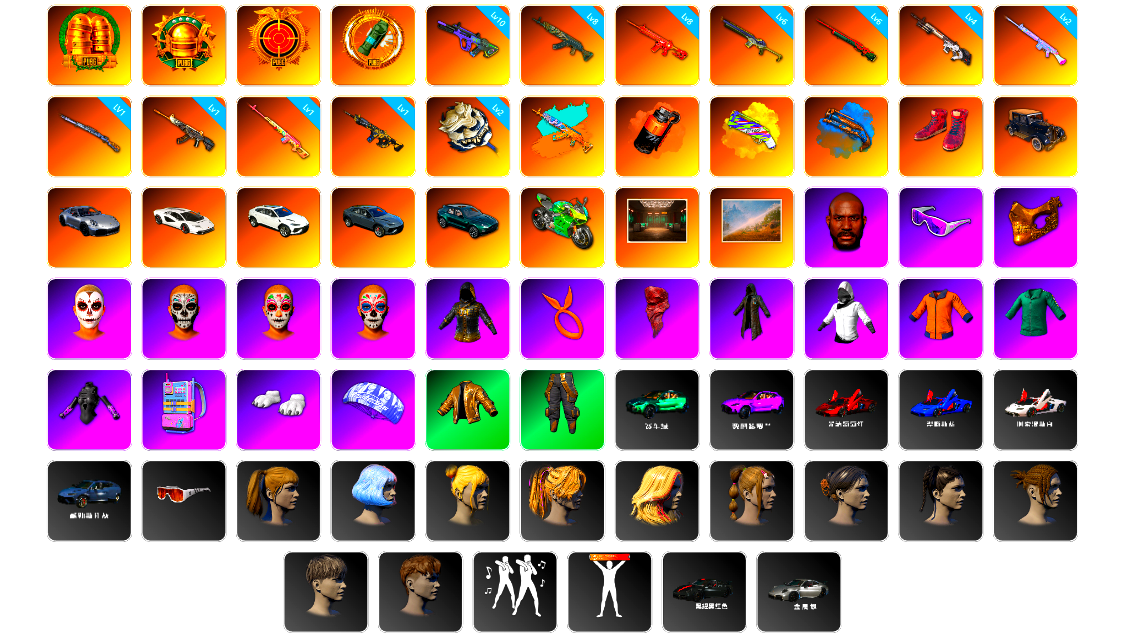 10级猪八戒M4 10级孙悟空M24 10级爆裂AUG 10级美杜莎762 10级妖魔之触ACE 7级玩偶炮 6级圣诞AK 3级猛虎98k 3级唐三藏平底锅 2级瀚娜 美杜莎(异色) 爆裂AUG(异色) 孙悟空M24(异色) 妖魔之触(异色) 品红色烟雾弹 黄色狂怒之雾-M79 黑绷带 兰博基尼跑车 兰博基尼SUV 兰博基尼奢华版 杜卡迪暮光粉 胜利密室 兰博大厅 武器神龛 11张图纸 9098聚合物 黑鬼 MINJI 金面 渔夫帽 发光手臂 2024女团 aespa女团 阿狸 拉风龙 小马尾 丸子头 西游记 脏辫 小兔学院
