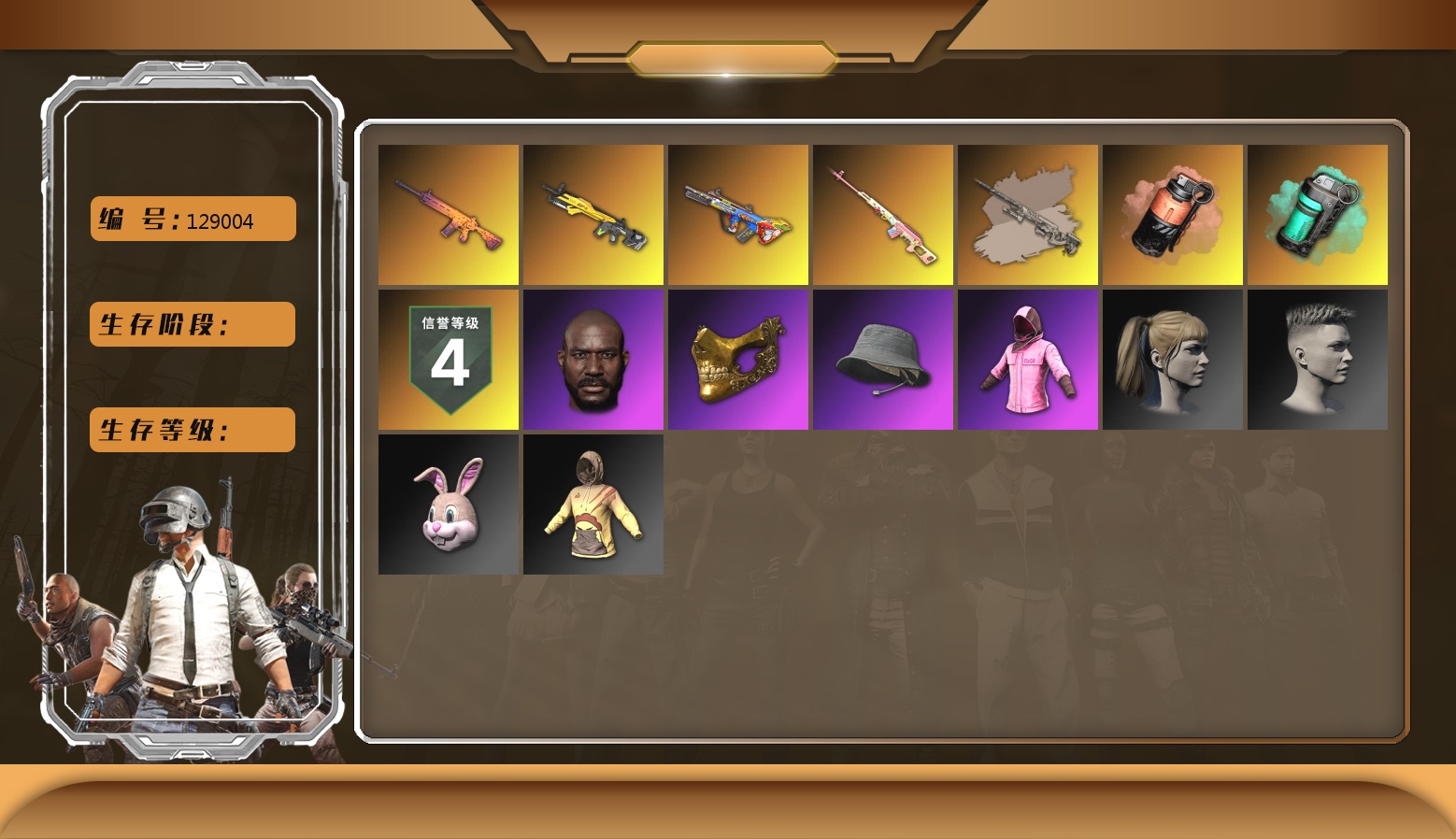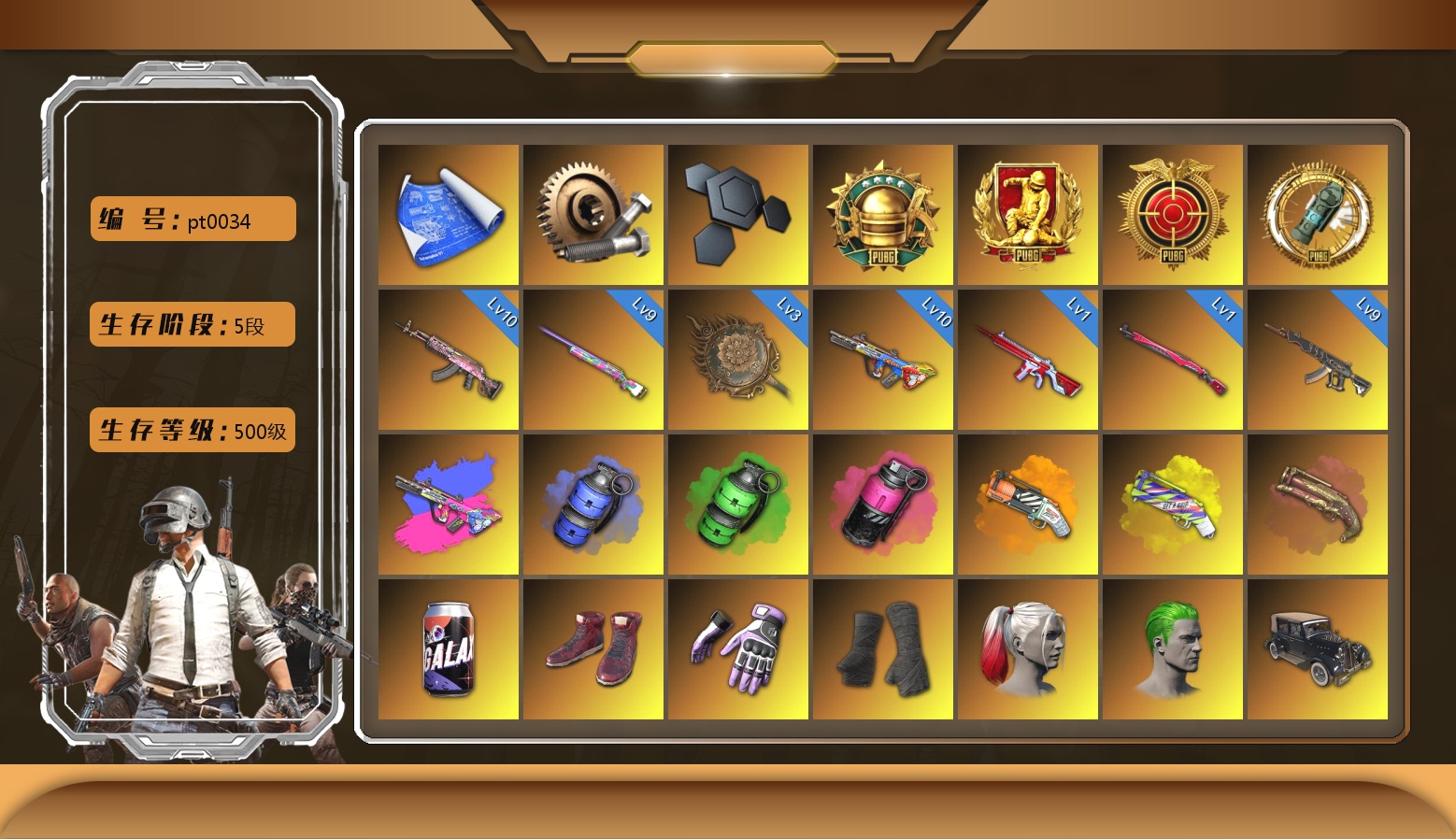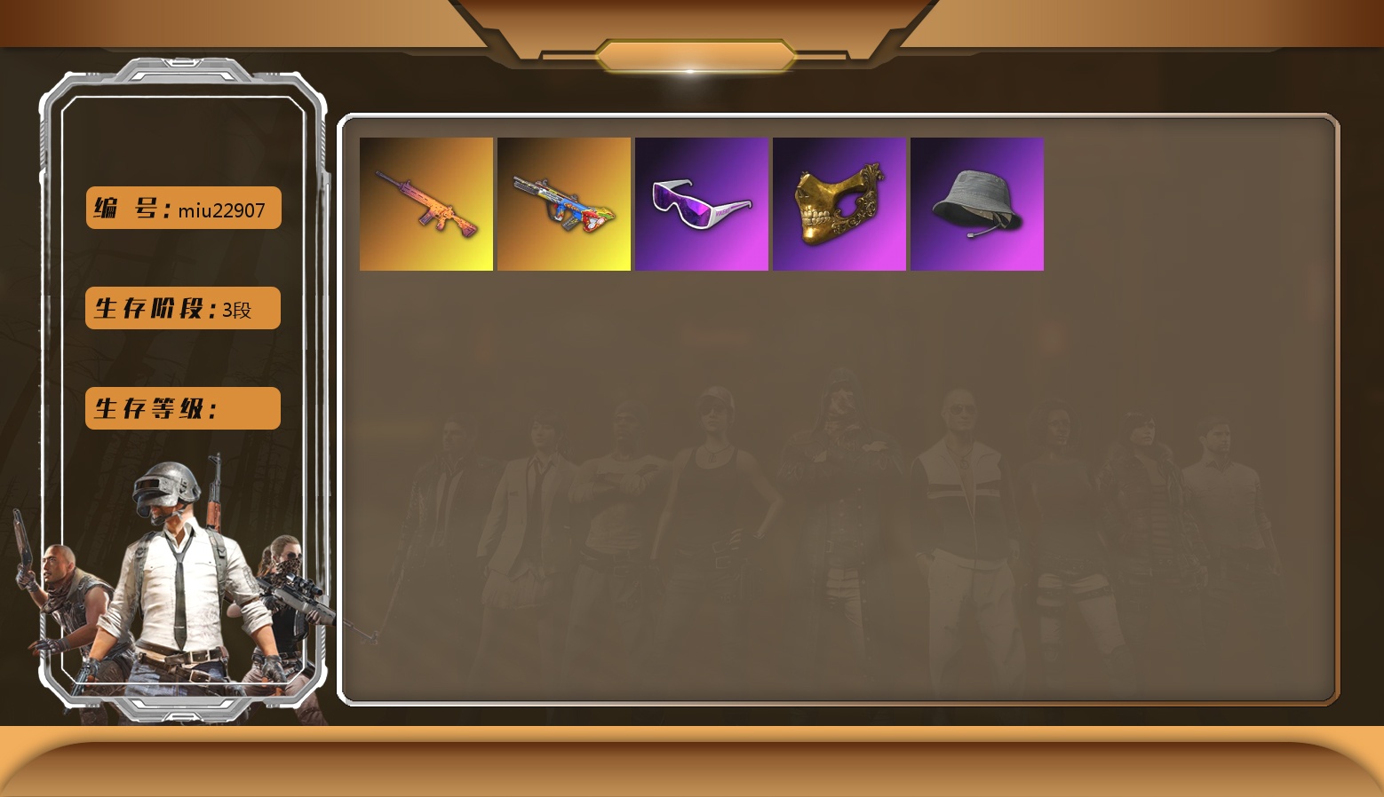 6级爆裂AUG 5级无重力MP5K 1级无信号M4 柏林鞋 交易所接待室 3张图纸 5672聚合物 黑鬼 红面巾 黑大衣 活动绿东 白熊鞋 粉战神 阿狸 拉风龙 小马尾 小兔学院 悲喜 胜利之舞39