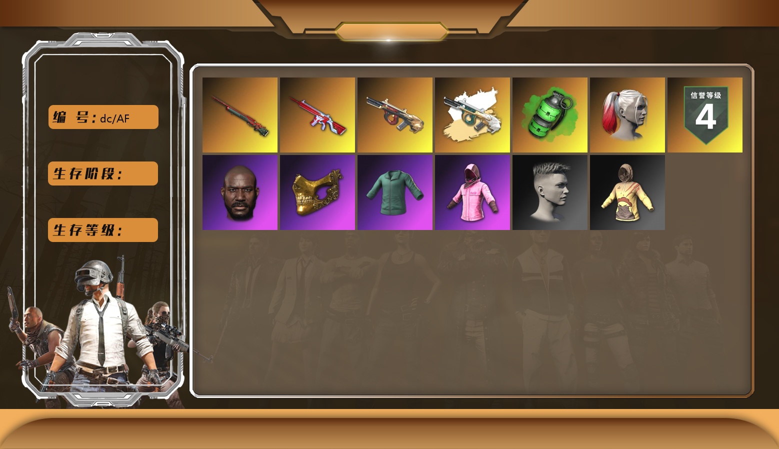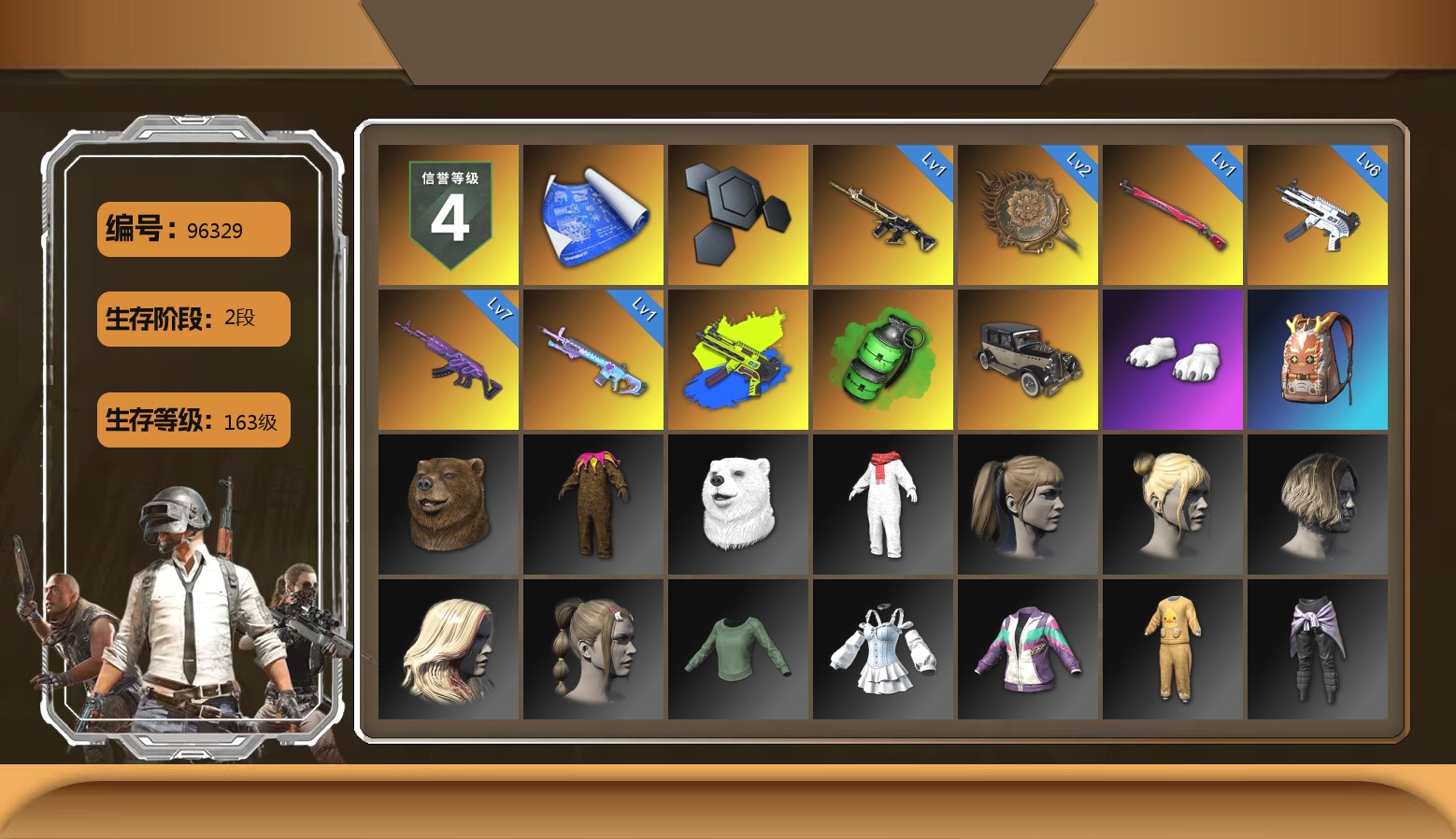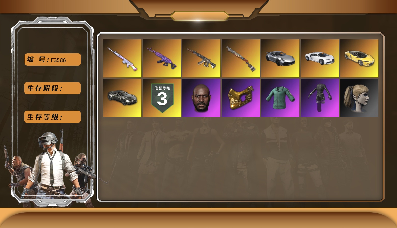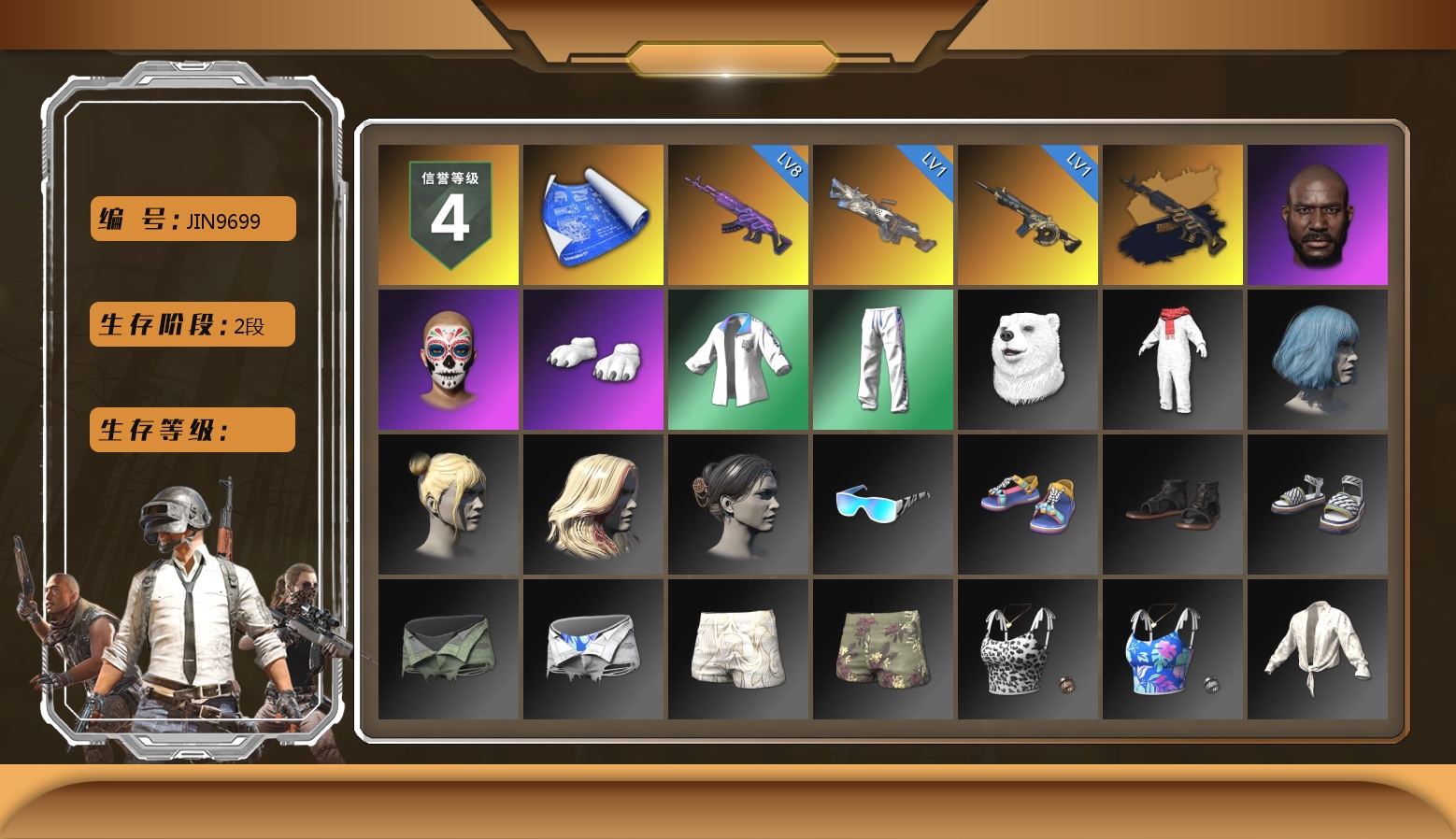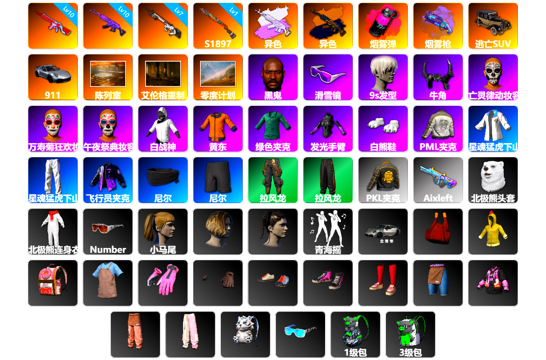 10级火麒麟 7级暗影之主Mk12 6级弥诺陶洛斯AUG 1级多利安 1级时空使者M4 弥诺陶洛斯AUG(异色) 蓝色烟雾弹 橙色狂怒之雾-M79 柏林鞋 黑绷带 保时捷911 布加迪跑车 兰博基尼SUV 交易所接待室 4张图纸 黑鬼 滑雪镜 金面 牛角 橙色发带 红面巾 黑大衣 白战神 活动绿东 发光手臂 白熊鞋 滑雪帽 阿狸 小黄鸭 拉风龙 小马尾 丸子头 脏辫 青海摇 小兔学院