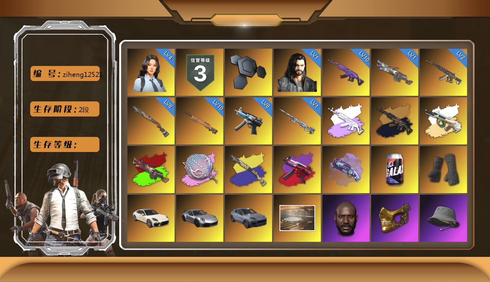 10级美杜莎762 10级夜曲M24 6级烈日灼烧-S1897 6级寒蚀MP5K 4级瀚娜 2级妖魔之触ACE 1级多利安 1级刻耳柏洛斯M249 1级幽影残魂AWM 美杜莎(异色) 弥诺陶洛斯AUG(异色) M249(异色) 塞壬 - 平底锅(异色) S1897(异色) 寒蚀MP5K(异色) 紫色魔法迷雾-M79 黑绷带 帕拉梅拉 保时捷911 保时捷卡宴 陈列室 15182聚合物 黑鬼 金面 渔夫帽 牛角 马东锡 橙色发带 活动绿东 发光手臂 白熊鞋 拉风龙 小马尾 丸子头 青海摇 小兔学院 绷带AK 西游记 PGC 2021套装