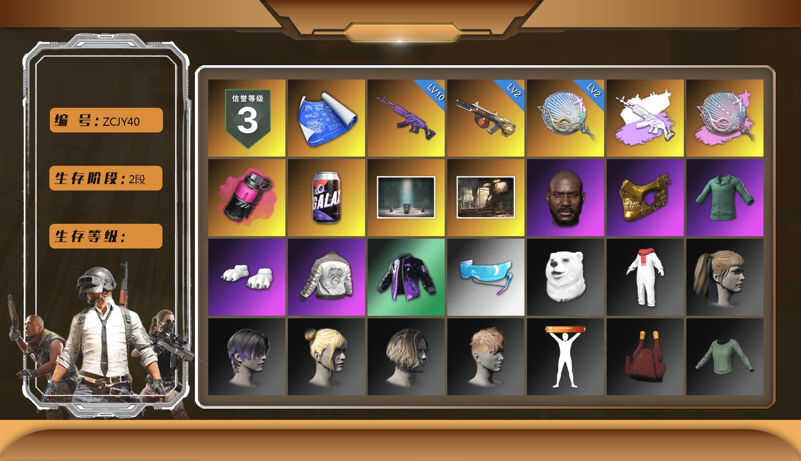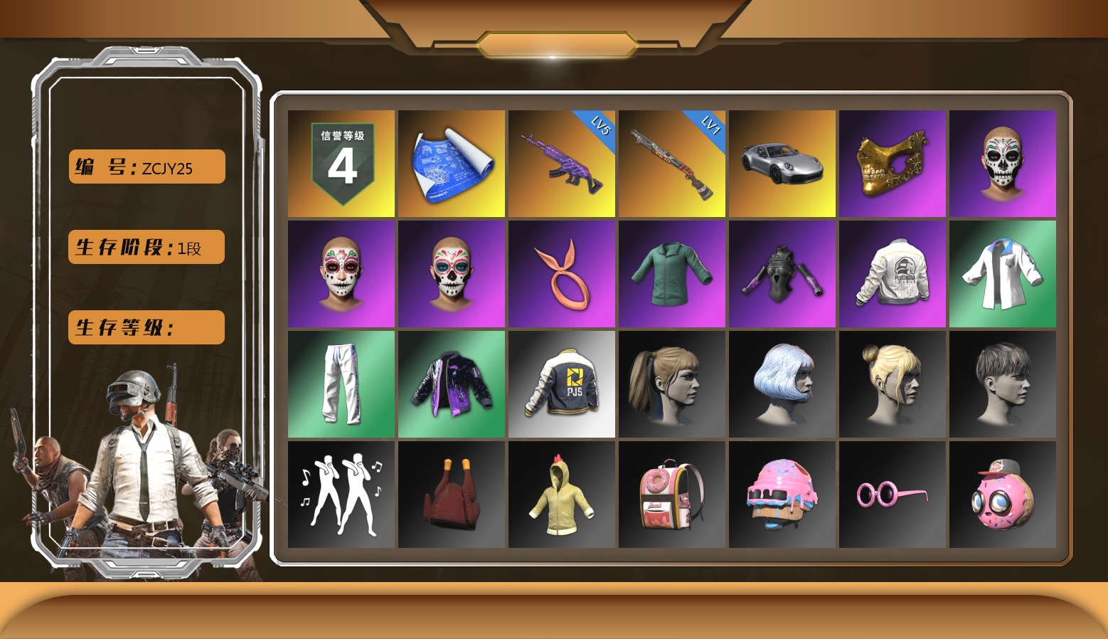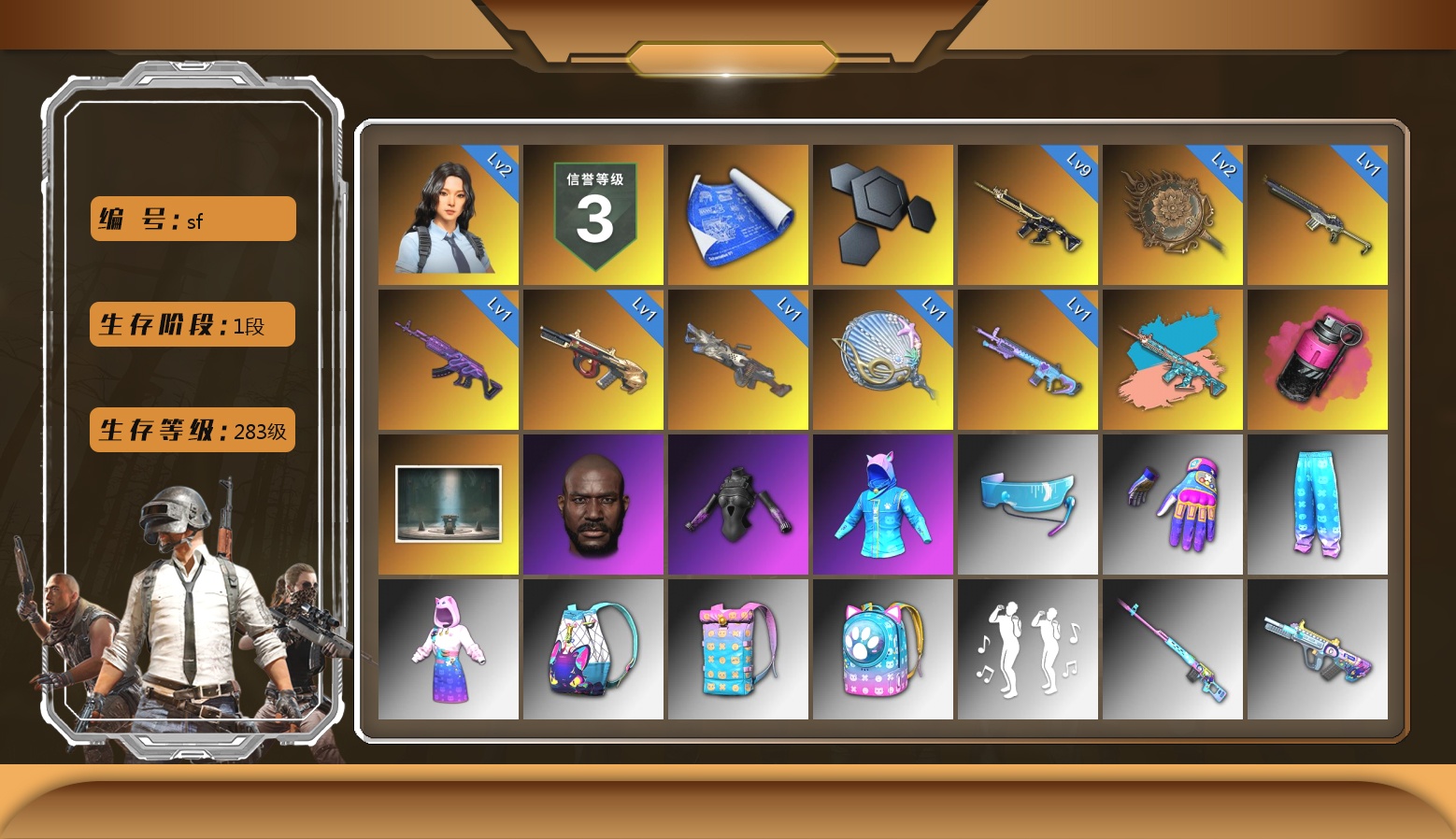 5级弥诺陶洛斯AUG 2级白虎锅 1级沙悟净MINI 1级孙悟空M24 1级午夜惊魂98K 10476聚合物 柏林鞋 黑绷带 保时捷卡宴 交易所接待室 滑雪镜 金面 橙色发带 红面巾 黑大衣 白战神 黄东 活动绿东 发光手臂 电磁背包 粉战神 拉风龙 小马尾 丸子头 脏辫 青海摇 小兔学院 悲喜 西游记 绷带AK 枪炮洗礼