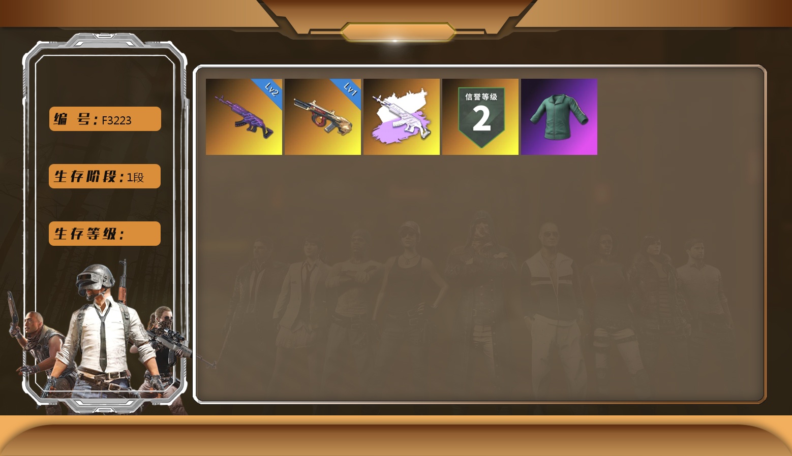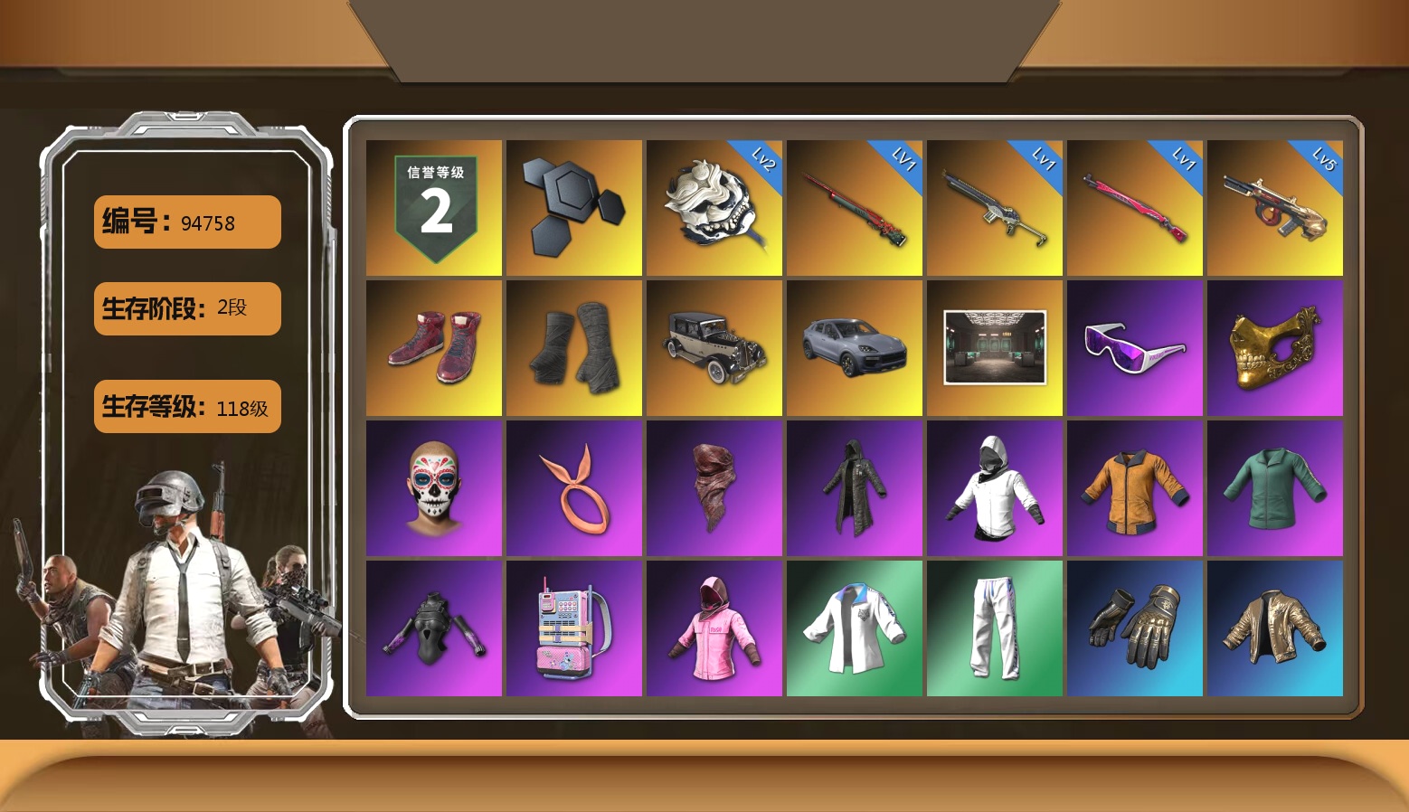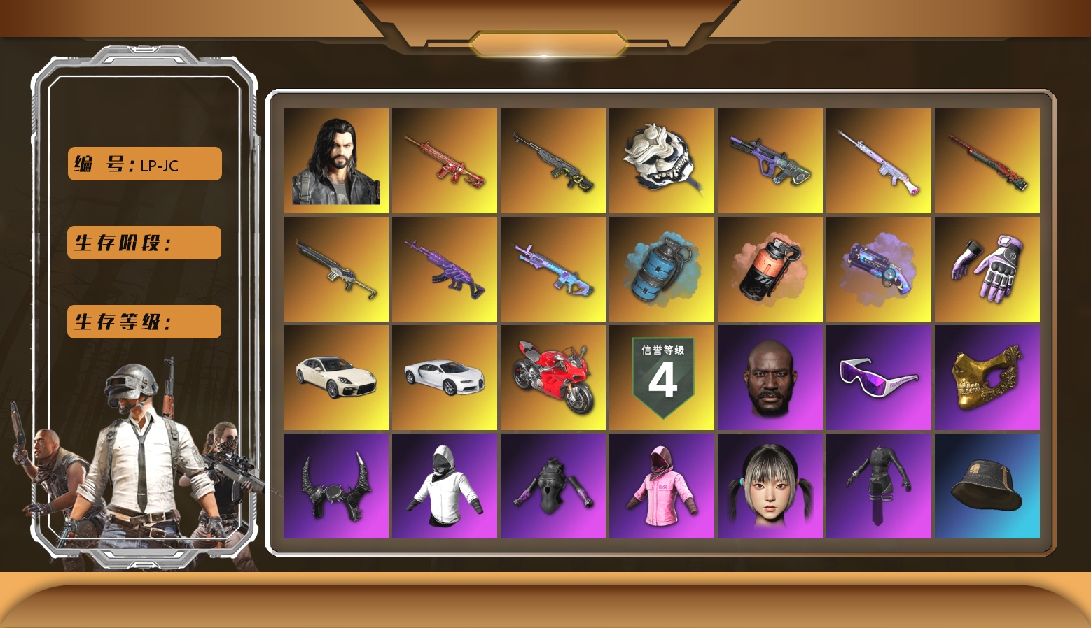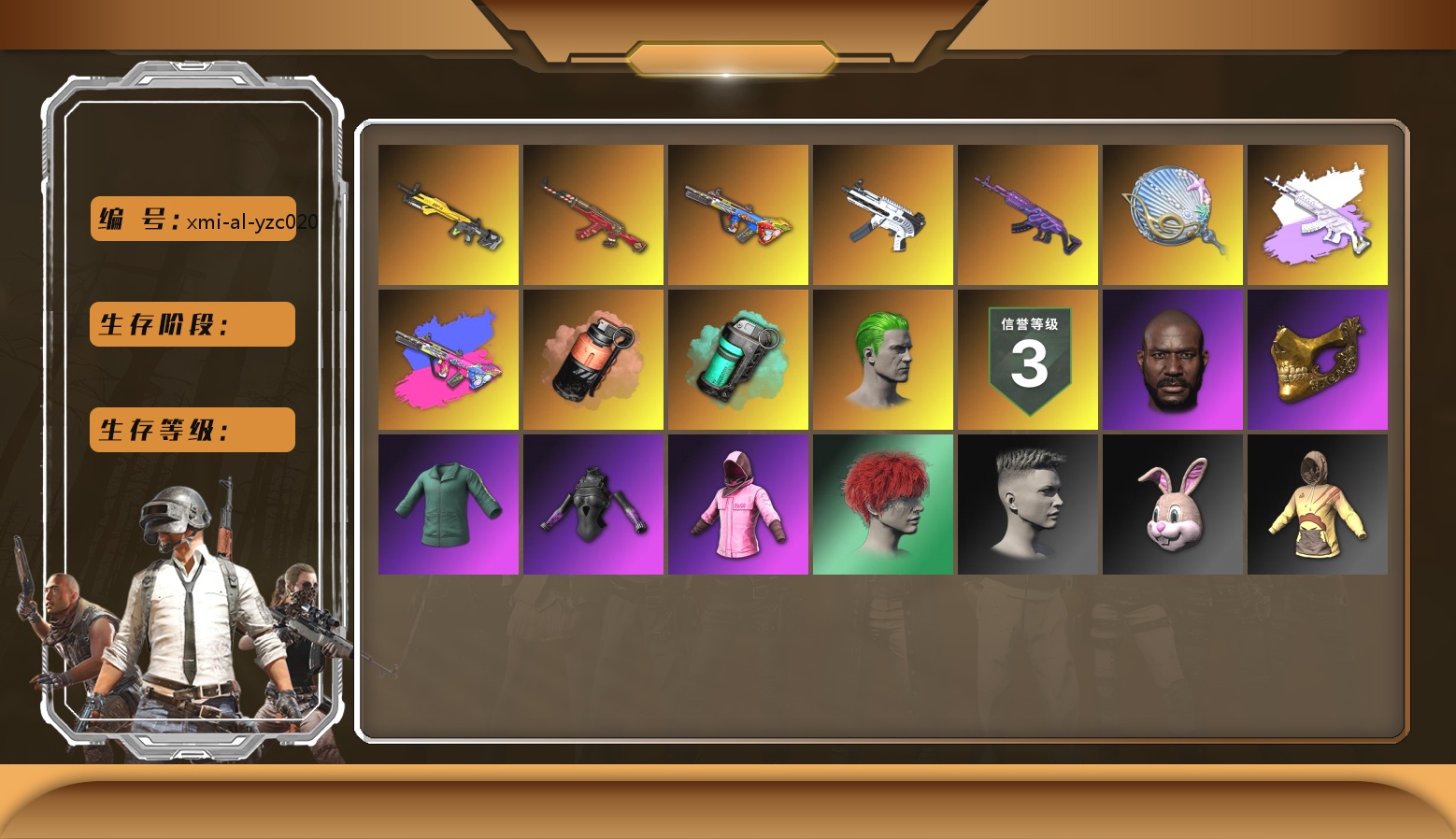 5级弥诺陶洛斯AUG 2级白虎锅 1级沙悟净MINI 1级孙悟空M24 1级午夜惊魂98K 10476聚合物 柏林鞋 黑绷带 保时捷卡宴 交易所接待室 滑雪镜 金面 橙色发带 红面巾 黑大衣 白战神 黄东 活动绿东 发光手臂 电磁背包 粉战神 拉风龙 小马尾 丸子头 脏辫 青海摇 小兔学院 悲喜 西游记 绷带AK 枪炮洗礼